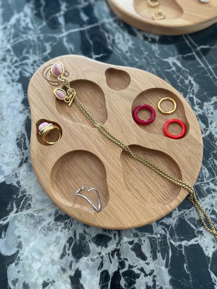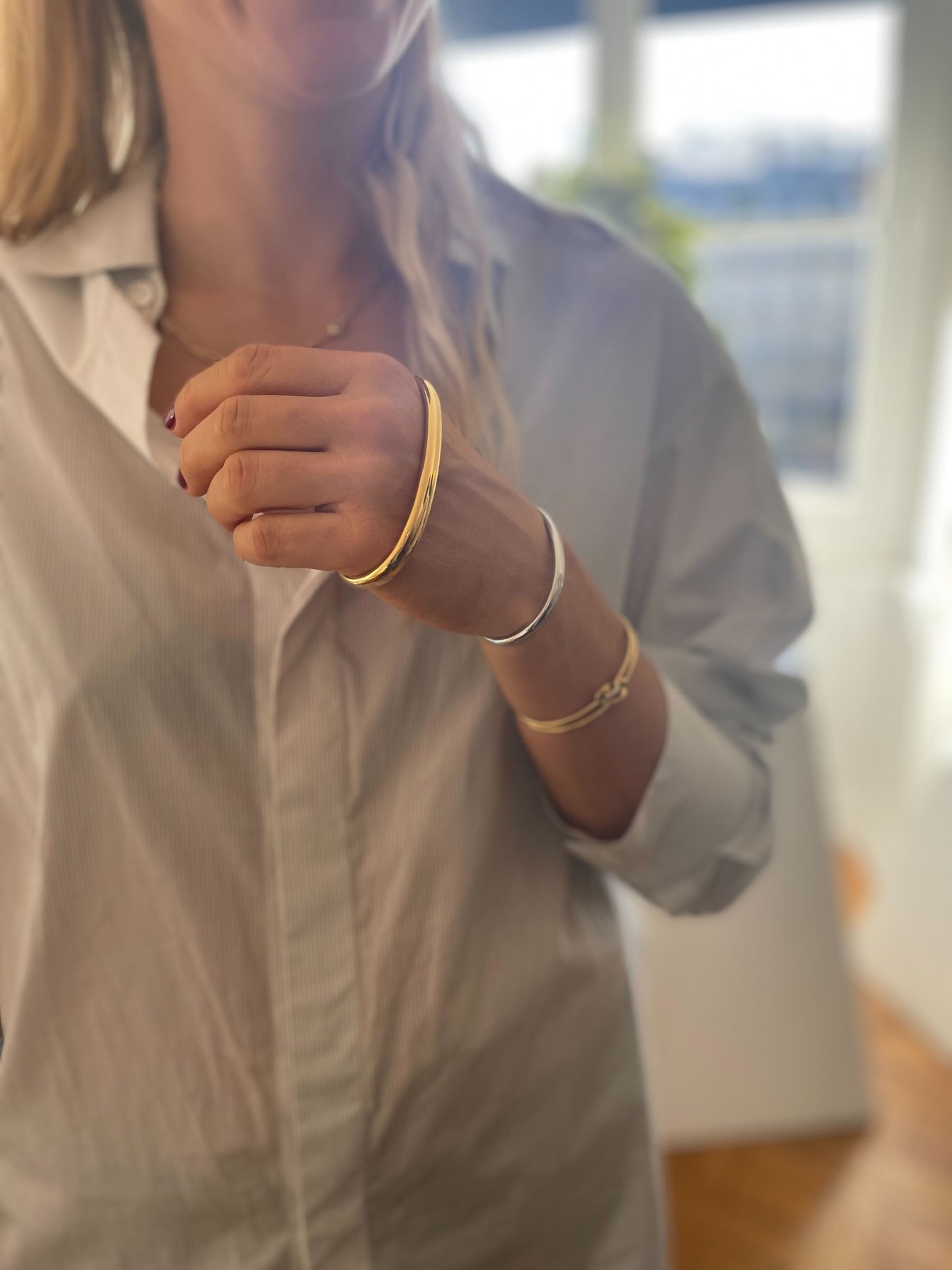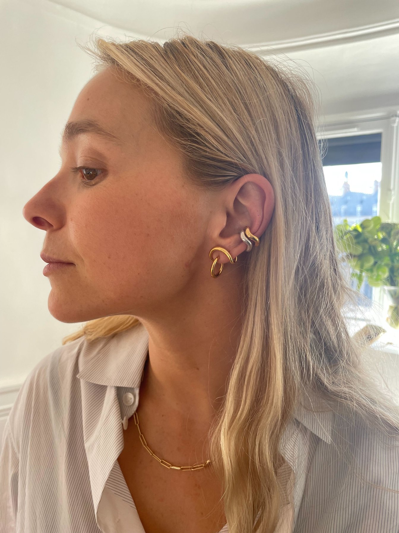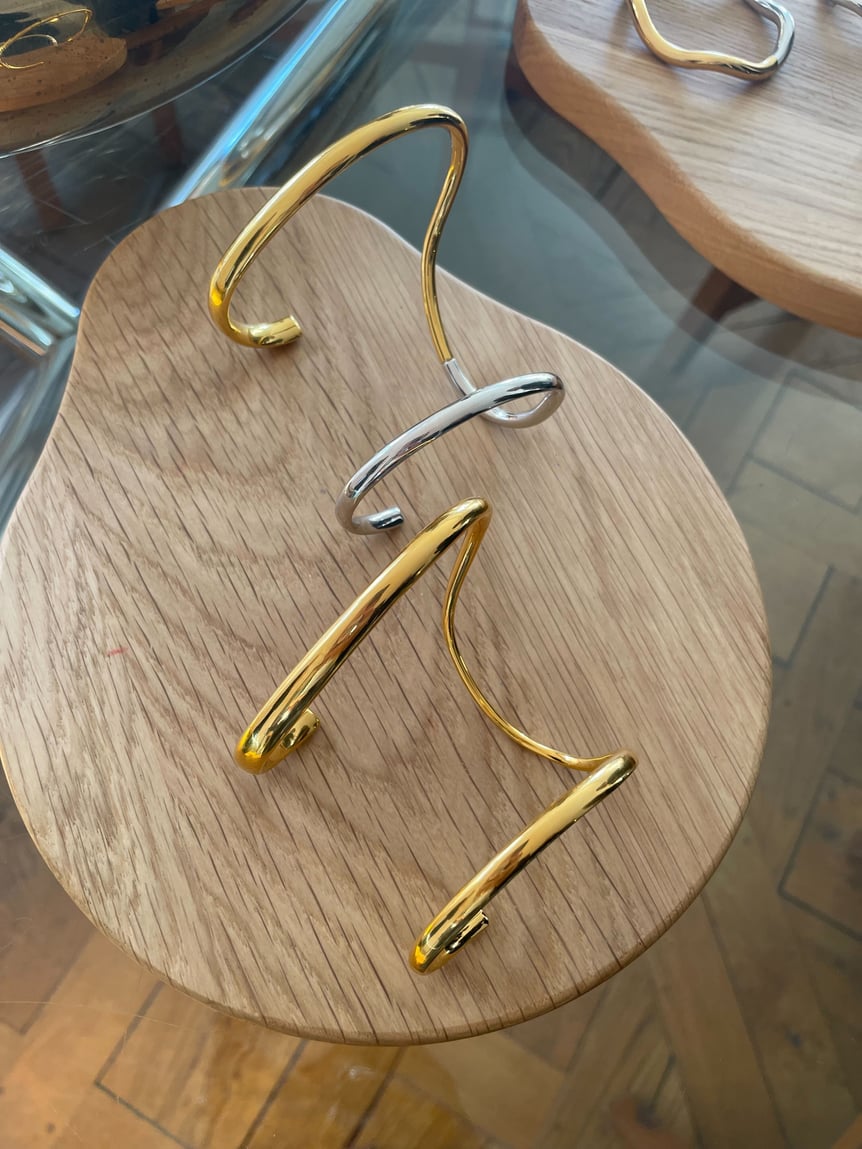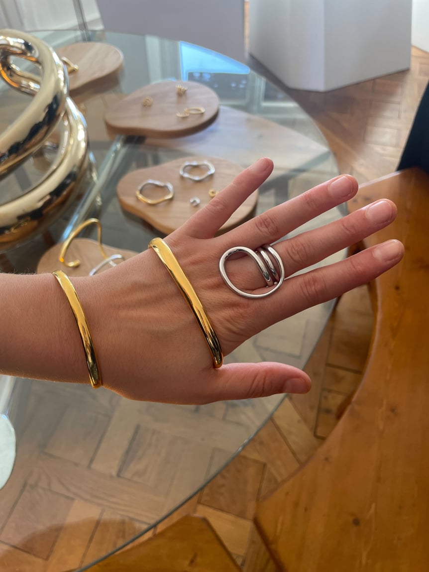 デザイナーのシャルロットのお気に入りはこちら。イヤリングの3連付けと、手の甲に食い込むように身につけるデザインのバングルをつけて見せてくれました。