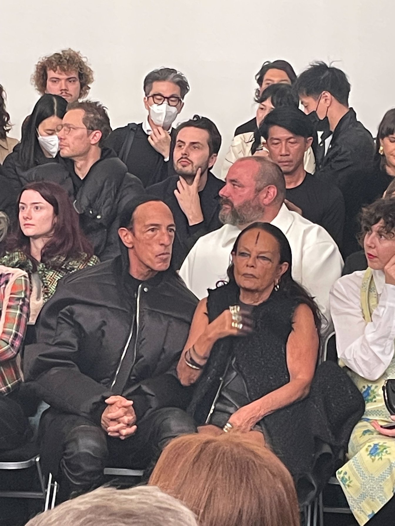 「コム デ ギャルソン(COMME des GARÇONS)」のショー会場に人だかりが。フラッシュの先には、前日にショーを終えたばかりのリック・オウエンス(Rick Owens)夫妻の姿がありました。フロントロウでも存在感大です。ギャルソンのショーはデザイナーが観に来ることが多く、今回はシモーン・ロシャ(Simone Rocha)や「アンダーカバー(UNDERCOVER)」の高橋盾さんの姿も。