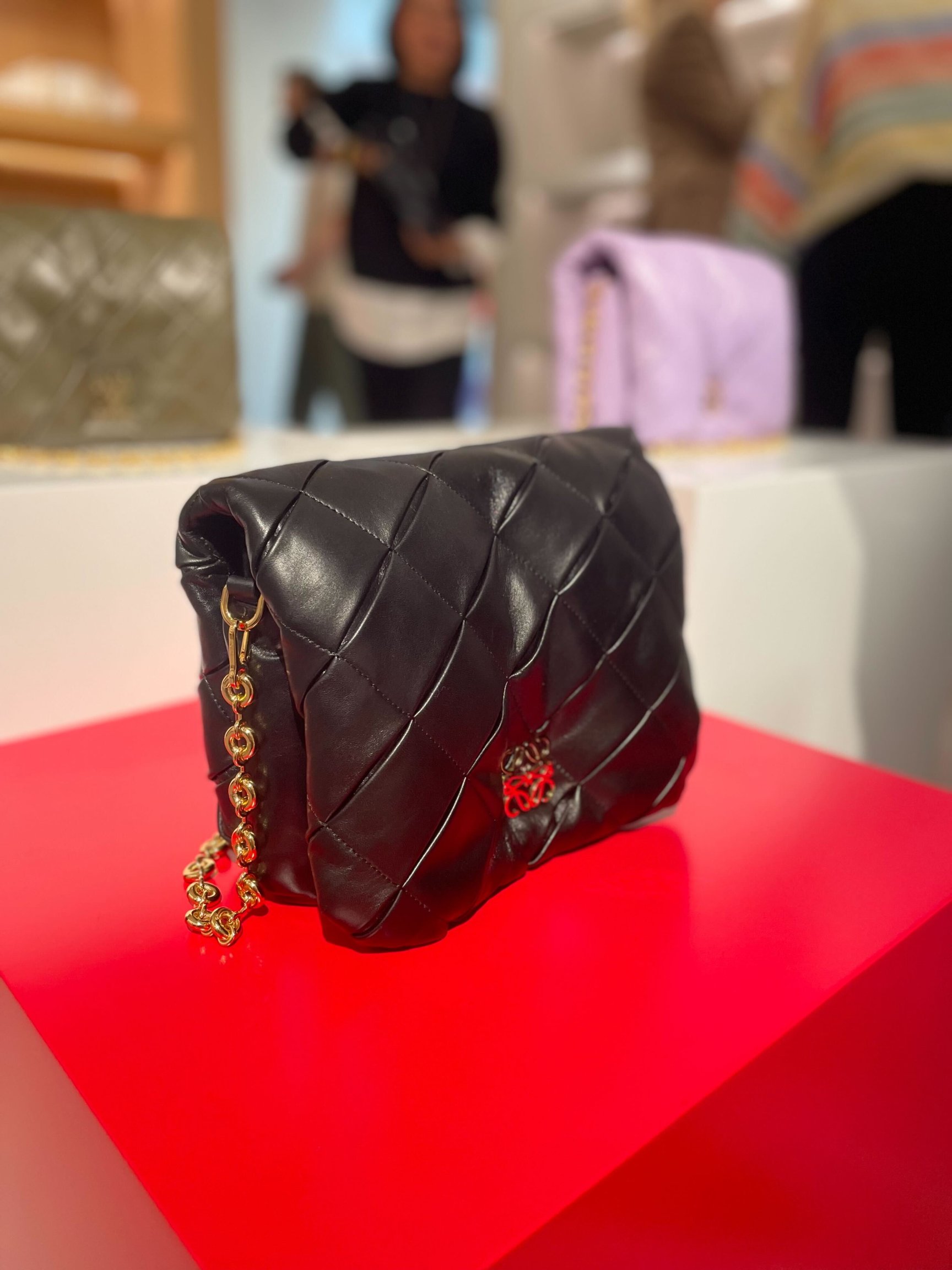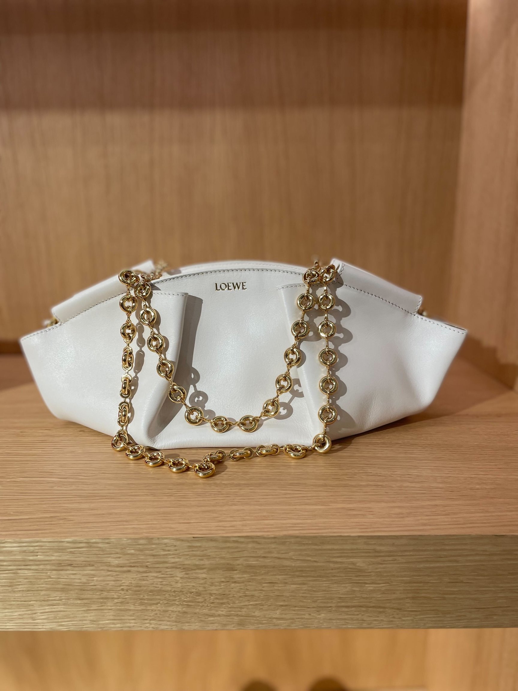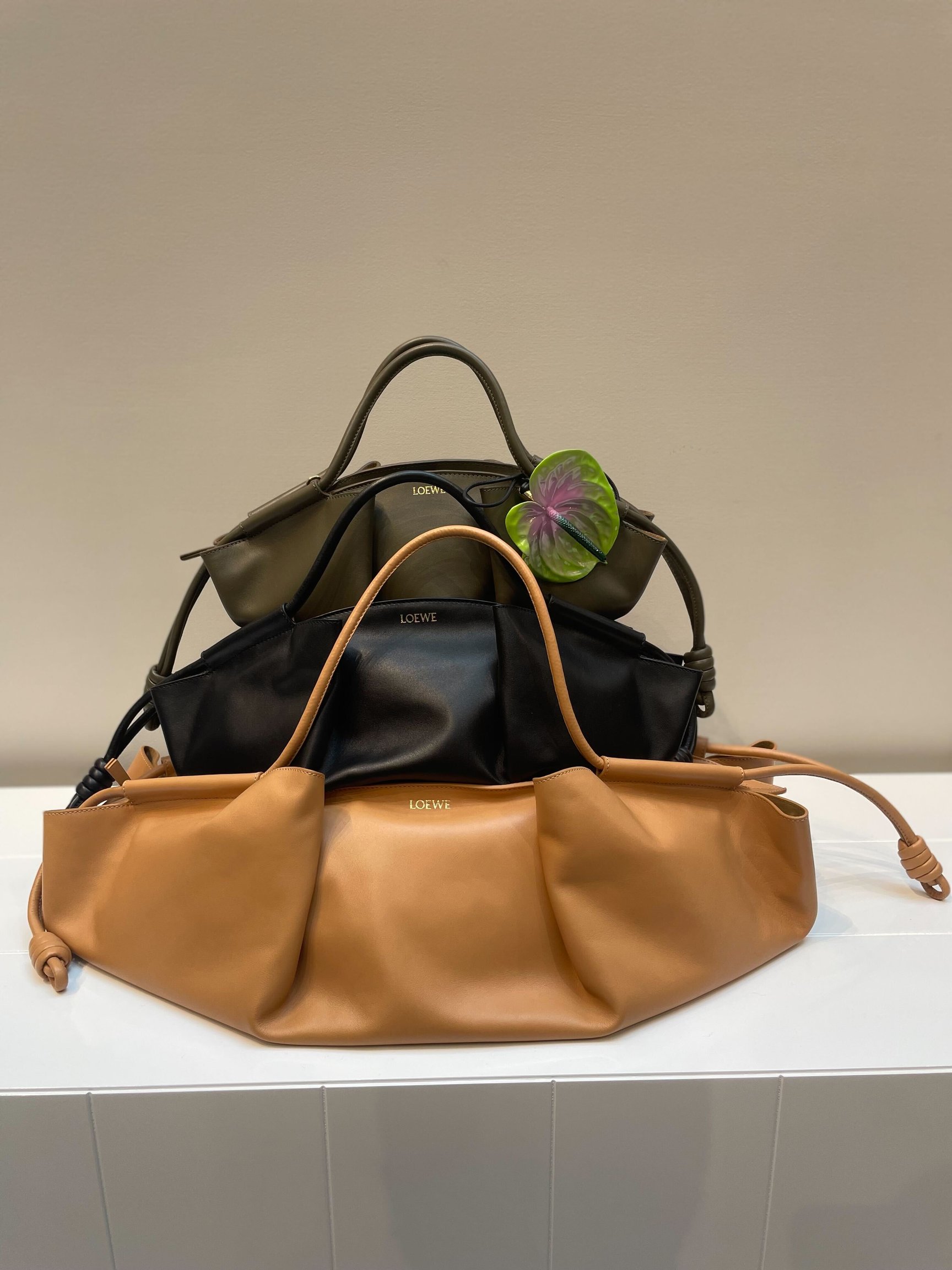 ランウェイに登場したばかりの「ロエベ(LOEWE)」のアイテムをRe-see(展示会)でチェック。今シーズンの注目は、横長で両端のノットがポイントの「パセオバッグ」。レザーにタックを寄せた立体感が、まるで餃子のようです。大中小と3種のサイズ展開で、新たなアイコンバッグとなりそう。