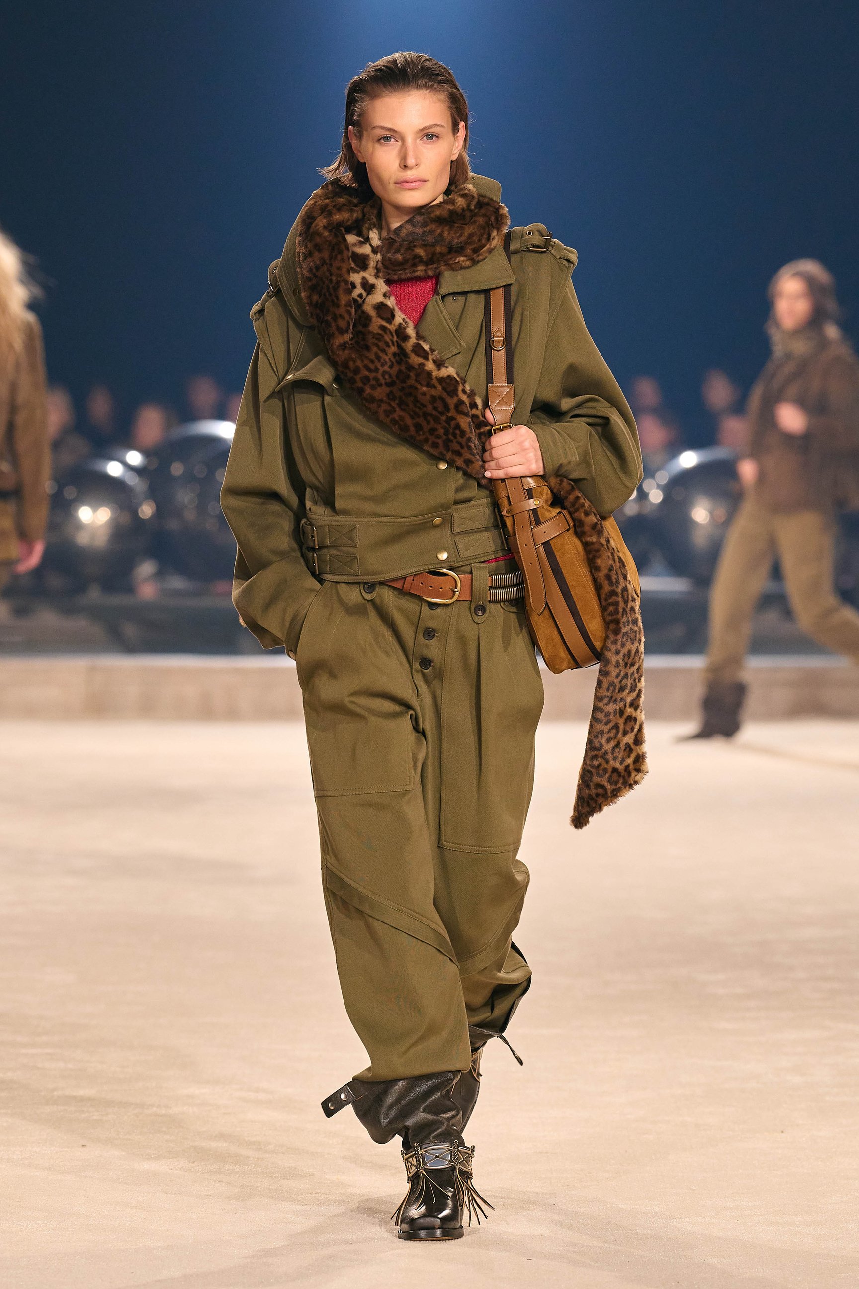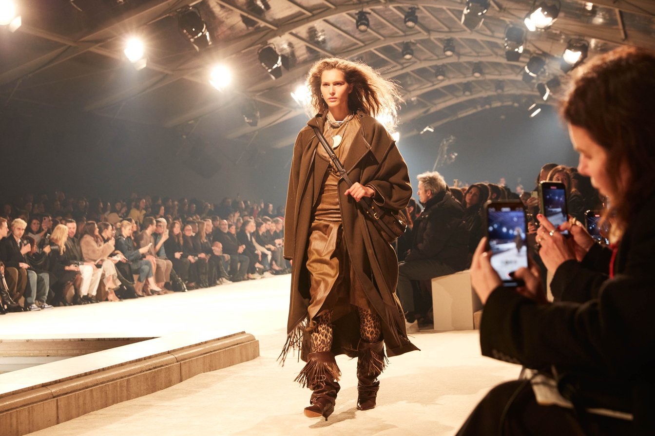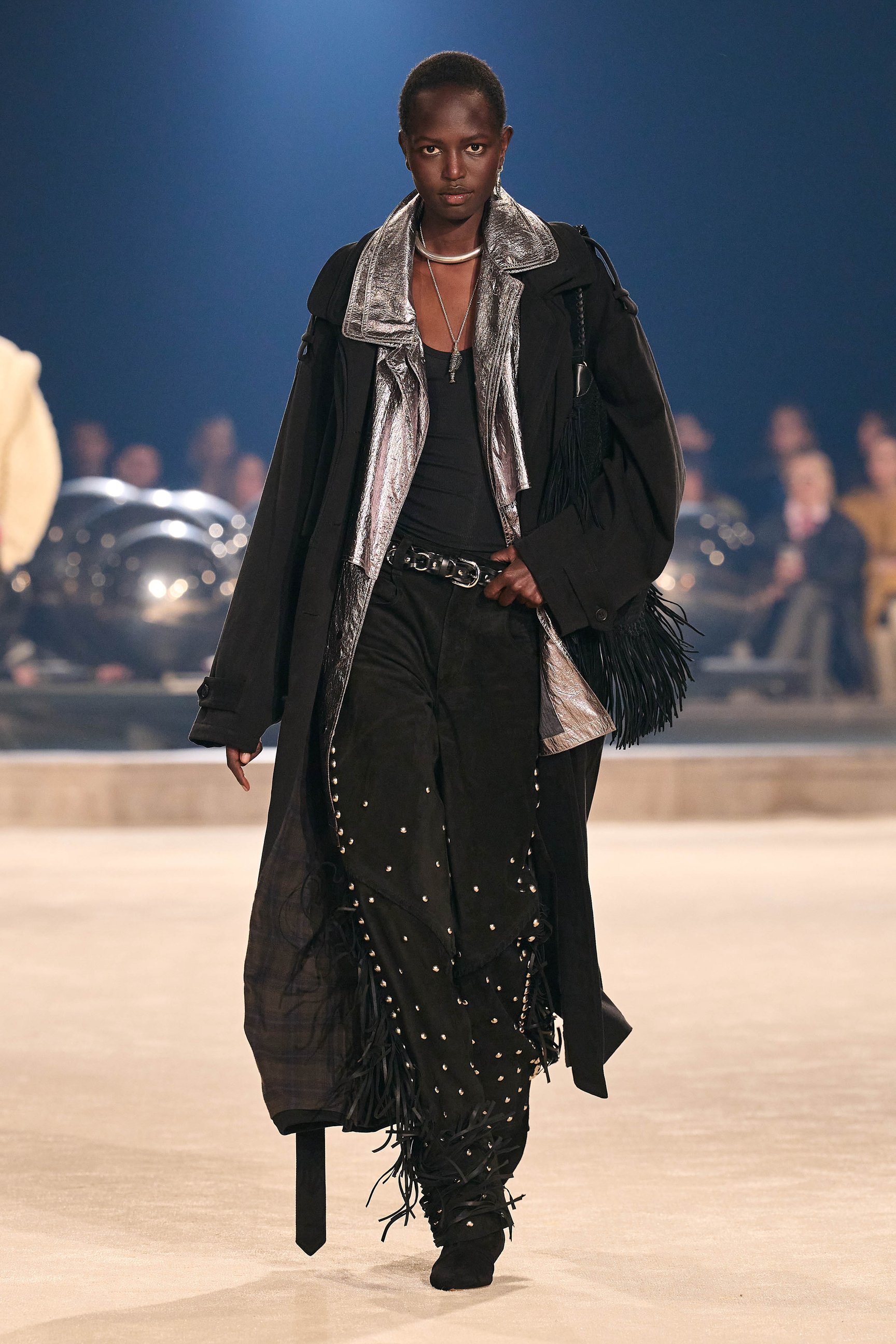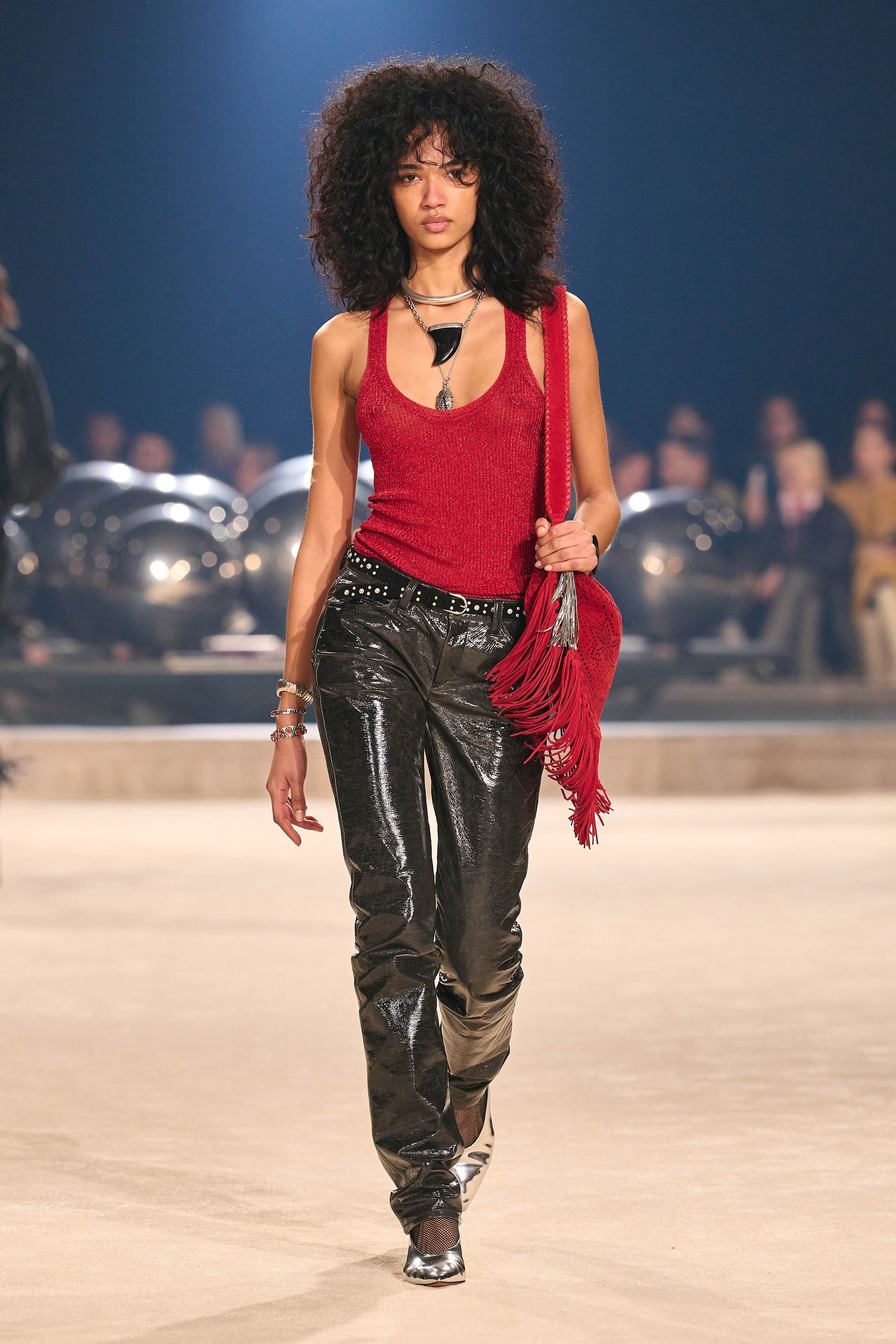 「イザベル マラン」の2024年秋冬シーズンは、平原や砂漠を放浪するタフな女性像が印象的。招待状としてホットソースが配られ、会場にはヒスパニック調のエネルギッシュなサウンドトラックが響き渡った。特に目を引いたのは、ニットやレザー、シアリングを重ね着したルック。アニマルプリントや袖にあしらわれたカスケード・フリンジ、ブーツを飾るジュエルベルトがガウチョ・スピリットを体現。スエードのスカーフには、パンチングやスタッズの刺繍が施された。