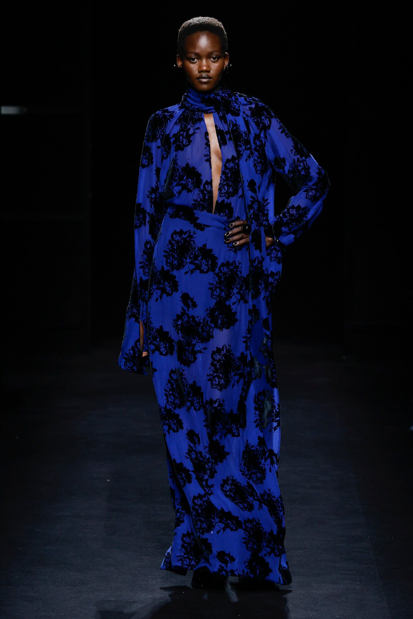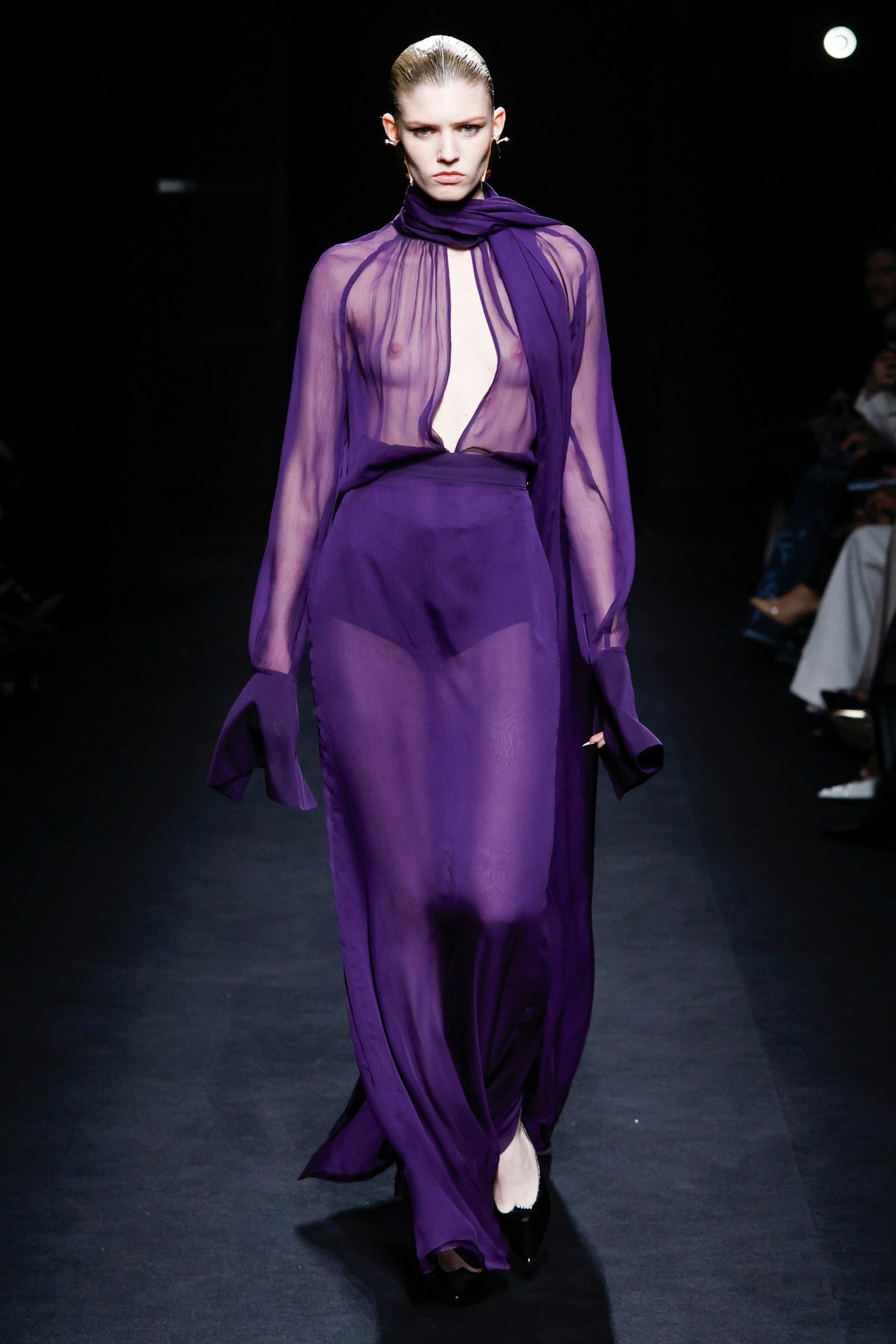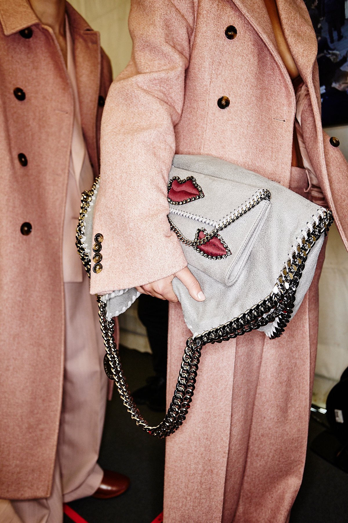 誇張されたプロポーションが鍵となった今シーズン。トラディショナルなメンズのテーラリングを踏襲しつつも、オーバーサイズやストロングショルダーのシルエット、引きずるようなパンツのレングスが目を引いた。また、母親のリンダ(Linda McCartney)のワードローブからインスパイアされたパディングが、ドレスやトレーンガウンを力強いフォルムに仕立て上げた。モデルたちはそれぞれ「ファラベラ 」バッグの様々なバリエーションを手に登場。リップモチーフをあしらった「ファラベラ 」や限定アイテムは、ショー終了直後に販売を開始した。
