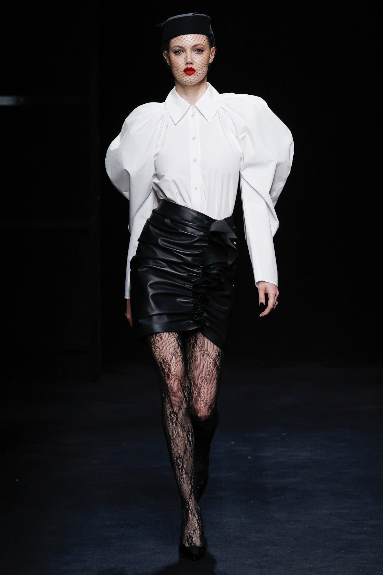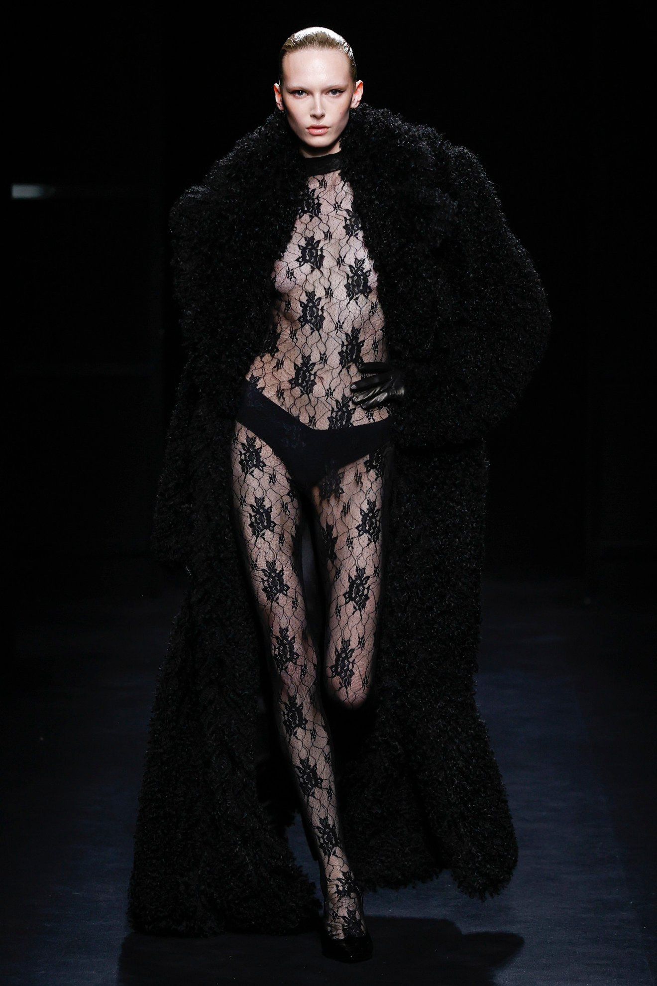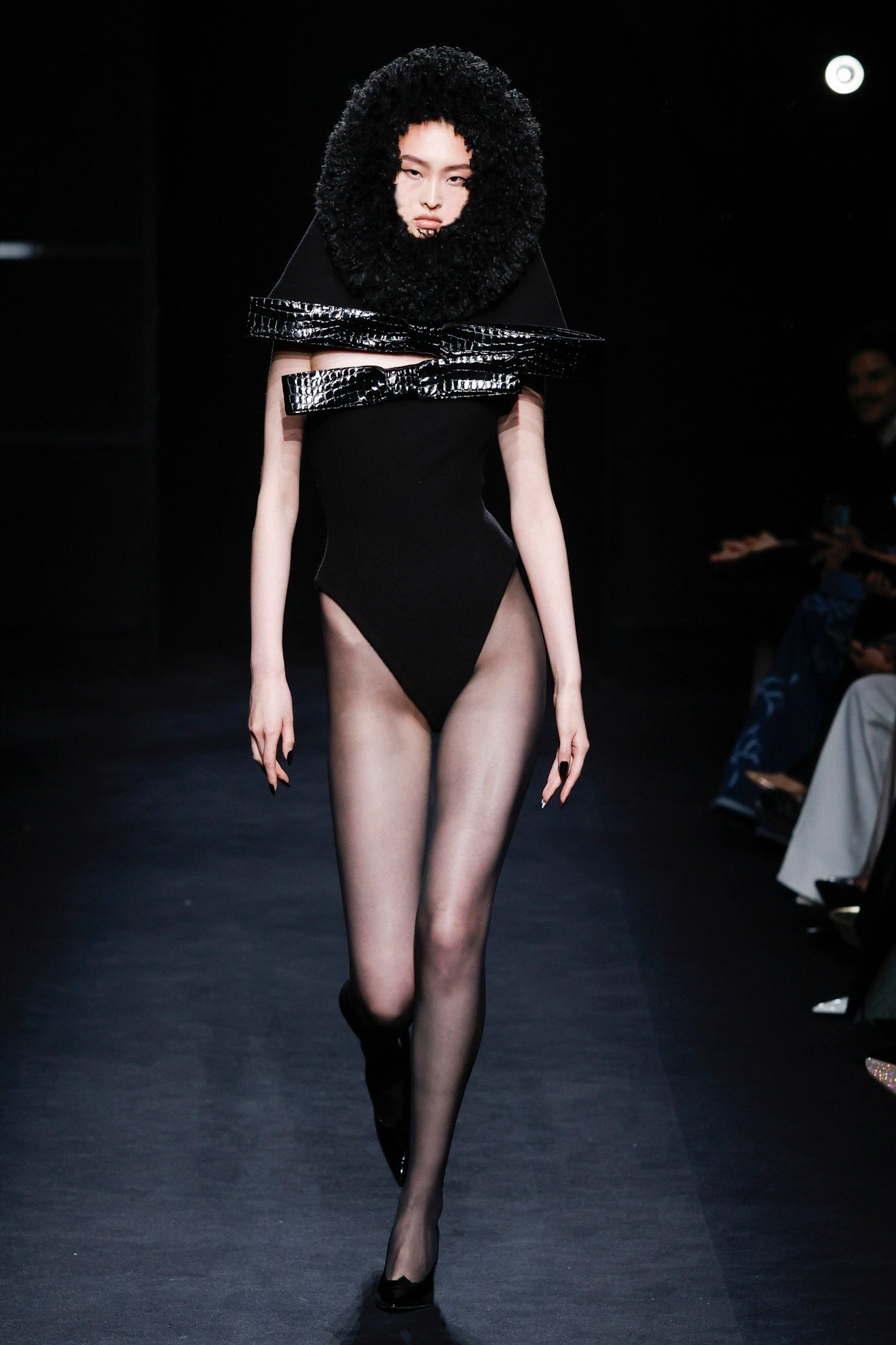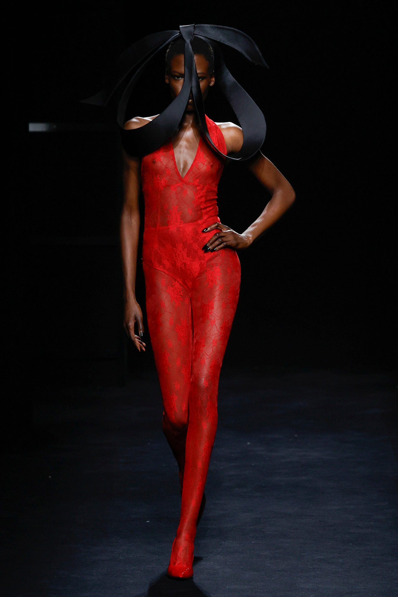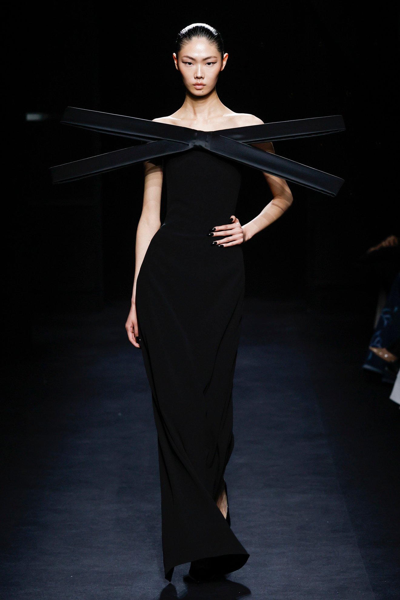 ポイントになったのは、シャープなテーラリングと構築的なシルエット。メンズの要素を取り入れたワイドラペルのタキシードジャケットやシガレットパンツが、力強さをアピールする。一方でレースのボディスーツやシアーなイヴニングドレスなどがボディラインを露わにし、ドラマティックな官能性を演出。おなじみのクチュールリボンモチーフを彫刻的に取り入れたルックには大胆さを感じさせた。
