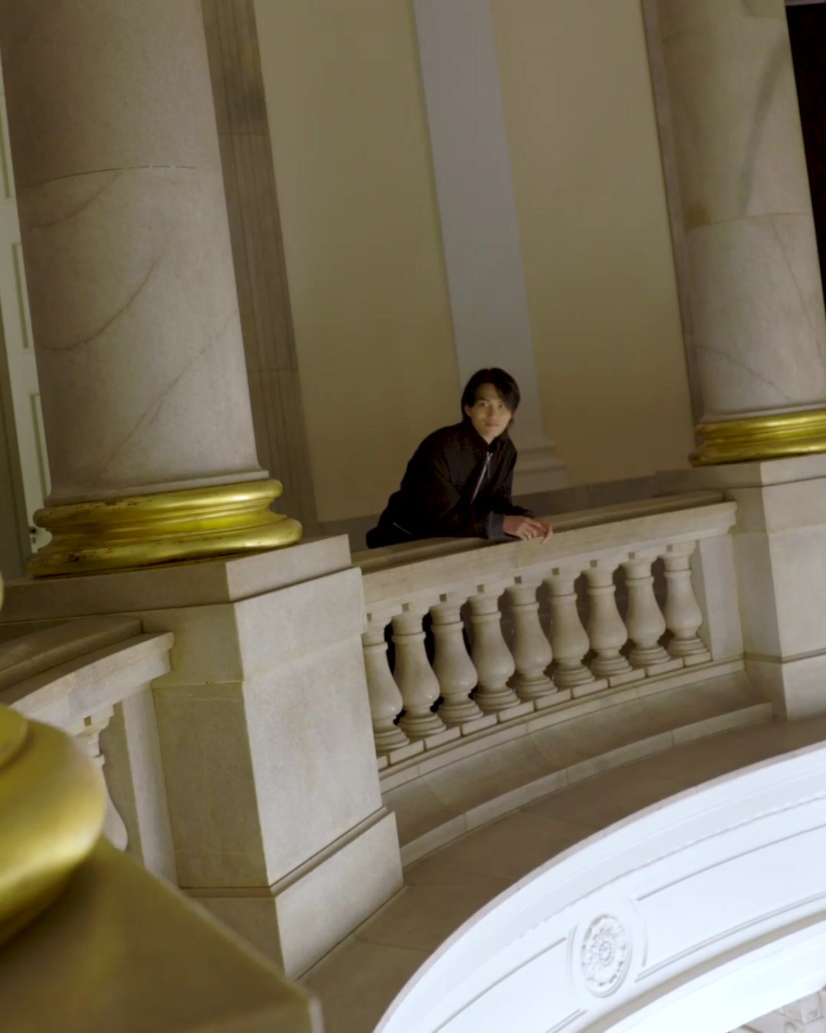 この日は撮影を一本こなしてから会場入り。クラシカルで荘厳な館内をぐるりと体感しながらテンションを高めていく。ちなみにこの日は「by R」の限定アイテムであるポール・スミスのシャツを着用。
