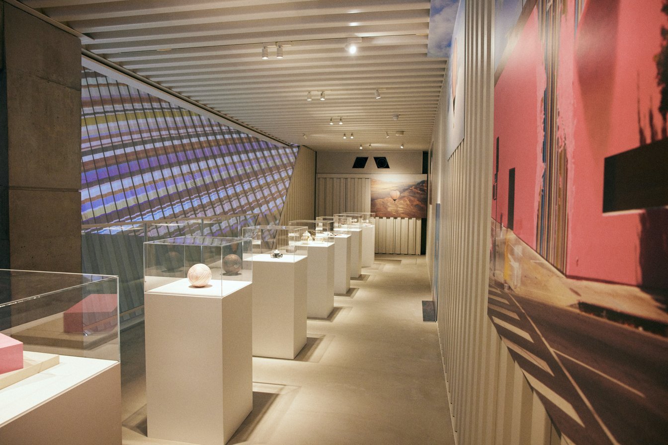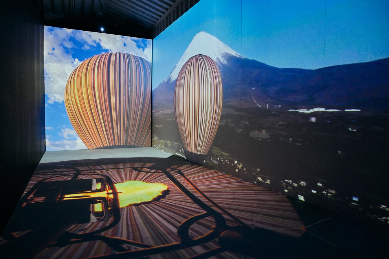 会場のコンテンツの中でも見逃せないのは、3Fに設けられた気球の旅が味わえるプロジェクションマッピング。この部屋では、アメリカのモハーベ砂漠や富士山近郊を飛行したシグネチャーストライプの気球の壮大な旅の様子をバーチャルで体験できる。また、ひとつ下のM2Fには、1000m以上の生地と、5kgの長さの糸を用いて制作された巨大なエンベロープ(熱気球の球皮)がバスケットとともに展示されており、イギリスの職人たちが200時間かけて手縫いで仕上げた実際の気球も間近で見ることができる。