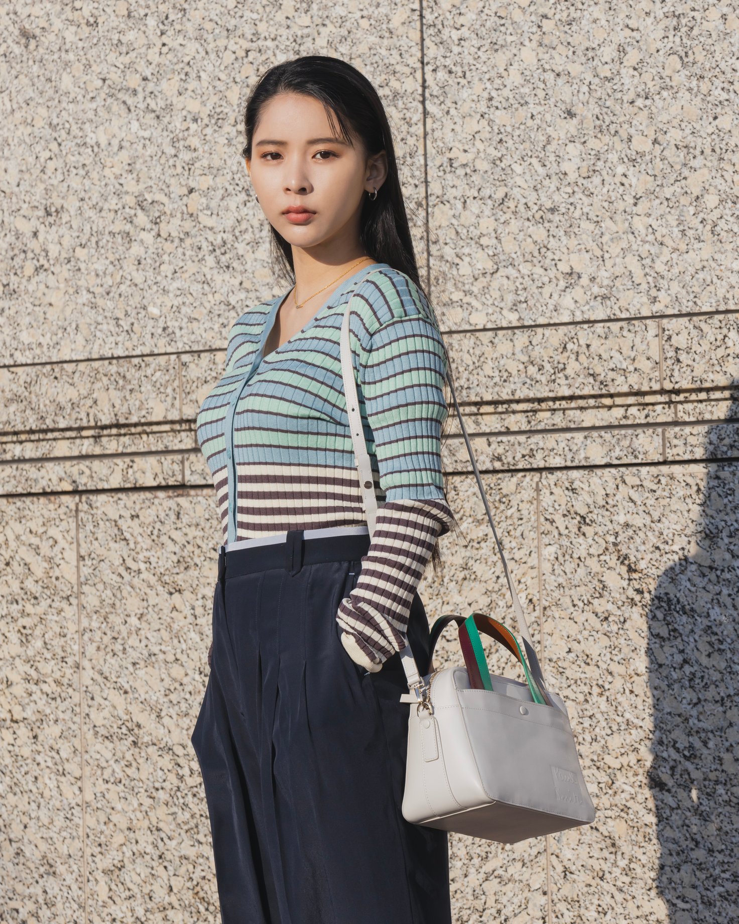 2wayハンドバッグ 49,500円/Paul Smith BAG、カーディガン 36,300円、パンツ 36,300円、ネックレス 9,900円/その他全てPaul Smith