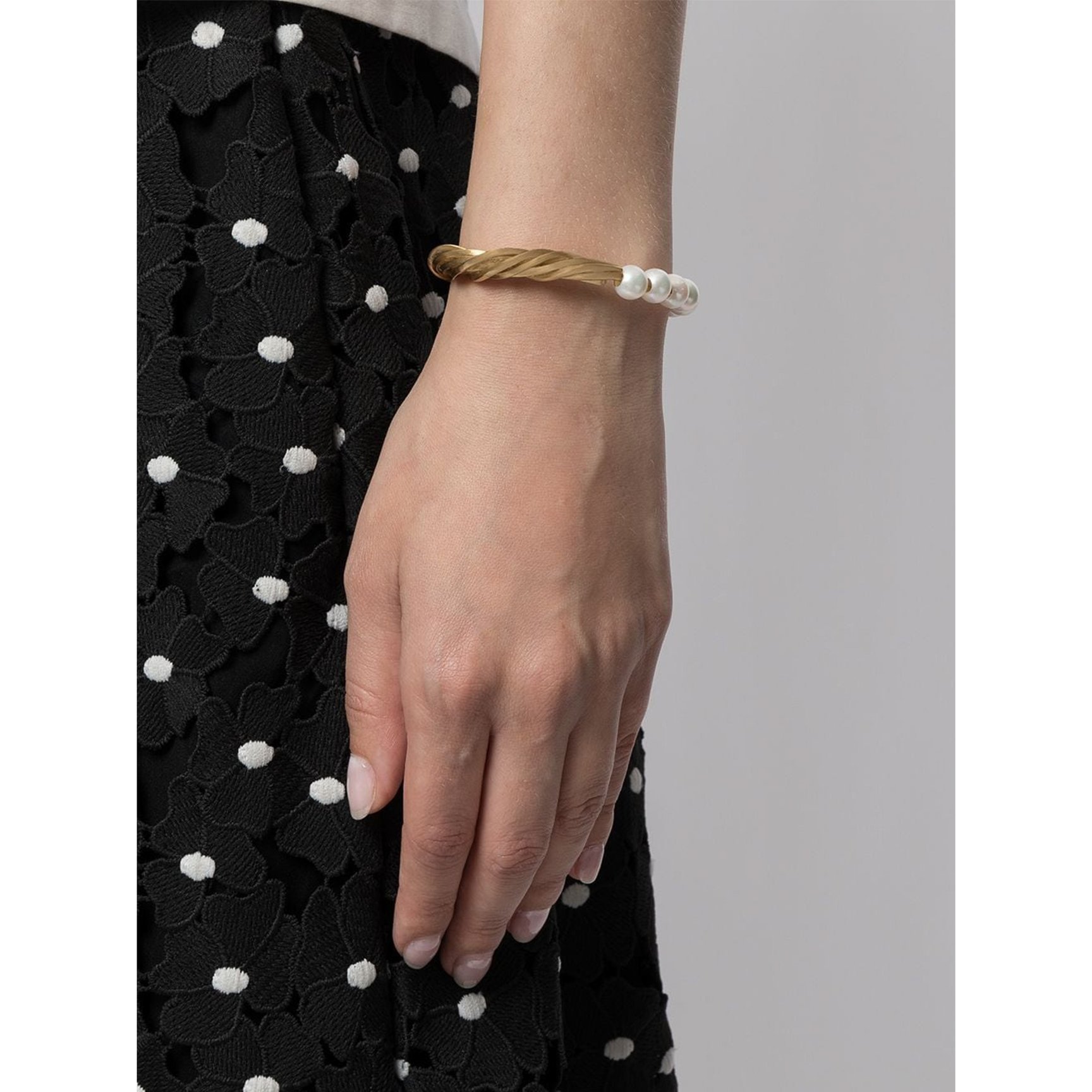 ツイストディテールのエッジィなハードウェアに、気品あるパールが連なった「コンプリーテッドワークス(COMPLETEDWORKS)」のカフブレスレット。角度により印象が変わるアシンメトリーデザインで、どこをとってもおしゃれに魅せます。