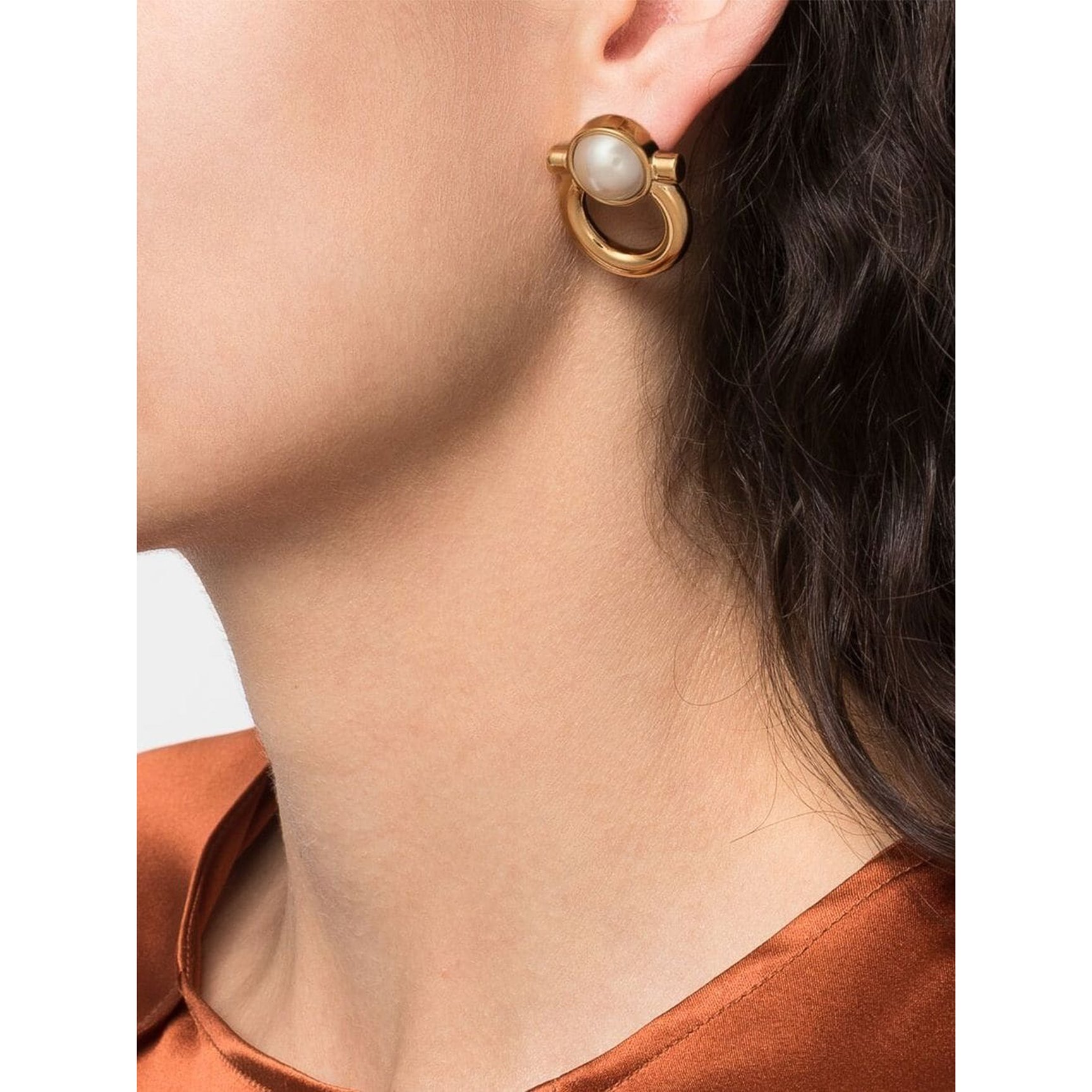 「サルヴァトーレフェラガモ(Salvatore Ferragamo)」からは、ブランドを象徴するガンチーニを模したペアピアスをチョイス。大胆なデザインながら、エレガントなパールの艶めきで洗練された雰囲気に仕上げています。