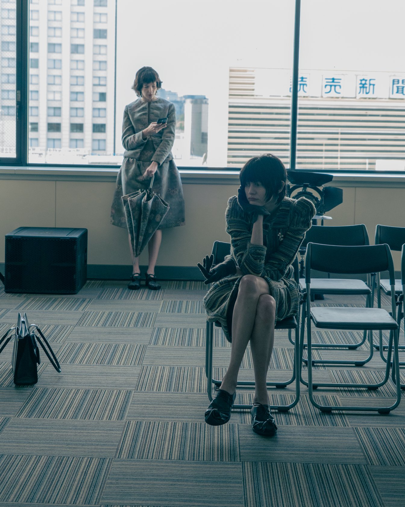 都心の喧騒から切り離された高い場所から、街や地上を行き交う人々を眺める「俯瞰」の視点は、今回のコレクションのムードボードにあったという、写真家のホンマタカシが1990年代に東京郊外の街の風景や人々をフラットな視点で切り取った写真集「TOKYO SUBARBIA」のイメージへとリンクする。当時の郊外は、団地やチェーン店、ショッピングモールなどが立ち並ぶ「無個性で何もない、空虚な場所」として捉えられていた。では、今の村上の俯瞰的なまなざしには、東京の郊外とそこで生きる人々の姿はどのように映っているのか。