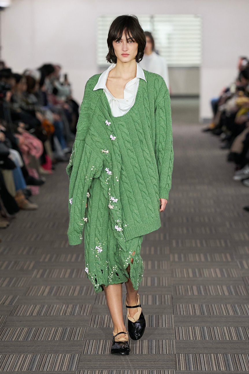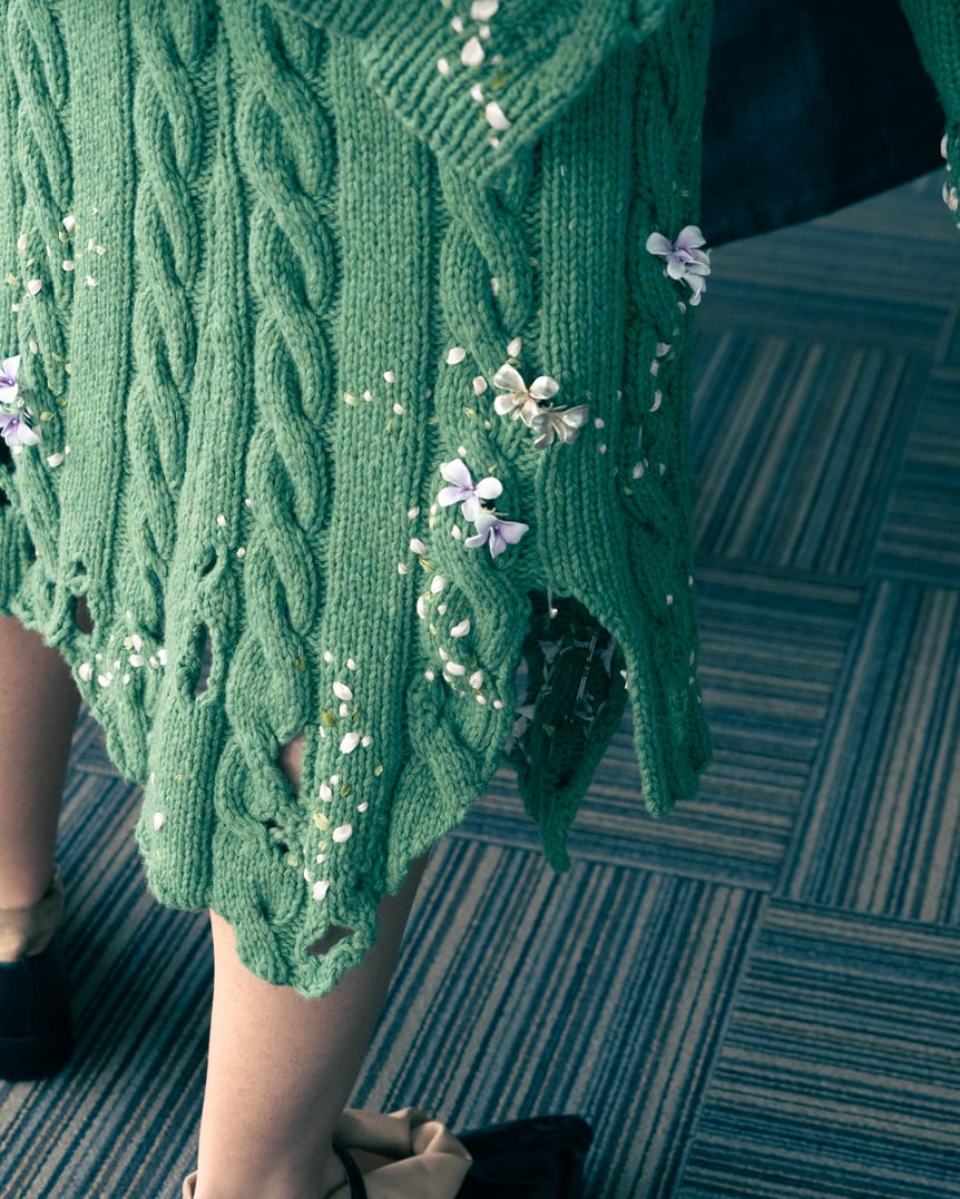 もう一つ、今回のコレクションで目を引いたのは、淡いパステルカラーや繊細で可憐な花の刺繍、おとぎ話のプリンセスのような立体的なシルエットのニットドレスといった、極めてファンタジックで牧歌的な要素だ。