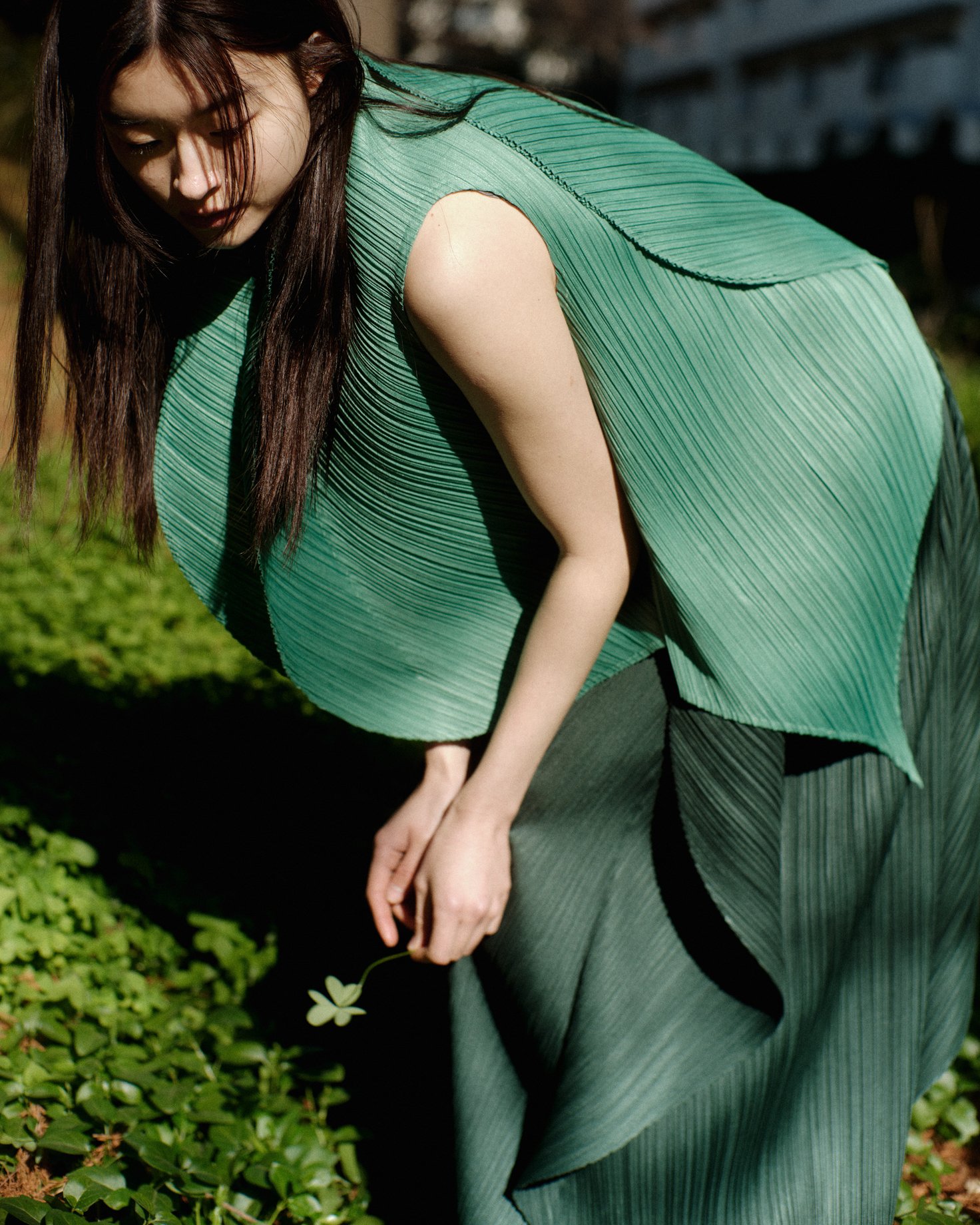モデル:ノースリーブトップ(グラスグリーン) 4万9500円、ハイネックノースリーブトップ(グレー)2万7500円、パンツ 8万2500円、シューズ 4万5100円、プロダクト:ノースリーブトップ(ダークグリーン)4万9500円、半袖トップ(グラスグリーン)4万2900円/プリーツ プリーズ イッセイ ミヤケ