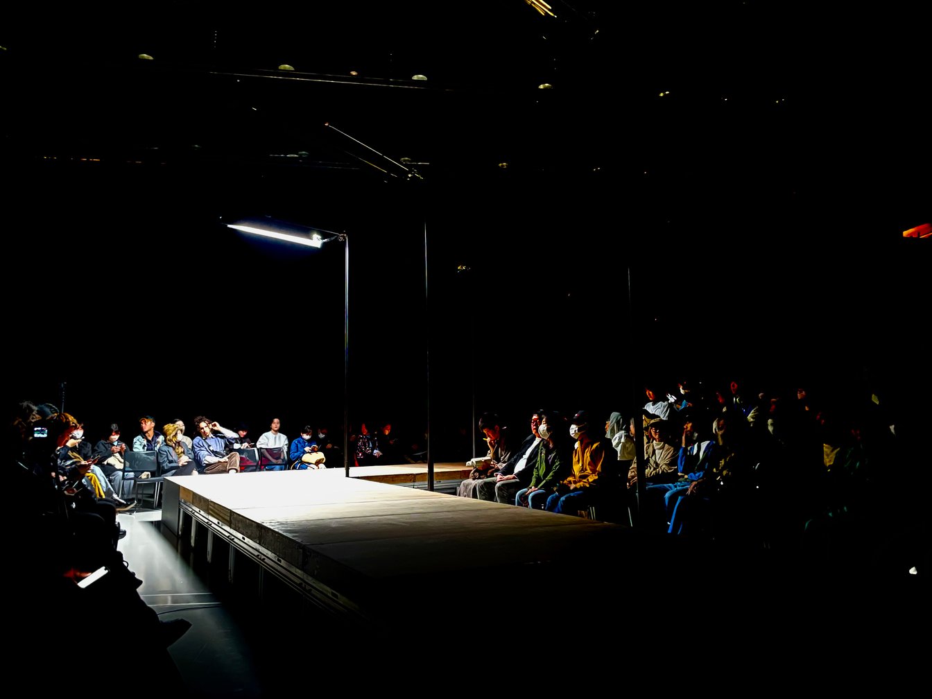ショー会場は暗闇に包まれていた。誘導灯を頼りに着席すると、小説家フランツ・カフカ(Franz Kafka)の「城」が無機質な男性の声で朗読されていることに気が付く。本作は未完の長編小説で、城に雇われた測量師がいつまで経っても城の中に入ることができずに翻弄されるいわゆる不条理小説だ。ランウェイに目を向けると、橋桁の上に街灯が数頭設置され、その中の1灯だけが点灯していた。街灯の意味合いは、ショーが始まり蛾を模したアイテムが登場した時に明らかになった。村上は「街灯に集まる蛾が、希望に向かって飛んでいるように見えた」と説明し「答えはないかもしれないけど、何かを探そうとしている。その姿を見て、なんともいえないポジティブな気持ちになれた」と話してくれた。カフカの城に登場する測量士も、城があると思って探し続ける。あるかもしれないものを、「ある」と信じ、もがきながらも探し求める姿は村上にも通ずるものを感じる。