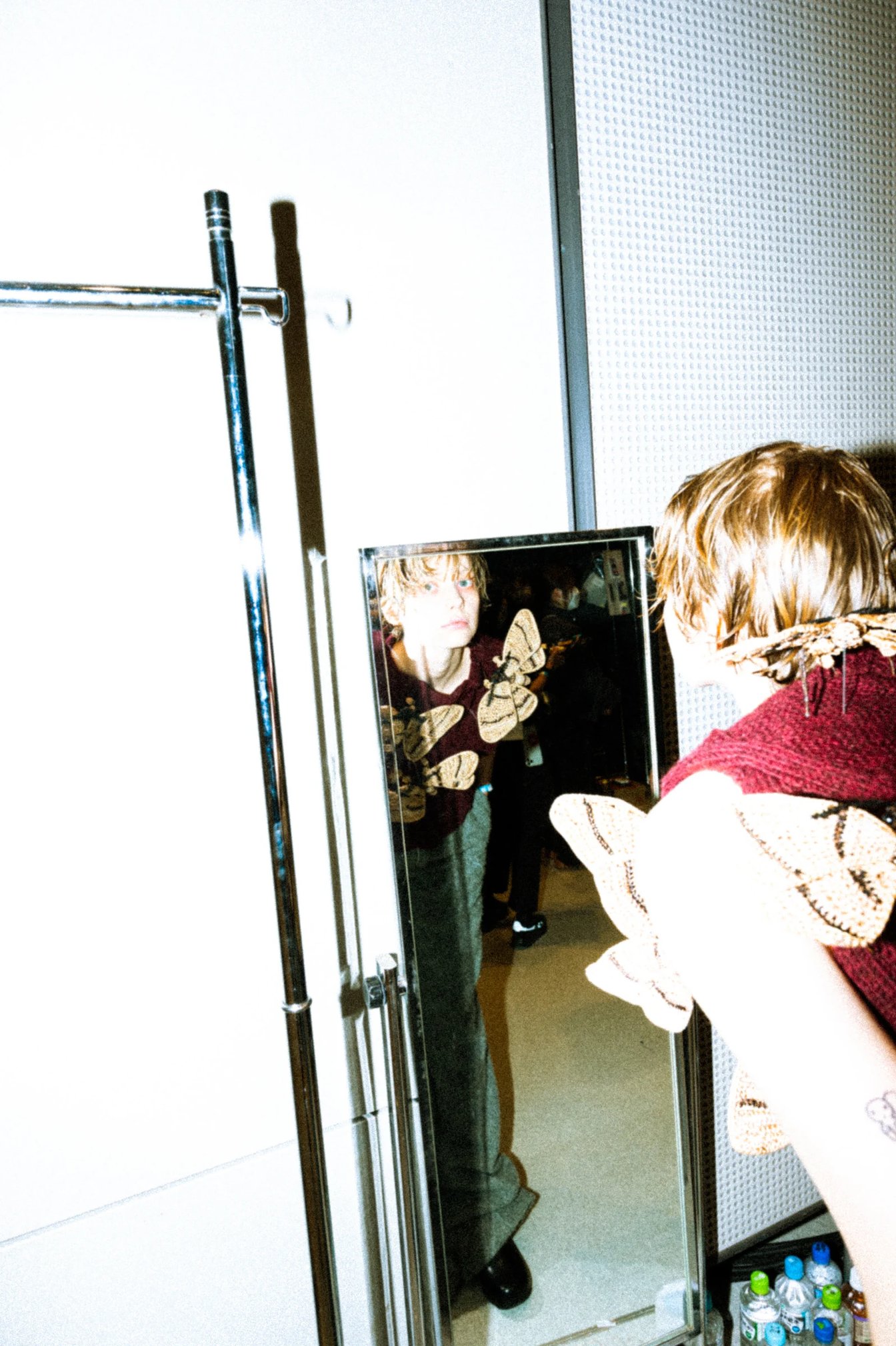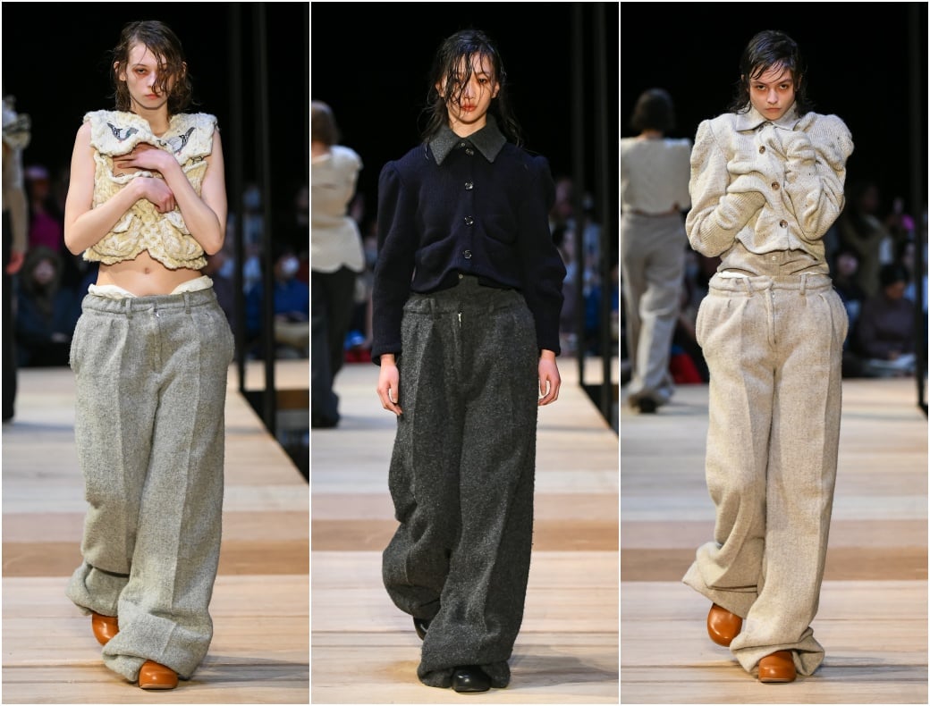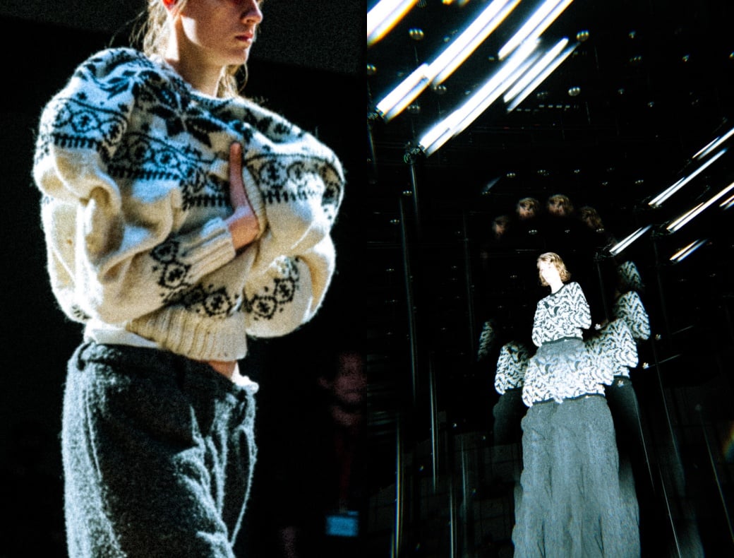 今回のショーで最も目を引いたのはモデルだろう。というのも、モデルの多くが手でセルフハグをするような形でランウェイを歩いたからだ。上向きについたポケットに手を突っ込み、身体を丸めてランウェイを歩く姿は、寒さで冷えた体を温めているようにも、体を守っているようにも、緊張で強張っているようにも見える。村上は「ポケットに手を入れると安心する」とした上で「ニットというものも、自分を守り、安心するようなものであってほしい」と、その着想源が、ゴミ箱に丸めて捨てたデザイン画の山だったと明かした。