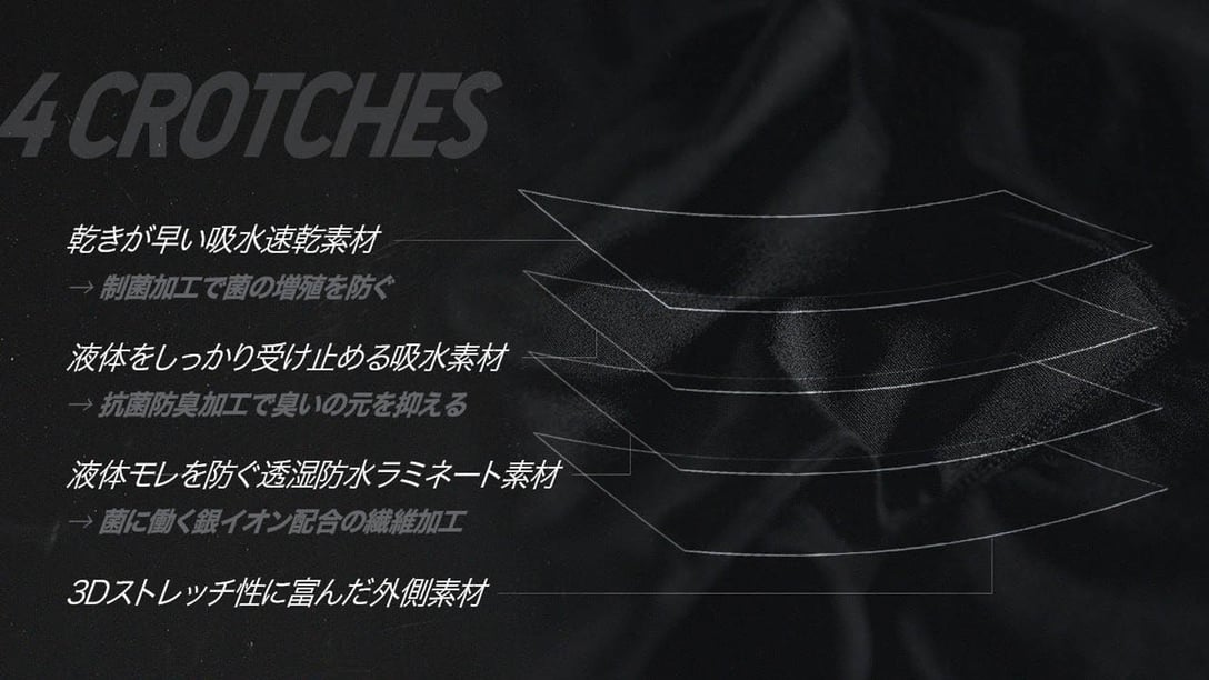 オプトの「吸収型ボクサーパンツ」は、吸水クロッチ部分に「吸水速乾素材」「吸水素材」「透湿防止ラミネート素材」「ストレッチ性/フィット性に富んだ立体成型ニット」の4素材を採用。いつも通りの履き心地を邪魔しない厚みで、30〜35mLの液体を吸収する機能を実現した。さらに、菌に働きかける加工が施された素材を採用し、制菌加工・抗菌防臭加工・銀イオンの抗菌防臭加工によって嫌な臭いの発生を防ぐ。