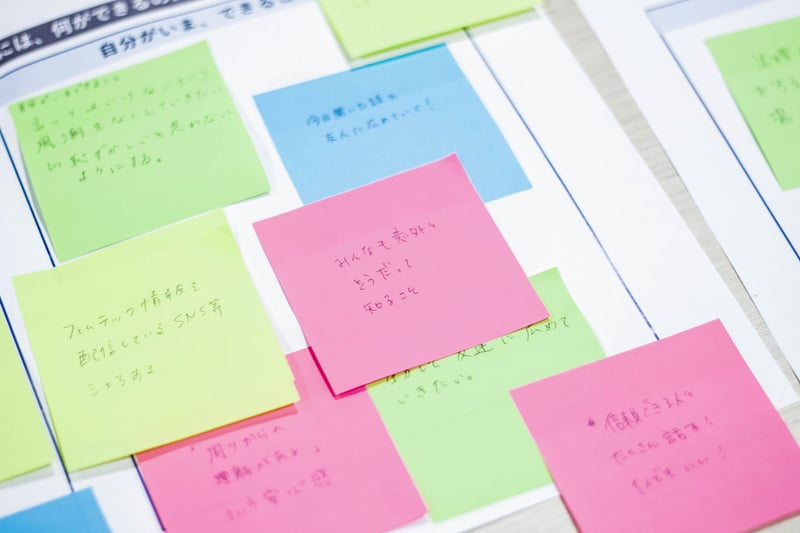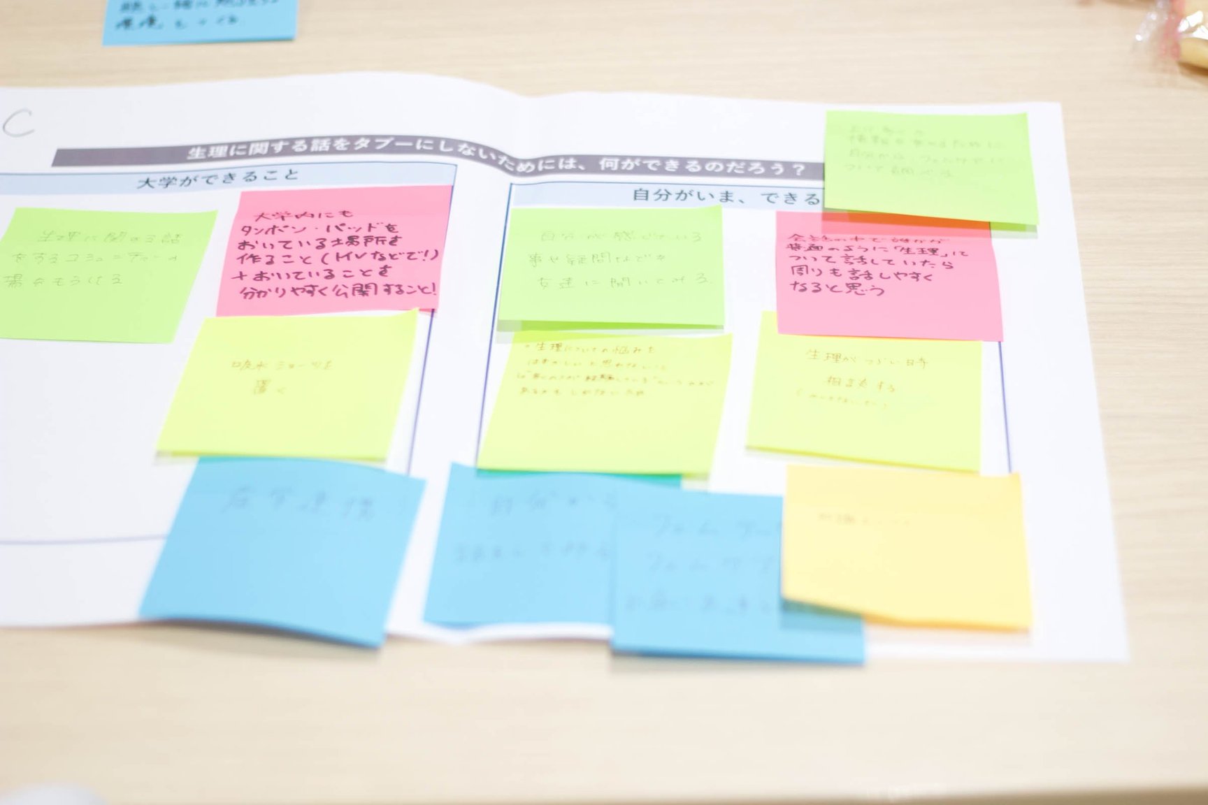 「タブーを自由にラボ」に参加した大学生たちは、「生理に関する話をタブーにしないためには、何ができるのだろう?」をテーマに、「大学ができること」「自分がいま、できること」を話し合いました。「小学校の性教育で生理の話をするときは男女で分けられるイメージがずっとある。だから、悩んでいる時も生理の話は男性にしてはいけないんだ、と思ってしまっていた」と語る学生や、それに関して日本の性教育の遅れを指摘する学生、大学でも男女問わず生理や体の違いに関する教育をする必要性があるという意見や、悩みを打ち明けられるコミュニティを作りたいという学生も。