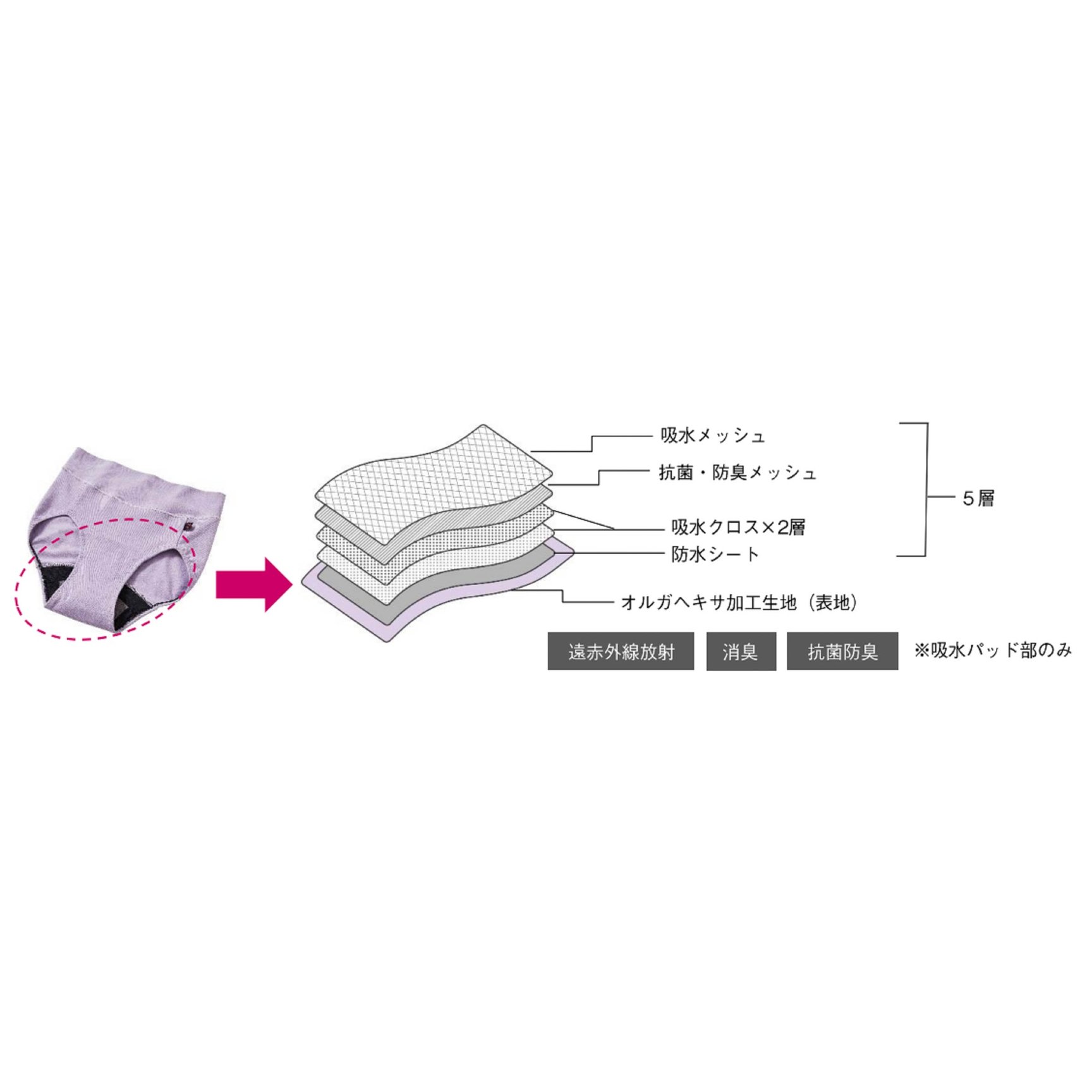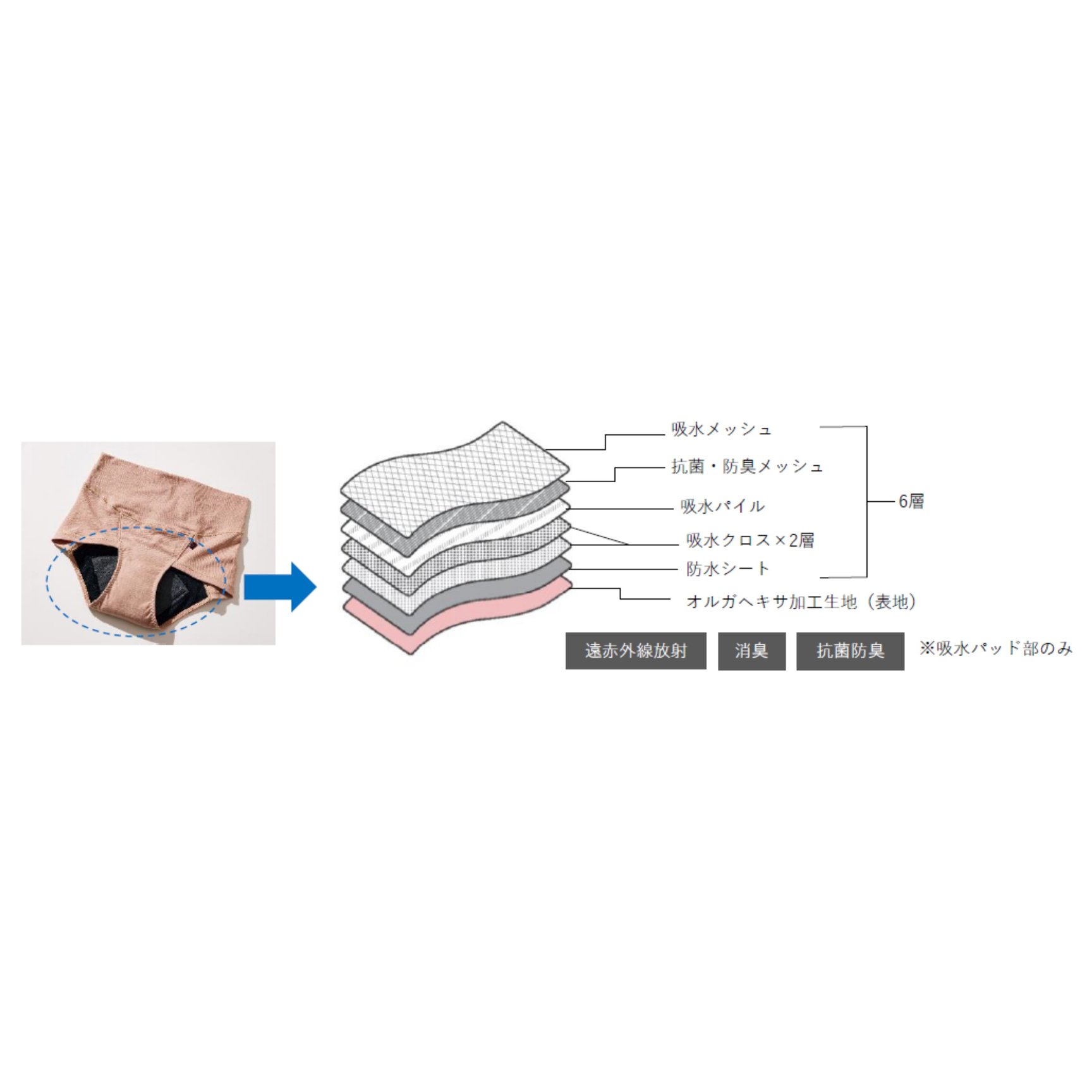 2023年に発売した「フリーフェムショーツ」第1弾は、6層の立体パッド内蔵でスピード吸収&ニオイを防ぎ、肌をサラサラに保つ。約50~60mLの水分を吸水し、肌に優しいコットン素材と遠赤外線放射機能がある植物性炭素繊維「オルガヘキサ」加工で、肌と体をじんわり温める。ウエストとヒップをすっぽり包み込み、ズレにくいマキシ丈で、お腹周りは生地を2重に折り返し締め付けずにフィット。長時間横になっても安心できるよう、後ろまで防水ガードを施している。