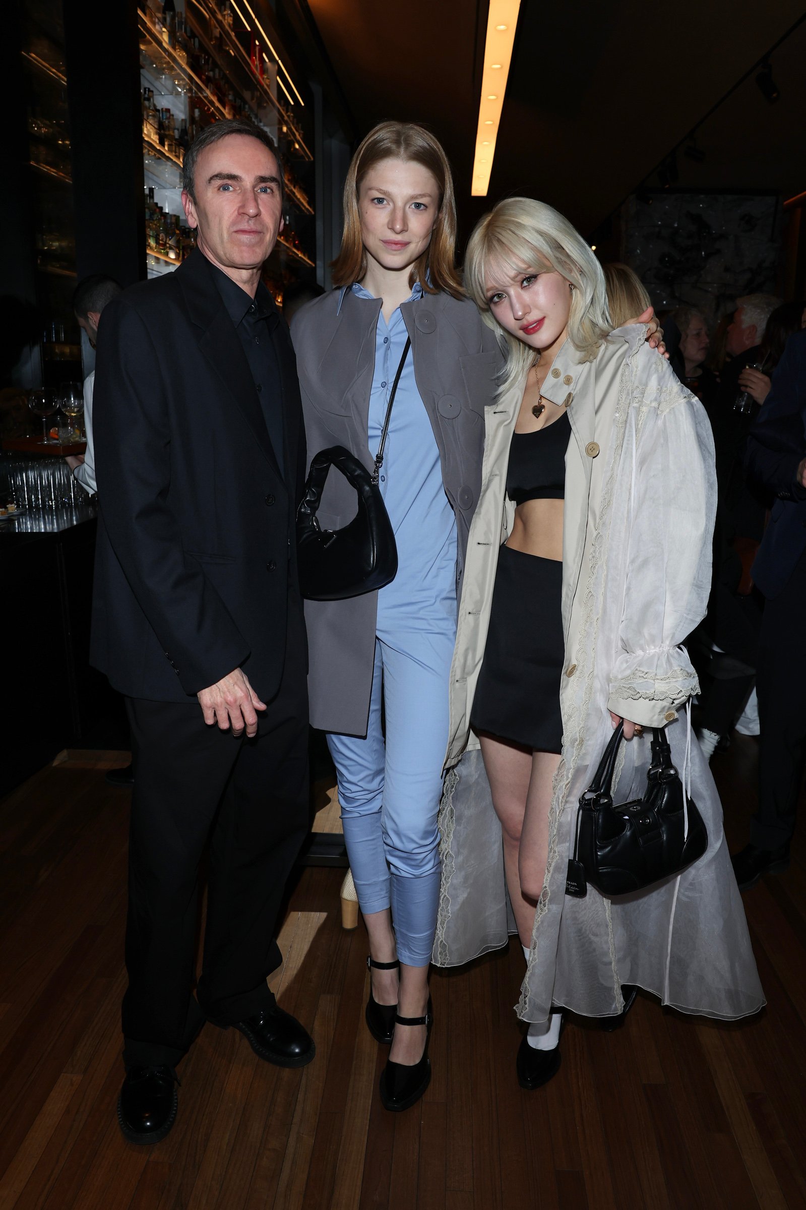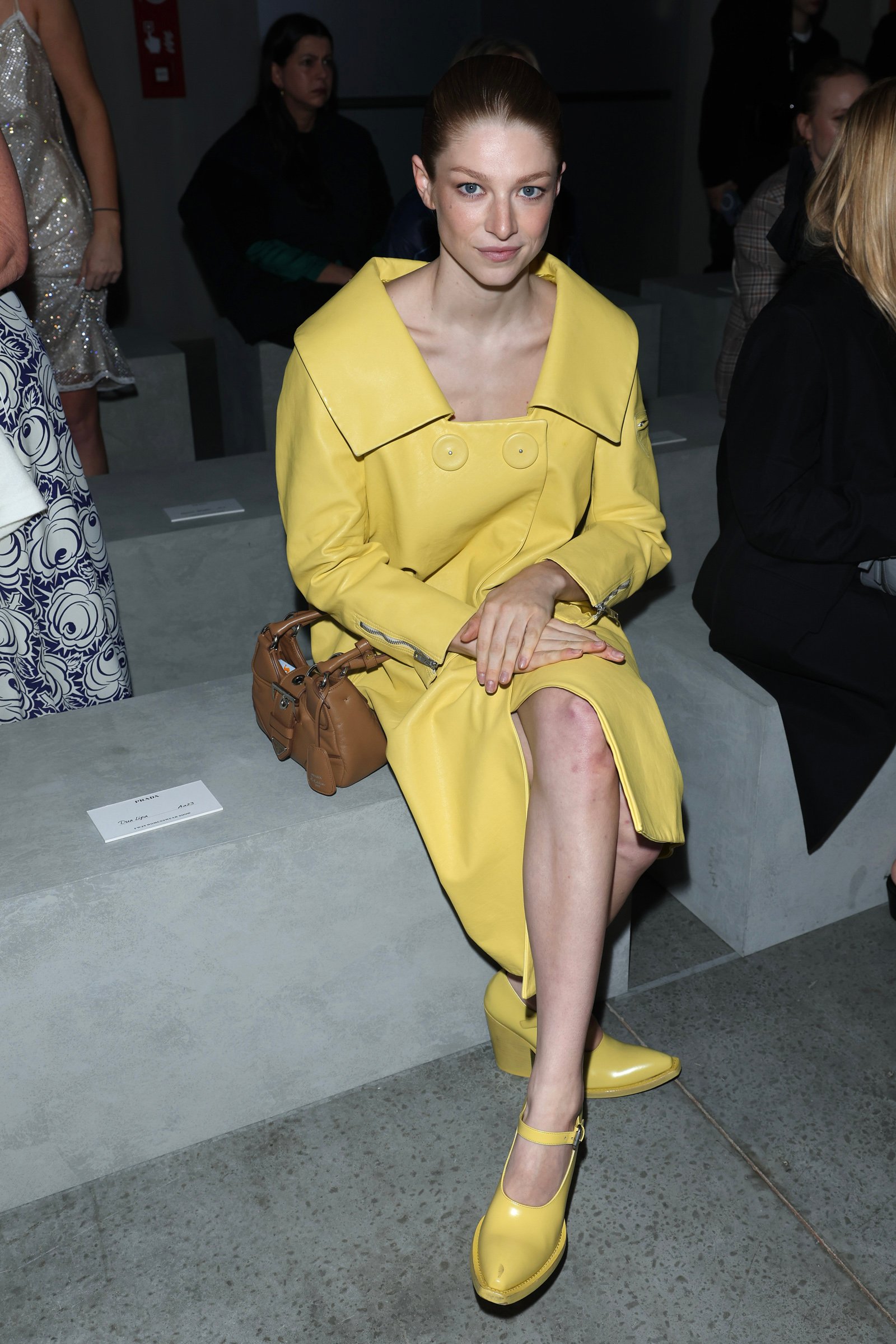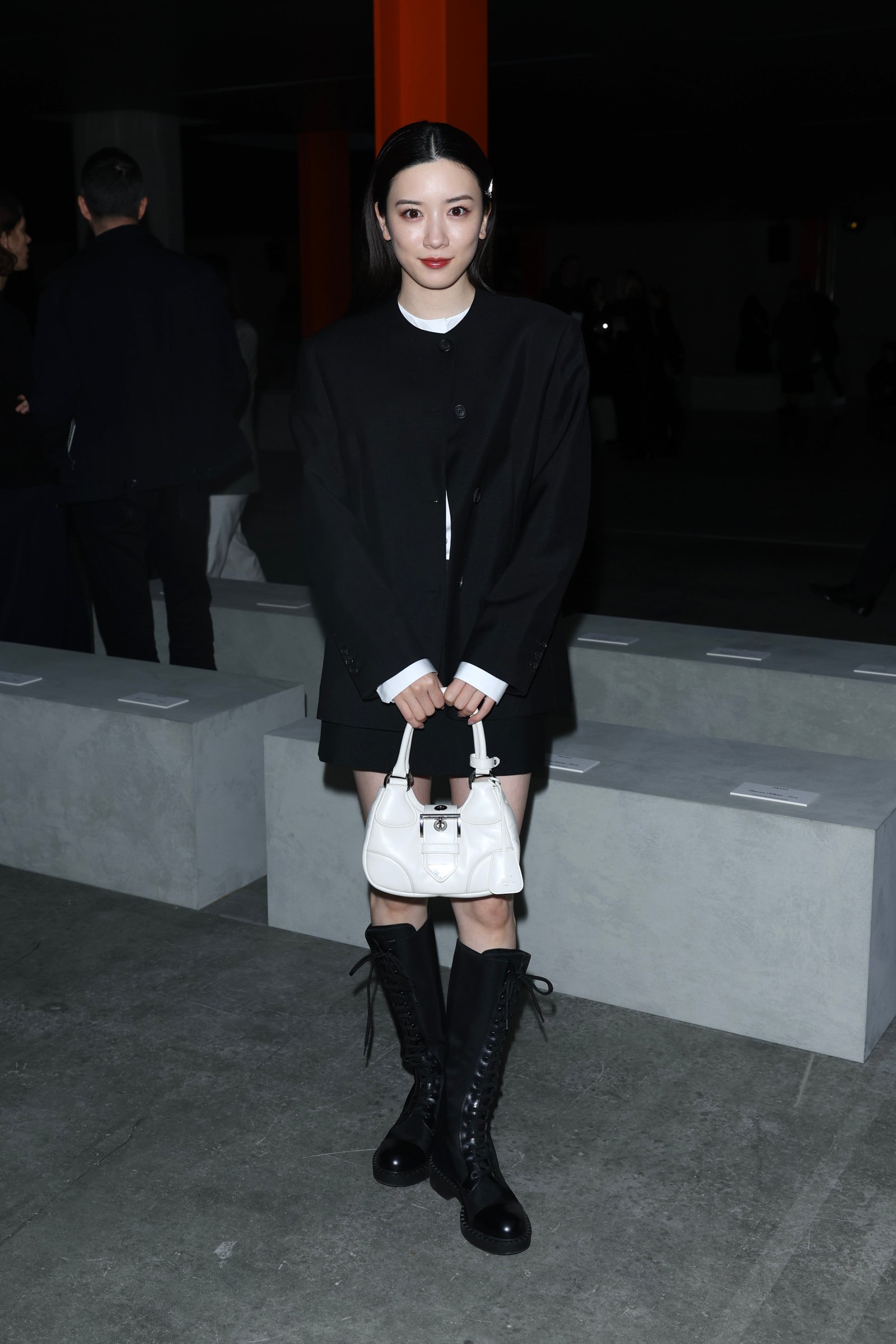 ジャケットに取り付けられたシャツ襟は2023年秋冬メンズとも共通するデザイン。パテッドされた白のセットアップも同じくメンズで登場したアイテムで、身体を保護する=思いやりのある気遣いや安全を保つ行為、という意味合いを持たせている。白いシャツドレスは看護師の白衣からインスパイアされたアイテムで、「誰かを気づかうケアという行為は美しいものです。『ケア』を表現するユニフォームを美のユニフォームに変えたいと思いました」とミウッチャが説明するように、機能的な作業服を美しいファッションルックに昇華してみせた。