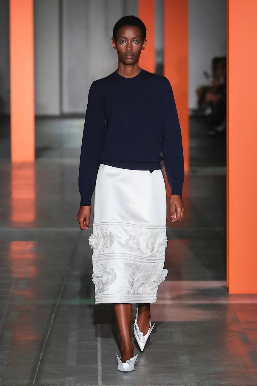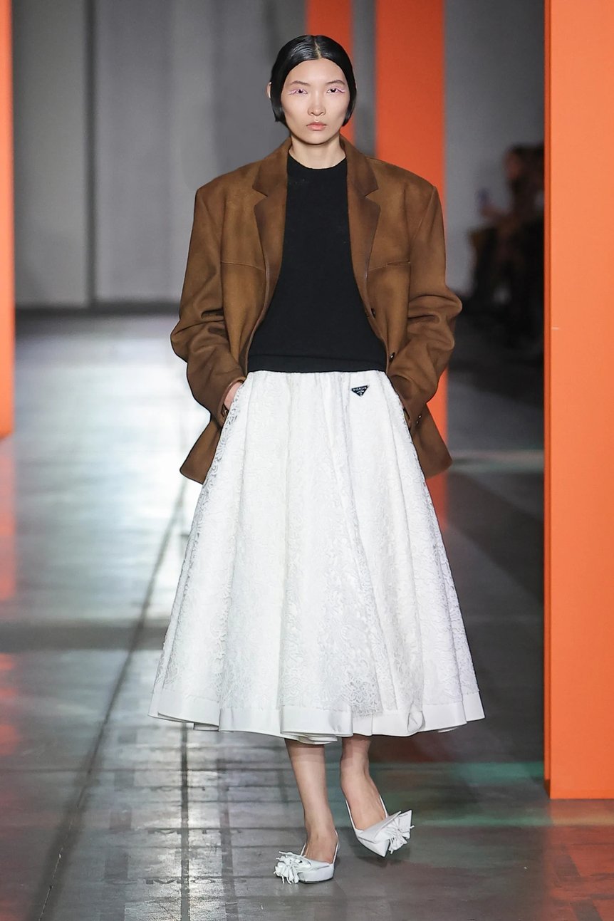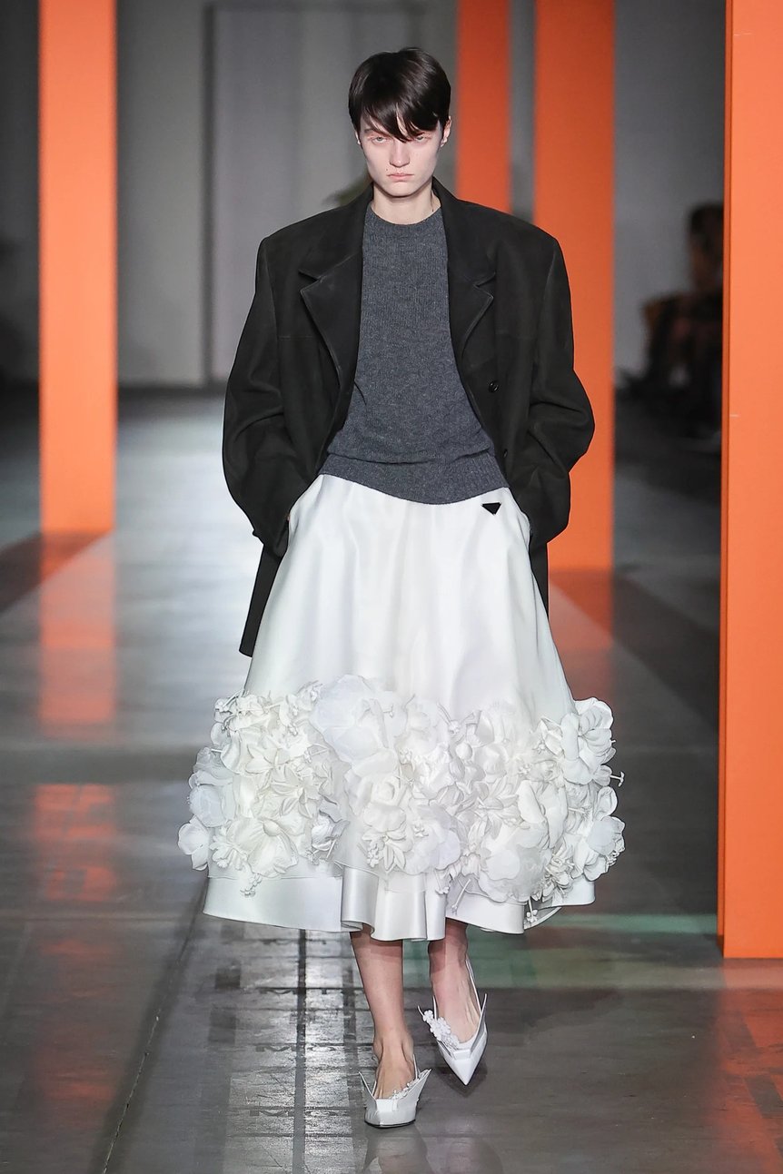 序盤に登場したのは「日常のウェディングドレス」。プラダらしい丸首のシンプルなリブニットとくたっと感のあるジャケットスタイルに合わせられたのは純白のスカートで、繊細なレースや花のコサージュが取り付けられていたり、ミディ丈やミニ、ボリューミーなロングフレア丈と様々。日常の何気ないユニフォームに加え、逆に一日のためだけに作られたウェディングドレスが登場したのには、「この愛を称える日が、なぜたった一日のことなのか?」というラフの疑問がベースにあったという。