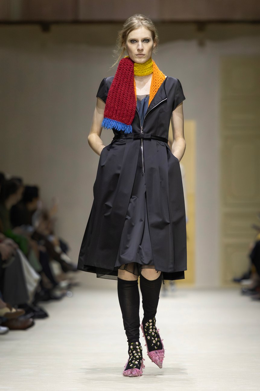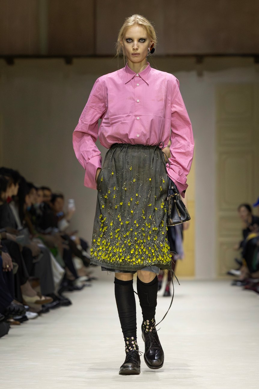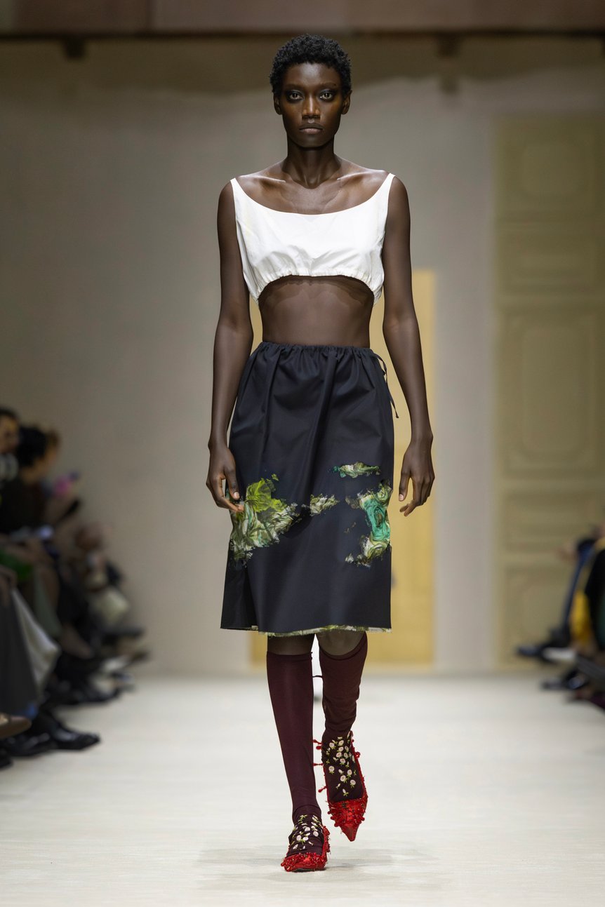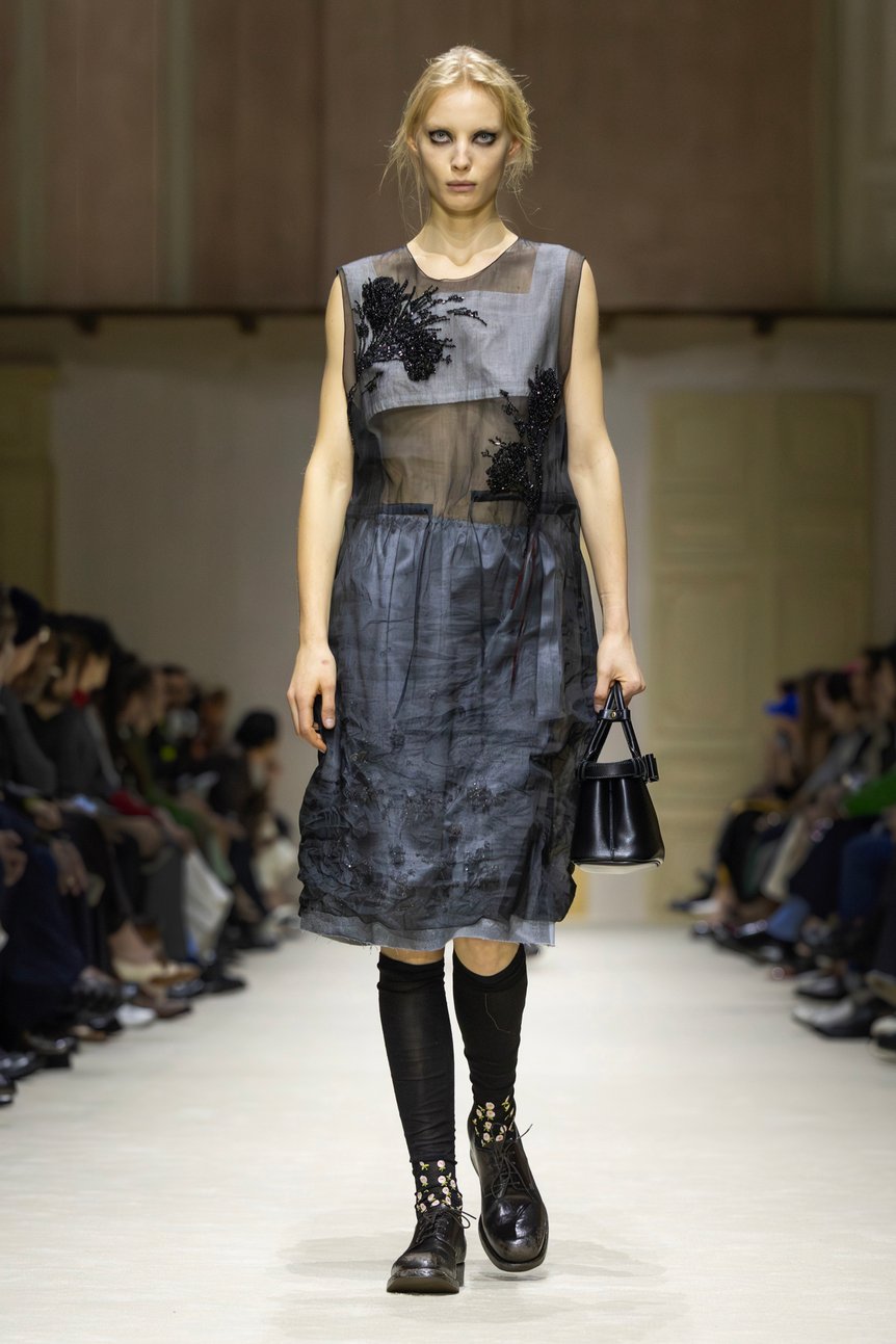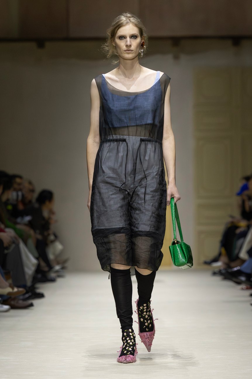 ショー後の取材においてミウッチャは、「私は歴史に魅了されています。私たちが何処から来たのかを知ることは、この複雑極まりない現代世界を生き抜くために不可欠だからです」と語った。事実、会場には16世紀のタペストリーから1900年代の家具に至るまで、5世紀にまたがる美術品やオブジェが配されていた。衣服もまた、歴史の断片である。プラダのアーカイヴドレスがミニマルな衣服の内側に組み込まれるなど、過去のデザイン言語が現代の文脈において鮮やかに再解釈されていた。