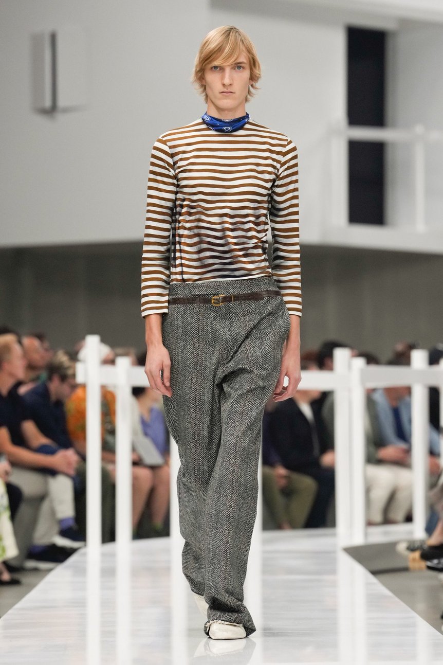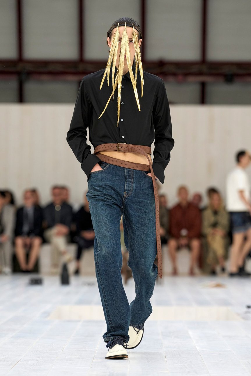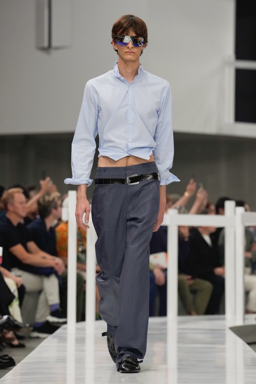 ジョナサン・アンダーソンもまた、「ファッションはシルエットへ」と声明を出すほどプロポーションを刷新することに目を向け、実践する稀代なデザイナーの一人。ハイウエストで作るIラインを提案したりと、毎シーズン新しいフォルムを生み出そうとしている。ロエベの2025年春夏メンズコレクションでは「A Radical act of Restraint(ラディカルな節度)」をキーワードに、様々なバリエーションを用意する中で、ウエストにスポットを当てたルックを発表。ファッションのコンテクストを読むことができる天才だからこその到達点か、プラダと同じ方向性のアイデアとして、ベルトバンドがへそ下にくる腰履きでベルトを2本スタイリングしたコーデを提案した。2本のベルトはトップスとパンツそれぞれに縫い付けられており、これまたウエストを露出するデザインに仕上げられている。