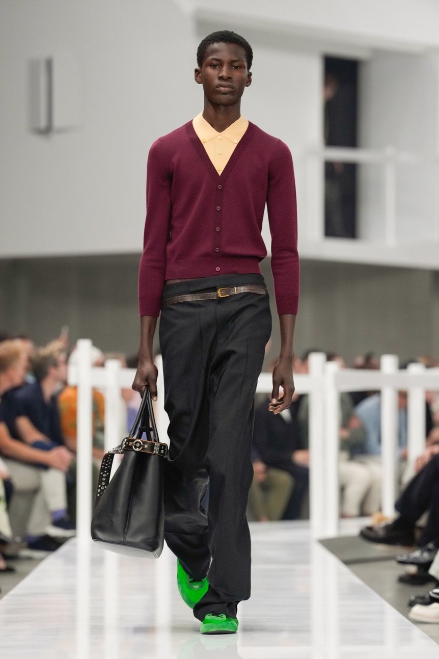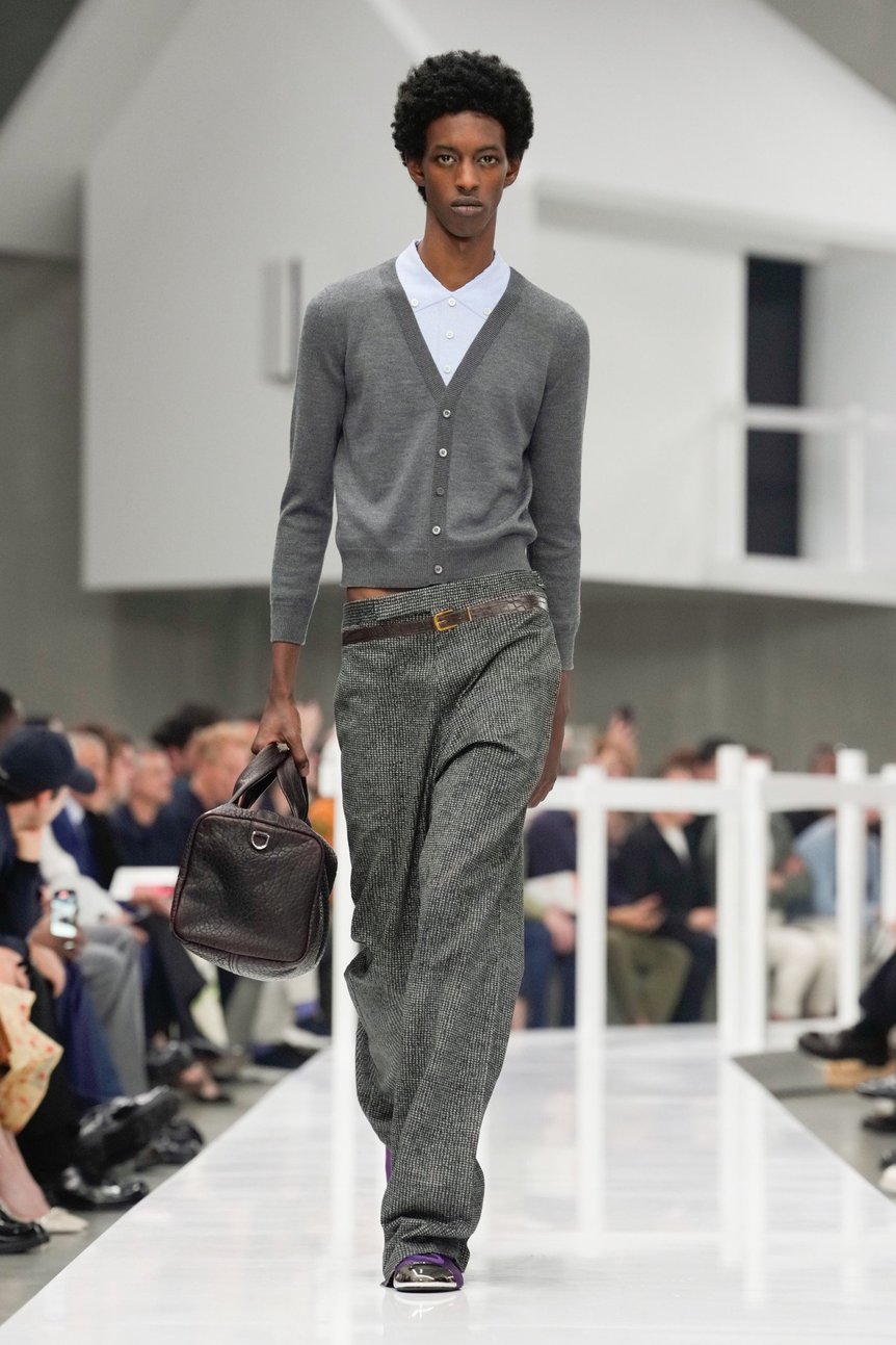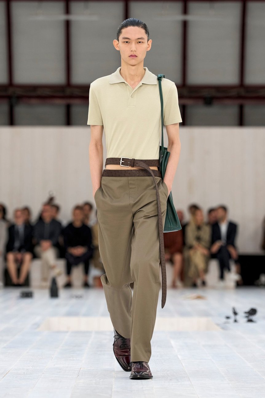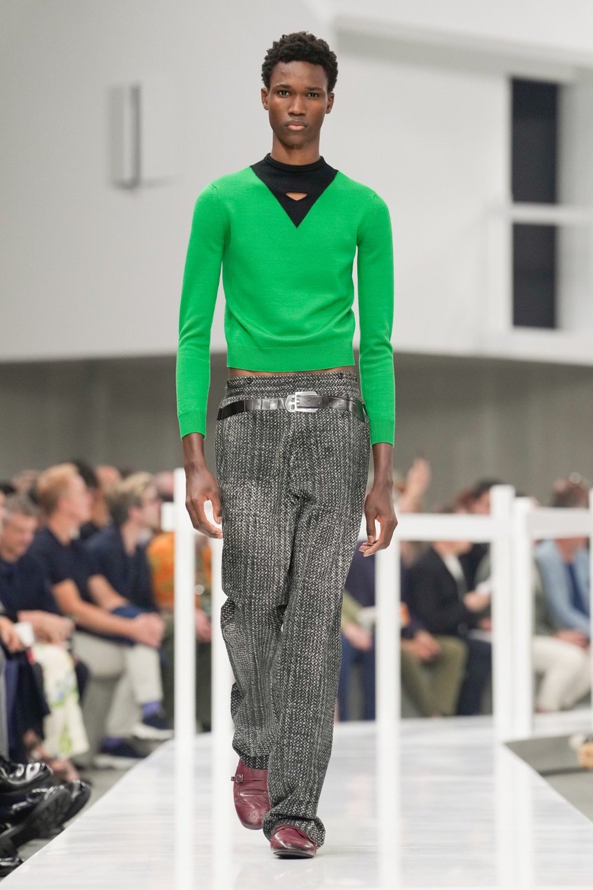 ジョナサン・アンダーソンもまた、「ファッションはシルエットへ」と声明を出すほどプロポーションを刷新することに目を向け、実践する稀代なデザイナーの一人。ハイウエストで作るIラインを提案したりと、毎シーズン新しいフォルムを生み出そうとしている。ロエベの2025年春夏メンズコレクションでは「A Radical act of Restraint(ラディカルな節度)」をキーワードに、様々なバリエーションを用意する中で、ウエストにスポットを当てたルックを発表。ファッションのコンテクストを読むことができる天才だからこその到達点か、プラダと同じ方向性のアイデアとして、ベルトバンドがへそ下にくる腰履きでベルトを2本スタイリングしたコーデを提案した。2本のベルトはトップスとパンツそれぞれに縫い付けられており、これまたウエストを露出するデザインに仕上げられている。
