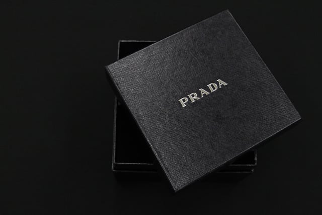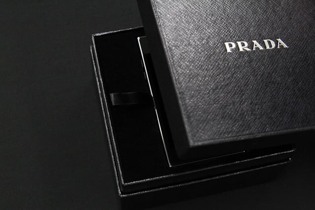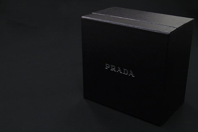 外箱はカーフレザー「サフィアーノ」をイメージした素材感を落とし込んでいるそれ自体が作品のような重厚感のあるボックス。部屋のインテリアとしても存在感を放つ作り込みはさすがの一言。「PRADA」の刻印は繊細ながらもしっかりと主張するシルバーで。