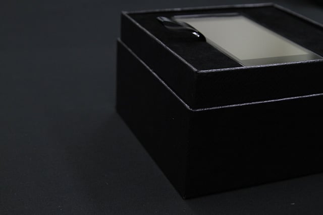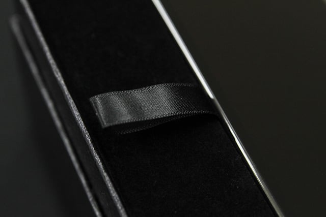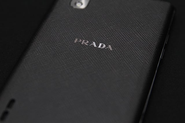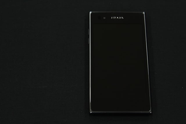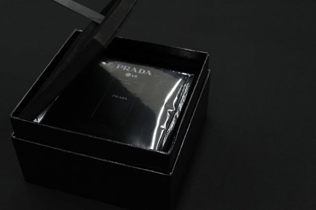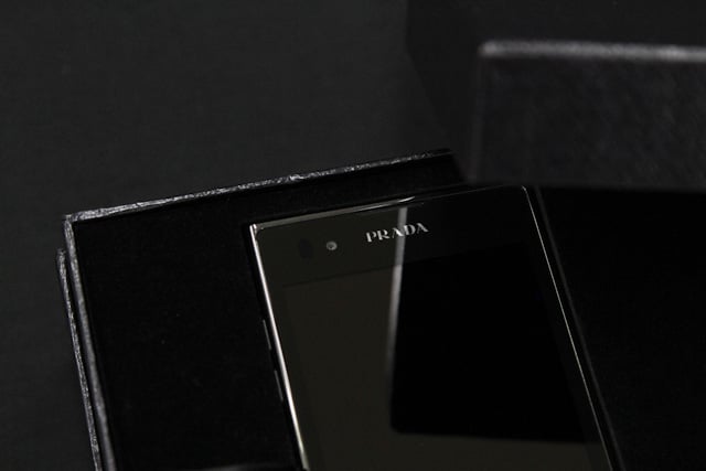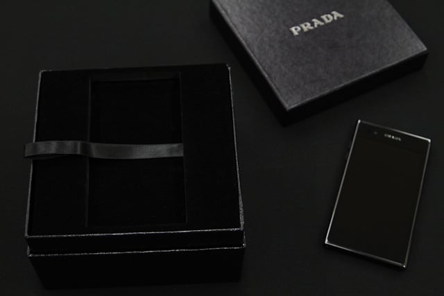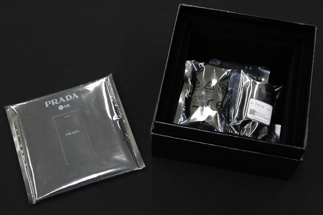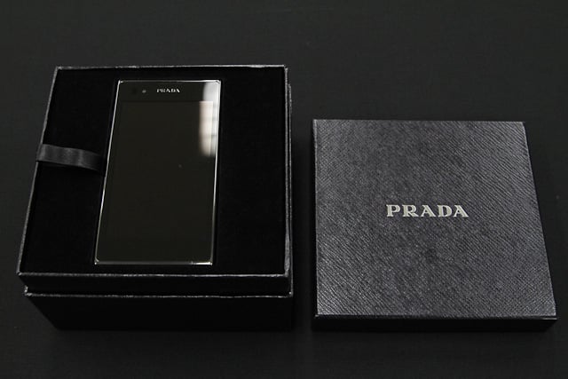 では、開けてみましょう。携帯電話とは思えない高級感を放っていますね。「PRADA」のエンブレムが上部にしっかりと鎮座しています。横にはリボンで作られた"つまみ"が付いているので、取り出しは簡単。ブラックカラーで統一された洗練されたデザイン。