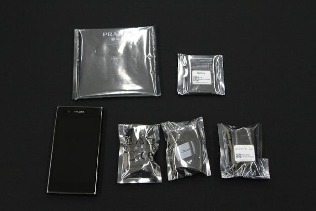 ベルベット調の中敷の下には、付属品が収められています。黒で統一されたコンパクトな取説(クイックスタートガイドというそう)。取説の他、電池パックL16、ACアダプタ L03、USB接続ケーブルL02、そしてPRADA Earphoneが入っていました。