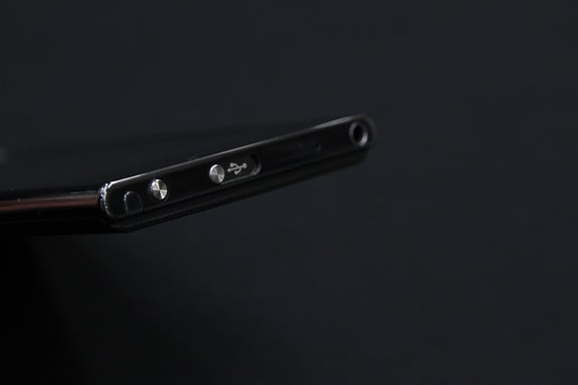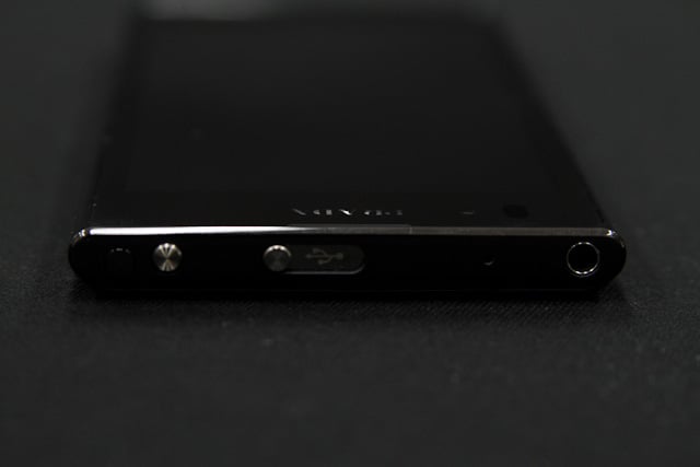 本体は、高さ約128mm×幅約69mm。細部まで造形美を追究しています。ボディは8.9mmと極薄です。本体上部には、写真左からイヤホンマイク端子、上部マイク、microUSB接続端子、電源キー/画面ロックキー、そしてワンセグアンテナが付いています。端末上部のmicroUSBポートはスライドさせると充電アダプターやPCと接続できます。外部ストレージとしても接続できるので写真や仕事のファイルなども持ち歩けます。