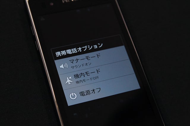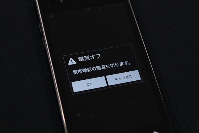 ということでそろそろ電源を切りましょう。電源キーを長押しすると出てくるのは、「携帯電話オプション」。一番下の「電源オフ」をタッチすると、「電源オフ」画面に。「OK」を押すと、終了時にアニメーションが流れ「PRADA」ロゴが離れて行きます。