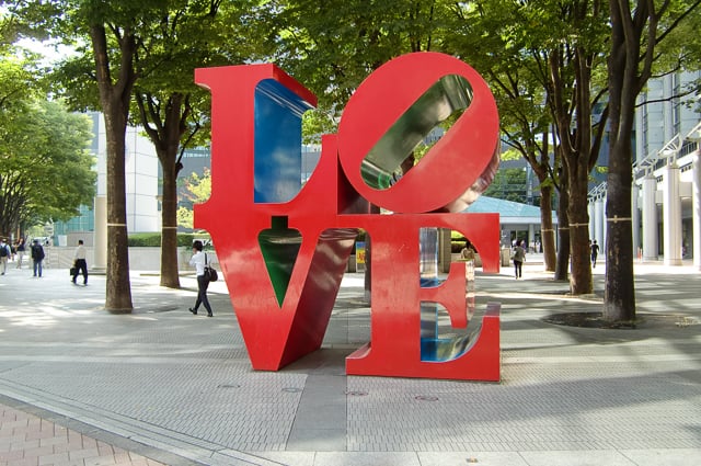 「電車男」「GTO」「理想の結婚」など、数々のテレビドラマに登場した有名なこちらの作品は、ロバート・インディアナ氏によるもの。ニューヨークを始めとした世界の大都市に同じデザインの彫刻が設置されていて、毎年冬には、奥の広場でクリスマスイルミネーションが開催されます。