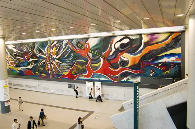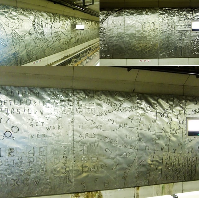 20世紀に生産されてきた工業製品のスクラップを素材として使用したこの作品は、樋口正一郎氏によるもの。現代文明をパノラマ状に表現しています。1番線側は「人の愛」、4番線は「都市の再生」がテーマ。一面鉄で覆われたホーム壁面には、よく見ると車や文字が描かれています。電車を待っている間にぜひ鑑賞したいですね。
