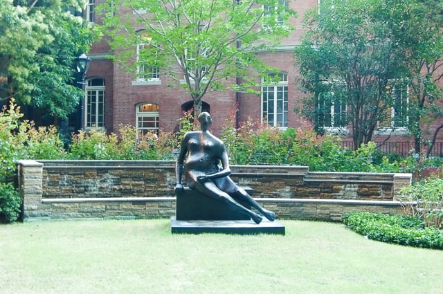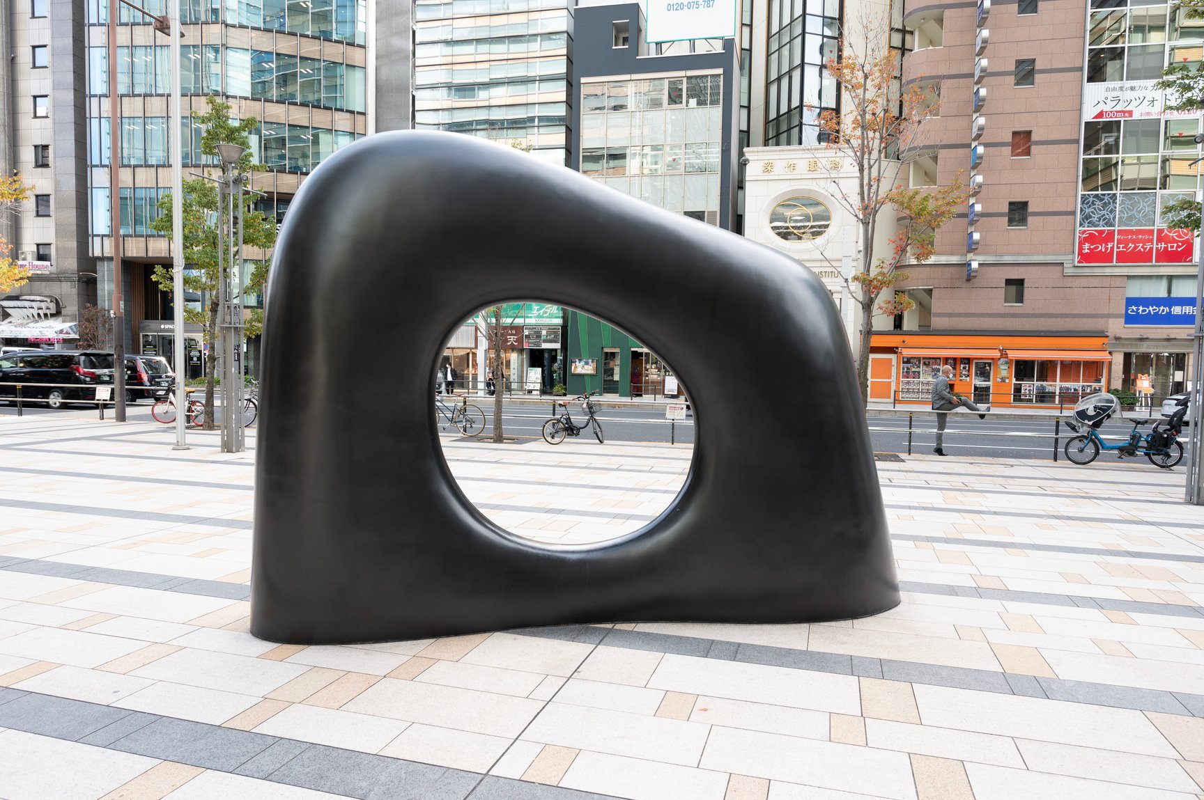 三菱地所と箱根彫刻の森美術館が、芸術性豊かなまちづくりを目指して開発した丸の内トリートギャラリーの中の一点。お腹が少し膨らんだ形は、子どもを身ごもっている女性を表しており、妻が妊娠していた時の姿を想像して制作されたと言われています。作者は、イギリスの芸術家 ヘンリー・ムーア氏です。