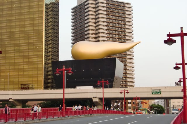 アサヒビール本社ビルの隣にあるスーパードライホールの屋上に設置されたオブジェは、見たら絶対に忘れない存在感のある形をしていますよね。実は、燃え盛る炎をイメージしてデザインされたもので、「スーパードライ」の名前とは対照的に、アサヒビールの燃える心を象徴しているそうです。デザインしたのは、アランミクリと共同でアイウェアブランド「スタルクアイズ」を手掛けるフィリップ・スタルク氏。
