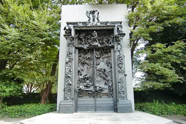 パリ、チューリッヒなど、世界には8体の「地獄の門」があり、国立西洋美術館に置かれているものは初期の作品と言われています。門の上部には、縮小版の「考える人」が。美術館前の広場には、他にも有名なフランソワ=オーギュスト=ルネ・ロダン氏の作品が展示されています。