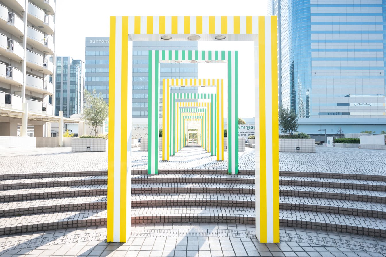 お台場海浜公園に立つオレンジやグリーン、イエローのストライプの門は、ダニエル・ビュレン氏による作品。海辺に映えるカラフルな姿は、思わず写真に収めたくなってしまいますね。