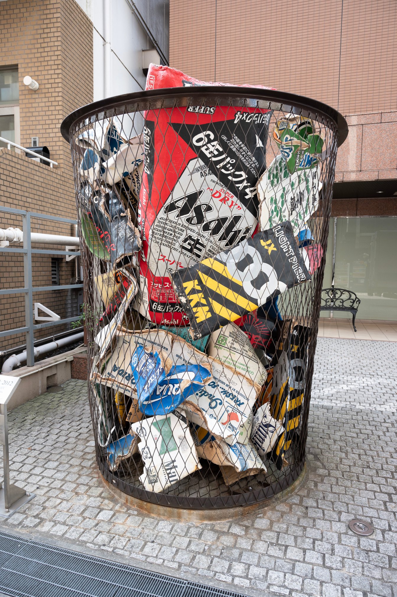 品川駅港南口の東横イン前に設置されたこちらの作品、一見すると普通のゴミ箱ですが、サイズが特大です。中身は馴染みのあるタバコやお酒のパッケージなので間違えてゴミを捨ててしまわないよう注意です。現代アーティストの三島喜美代によって制作されました。