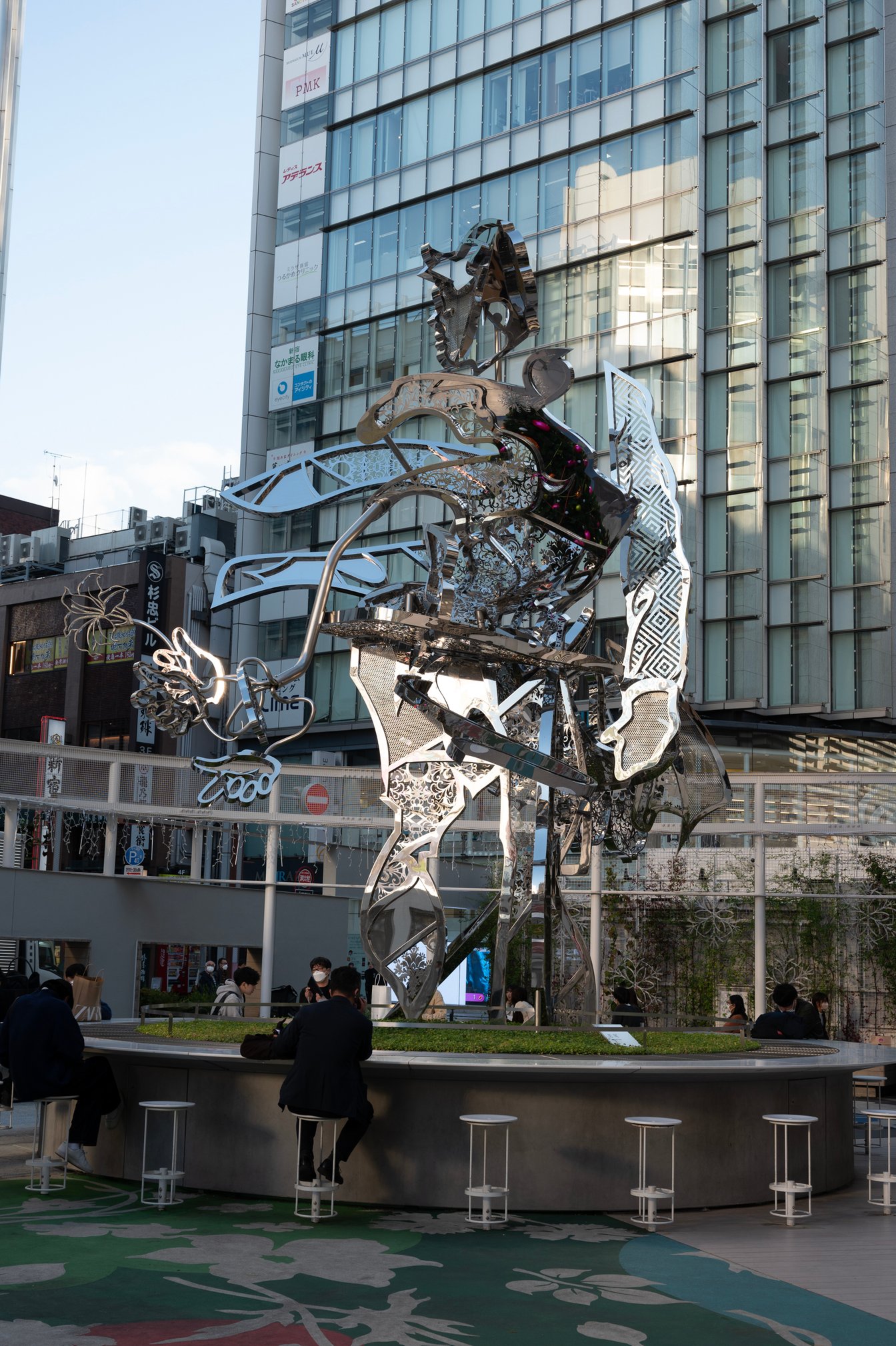 日本を代表する繁華街・新宿の玄関口に光る、近未来的なオブジェ。一見すると何の形を模しているのかわかりませんが、作者の松山智一氏によると、この巨大アートは「花束を持っている少年」をモチーフにしているそうです。周辺には、カラフルな花のグラフィックをあしらったランドアートが広がっています。