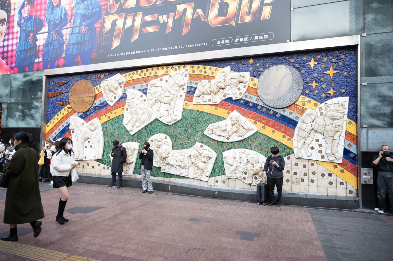 渋谷駅ハチ公口の待ち合わせスポットとして知られる巨大壁画。北原龍太郎氏によるこちらのアートは、1990年にこのエリアが「渋谷区北口広場」から「ハチ公前広場」に名称を変更したことを記念した作品です。カラフルな虹を背景に、信楽焼の陶板レリーフで制作された忠犬ハチ公や子犬が並んでいます。忠犬ハチ公といえば寂しげなイメージがありますが、家族に囲まれる様子を見ると温かい気持ちになりますね。