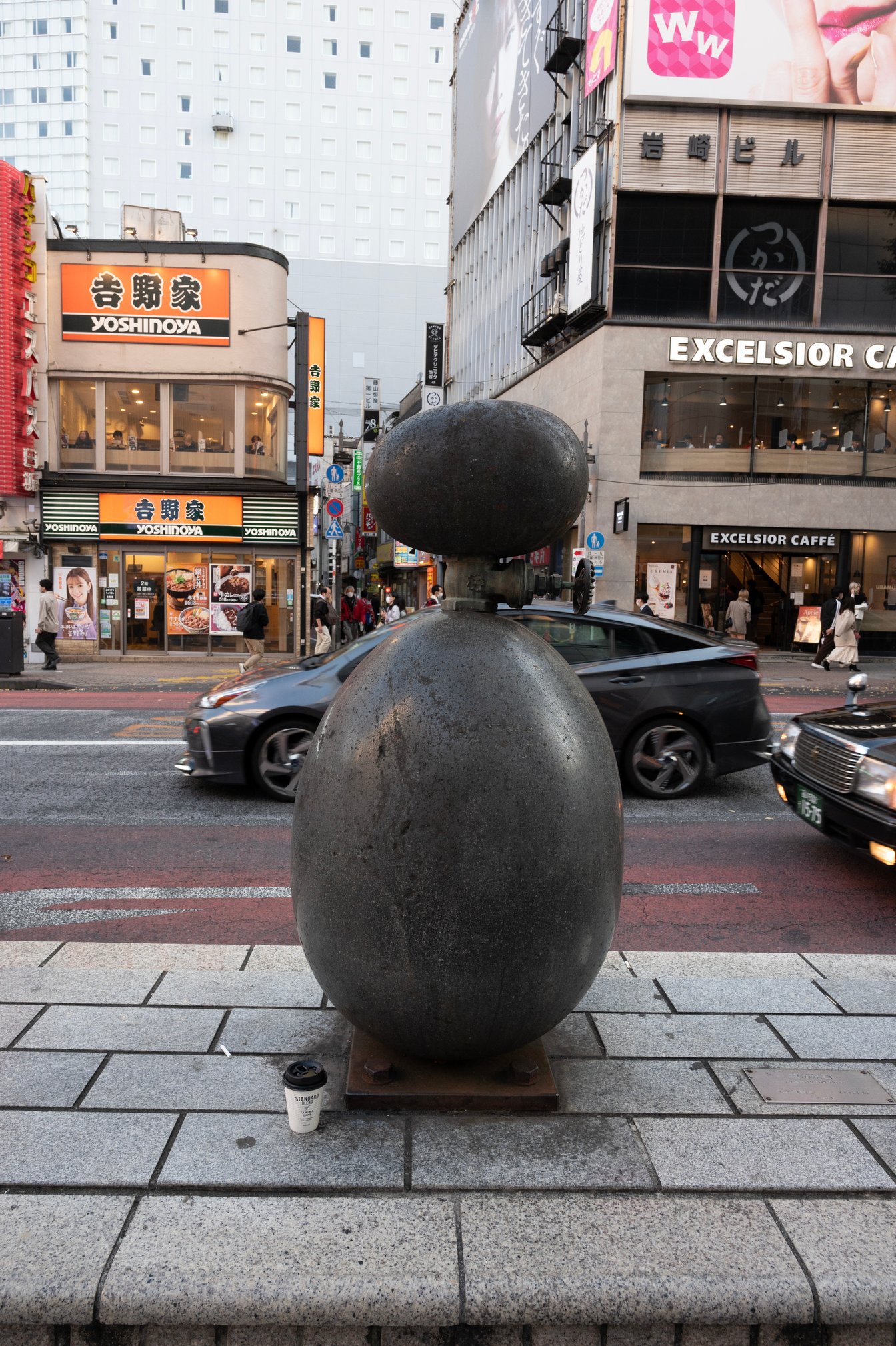 渋谷109前に設置された大木達実氏の彫刻作品。大小2つの球体を雪だるまのように重ね、ネジで止められている姿が印象的です。一見するとボウリングのピンや、小型ロボットのようにも見えます。
