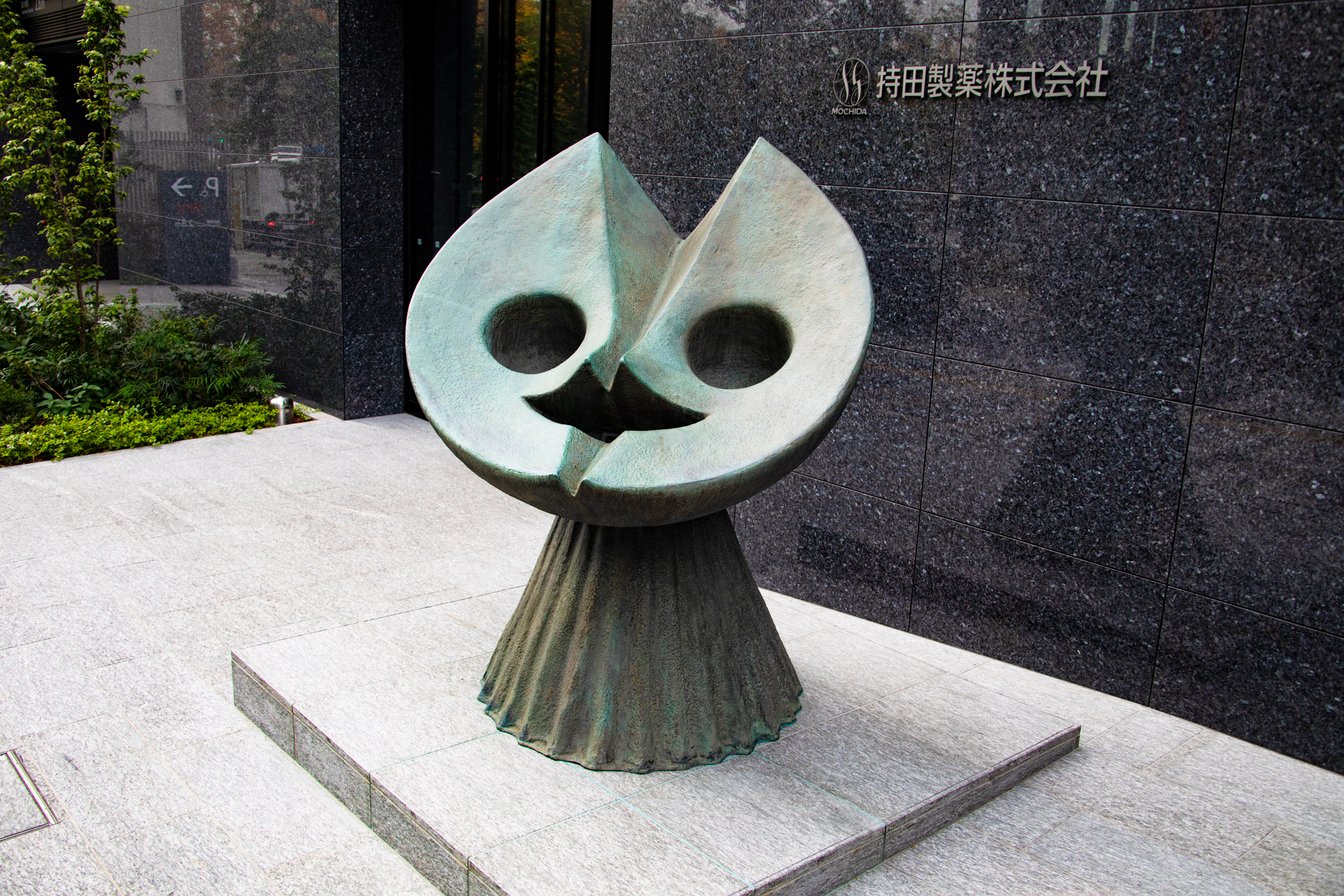 そっぽを向いたてるてる坊主のように見えるこちらは、岡本太郎氏の作品。上を見上げて笑っている表情は、マスコットキャラクターのように可愛らしく、タイトルの「歓び」を表現しているように見えます。1978年に持田製薬株式会社の創業65周年を記念して本社ビル正面に設置されました。