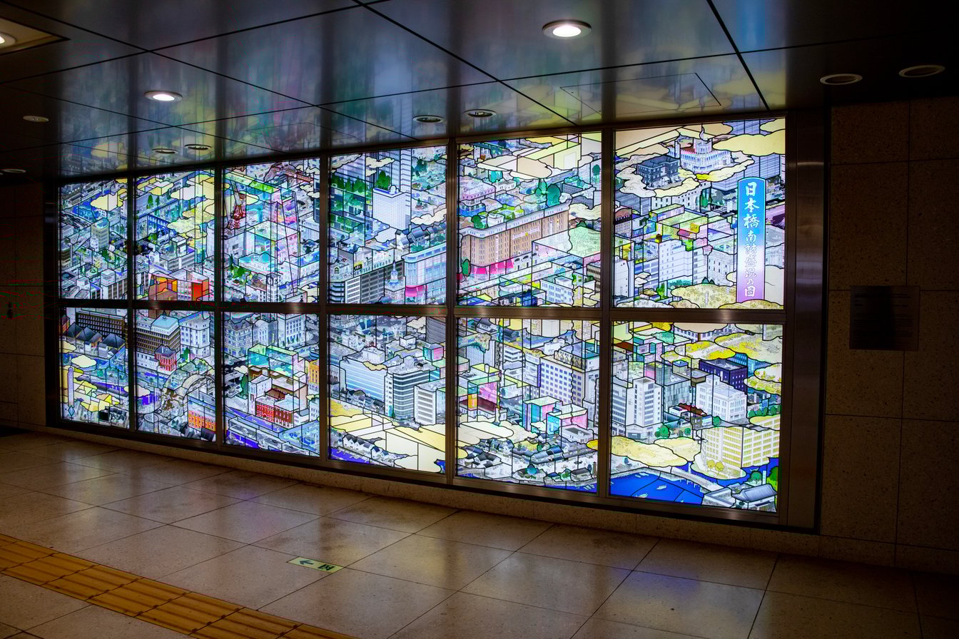 銀座線日本橋駅のB1出口付近には、大型のステンドグラスが。画家の山口晃氏によるもので、日本橋南詰の街並みの変遷が日本の伝統的な絵画の様式で表現されています。忙しない駅構内ですが、じっくり鑑賞したくなってしまうほどの細かさです。