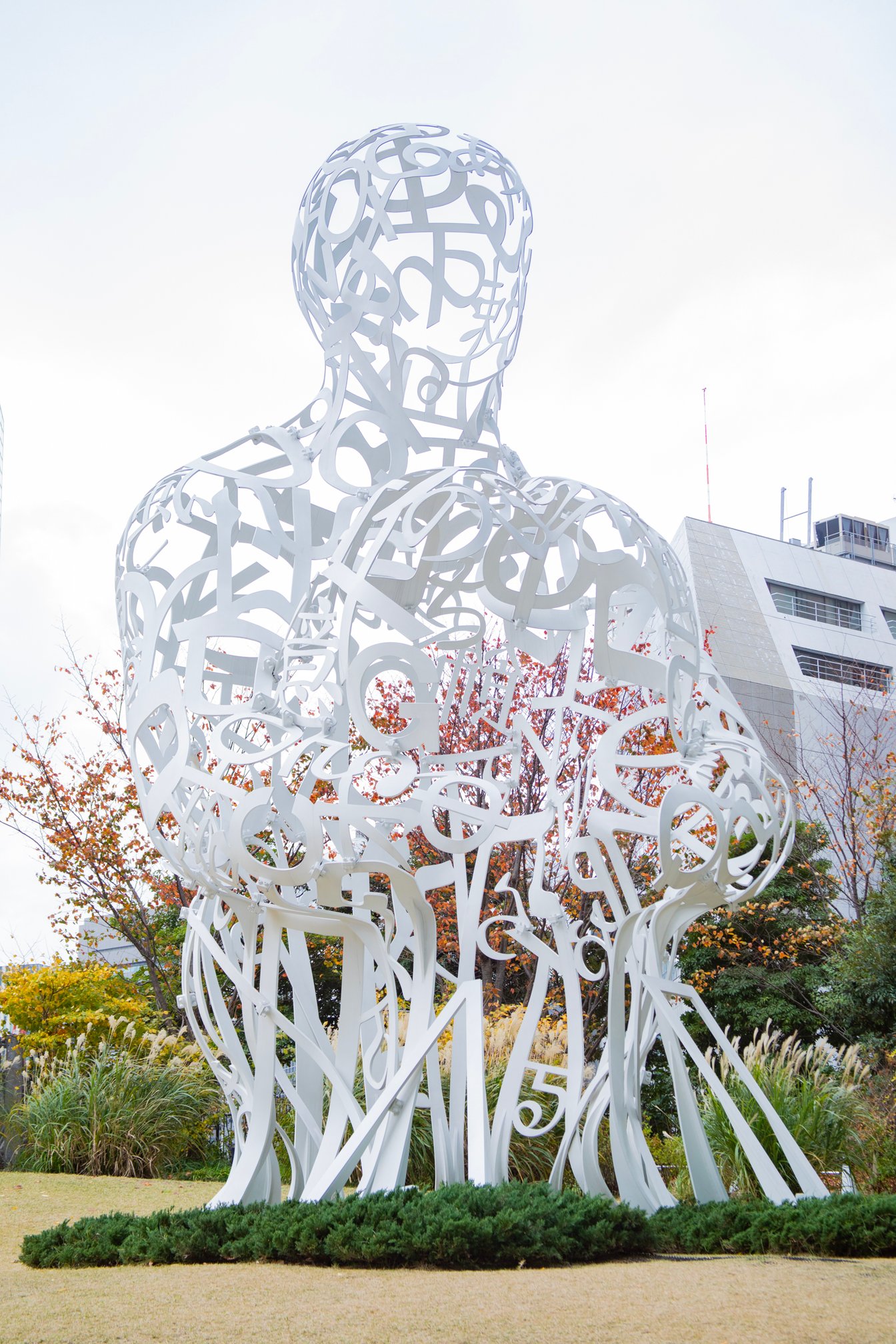木の根から生えたような人の形を模した巨大なアート作品。よく見ると日本語と中国語、アラビア語、ヘブライ語、ラテン語、ギリシャ語、ヒンディー語、ロシア語の8言語の文字が使用されています。体育座りをする人間の形には、作者のジャウメ・プレンサ氏の「誰もが内側に美しさを秘めていて、人の内側や内面に目を向けて欲しい」という思いが込められています。目は描かれていませんが、空を見つめているような顔にも注目です。