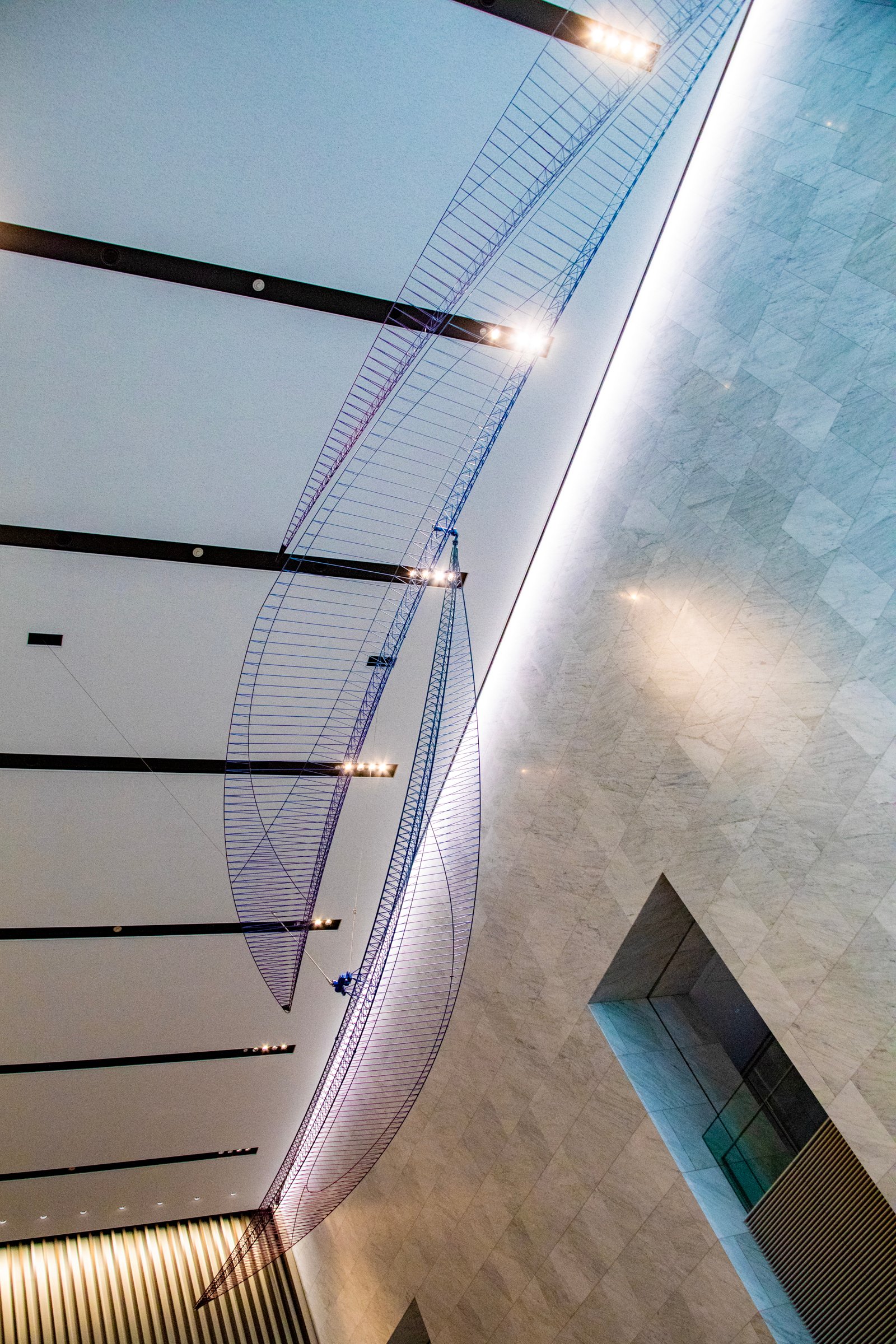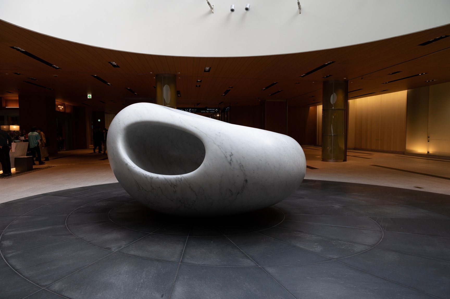 オーク表参道のオフィスエントランスの天井には、氷柱を思わせるモチーフが。杉本博司氏による三次関数の数式を立体化した数理模型で、双曲線が交わる点が無限点に設定されていることから、仏教用語で「究極」を意味する「究竟」をタイトルに冠しました。緻密な数式をもとにしているからか、洗練された雰囲気が感じられますね。