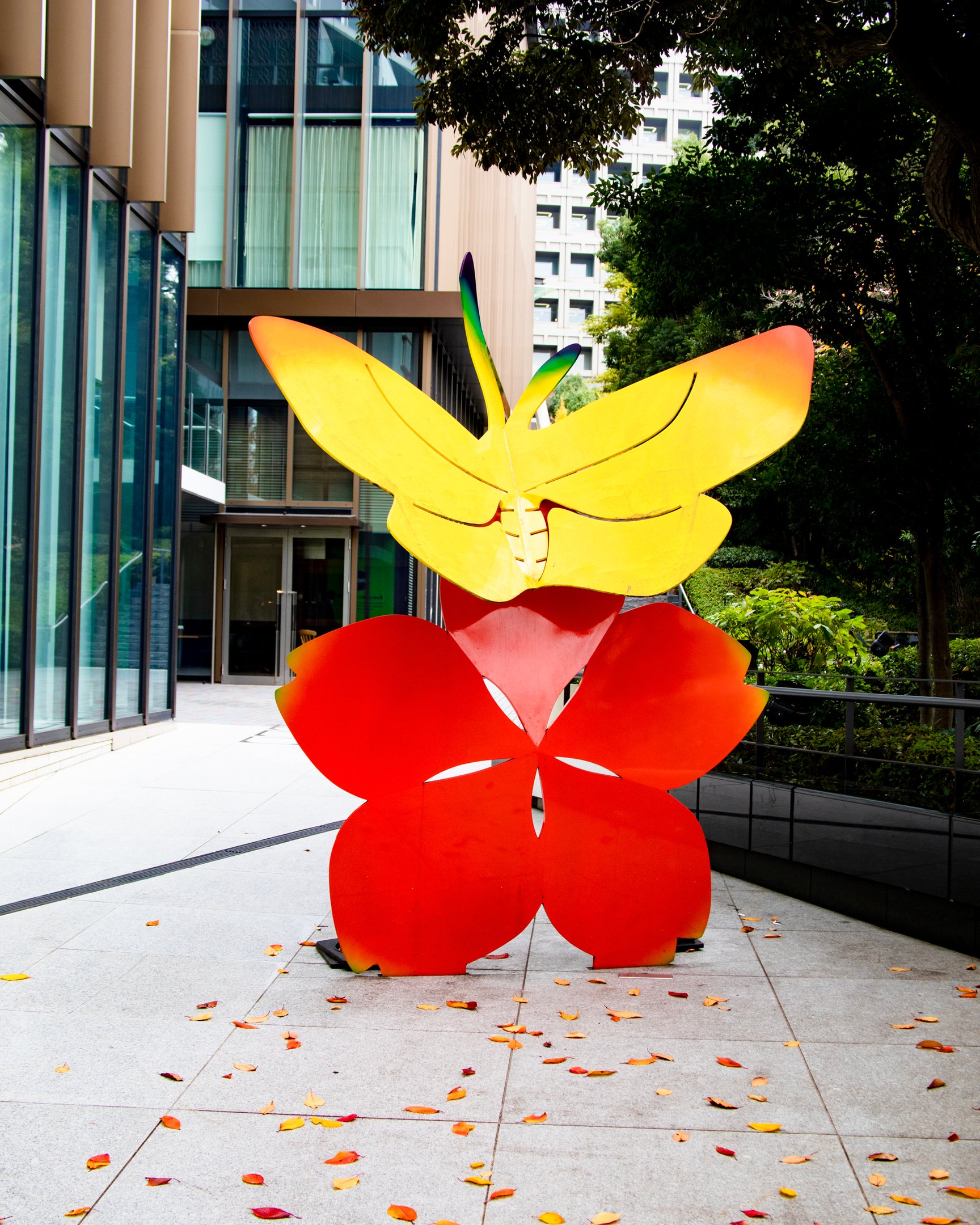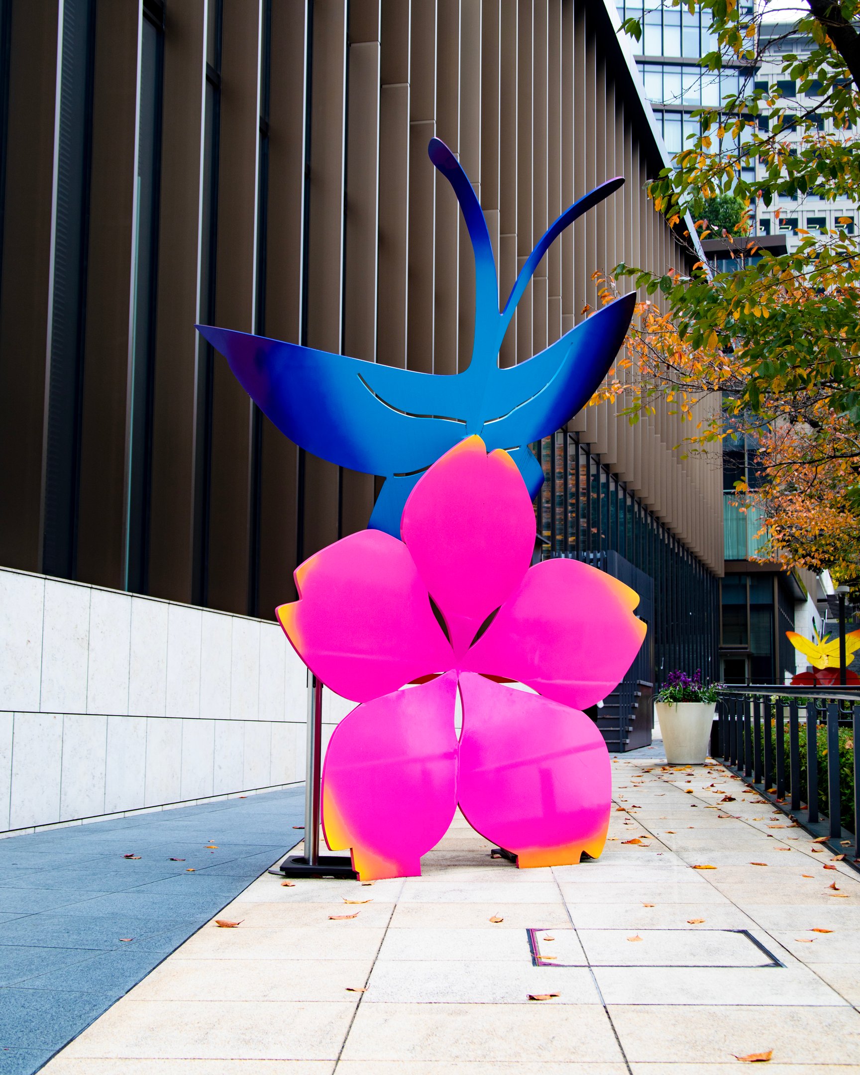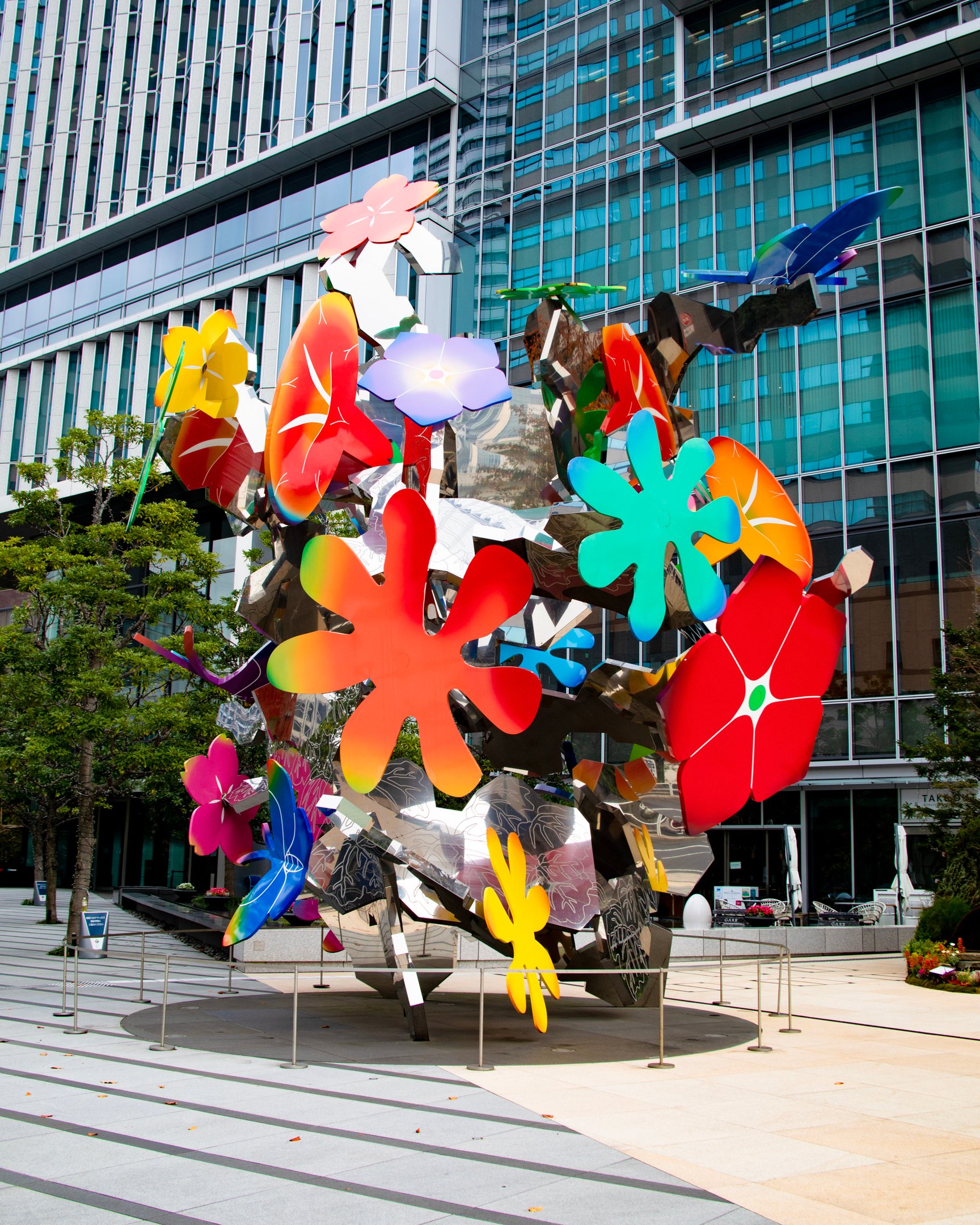 紀尾井タワーの入り口には、大巻伸嗣氏によるカラフルな花のオブジェ「Echoes Infinity ~Immortal Flowers~」が設置されています。トロピカルな雰囲気のお花を集めた同作品は、見ているだけで元気がもらえます。