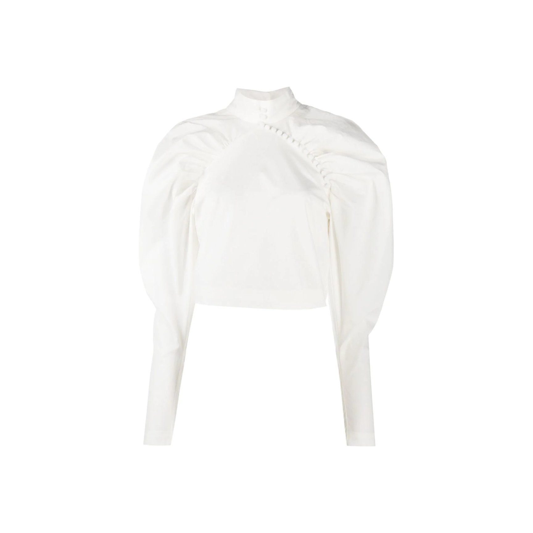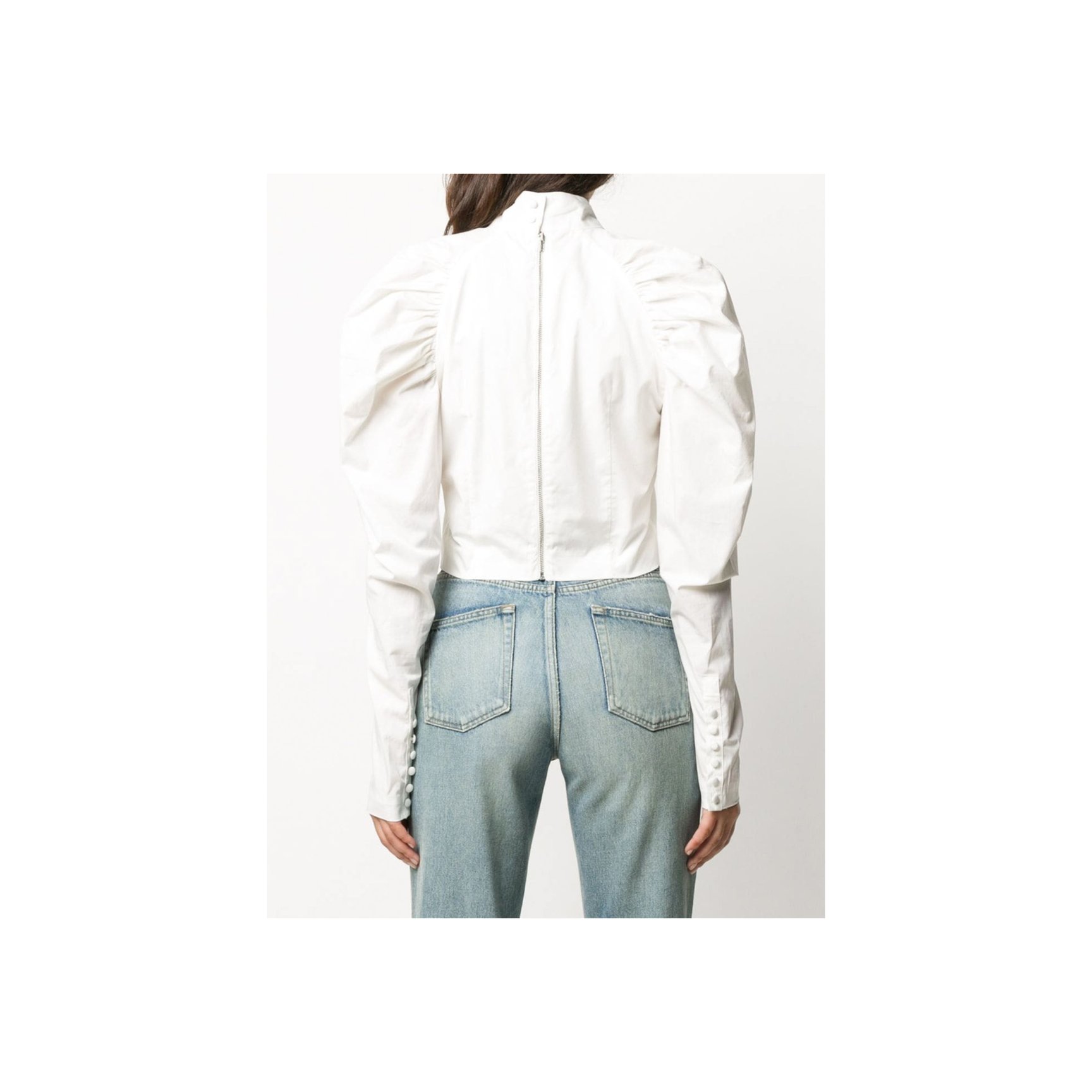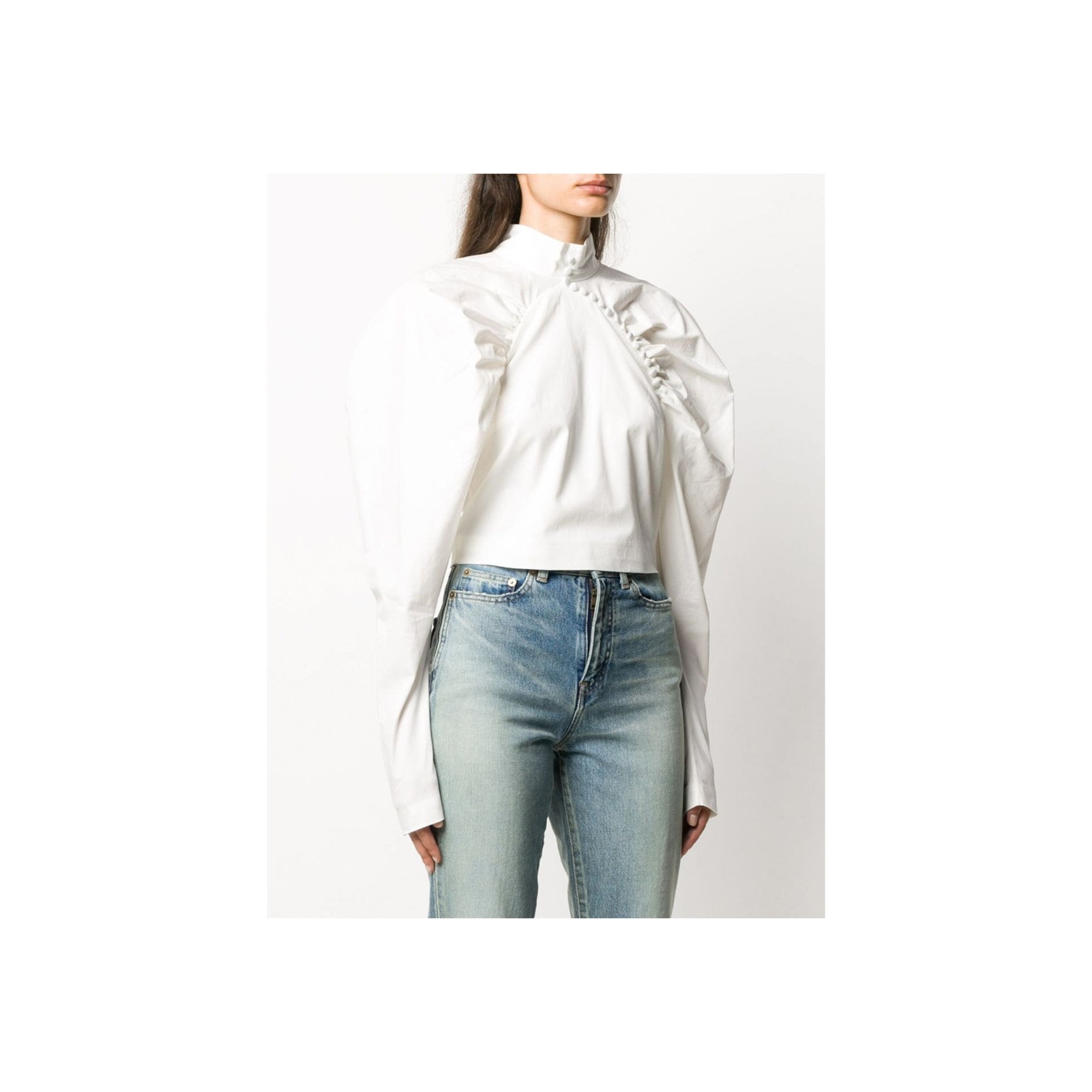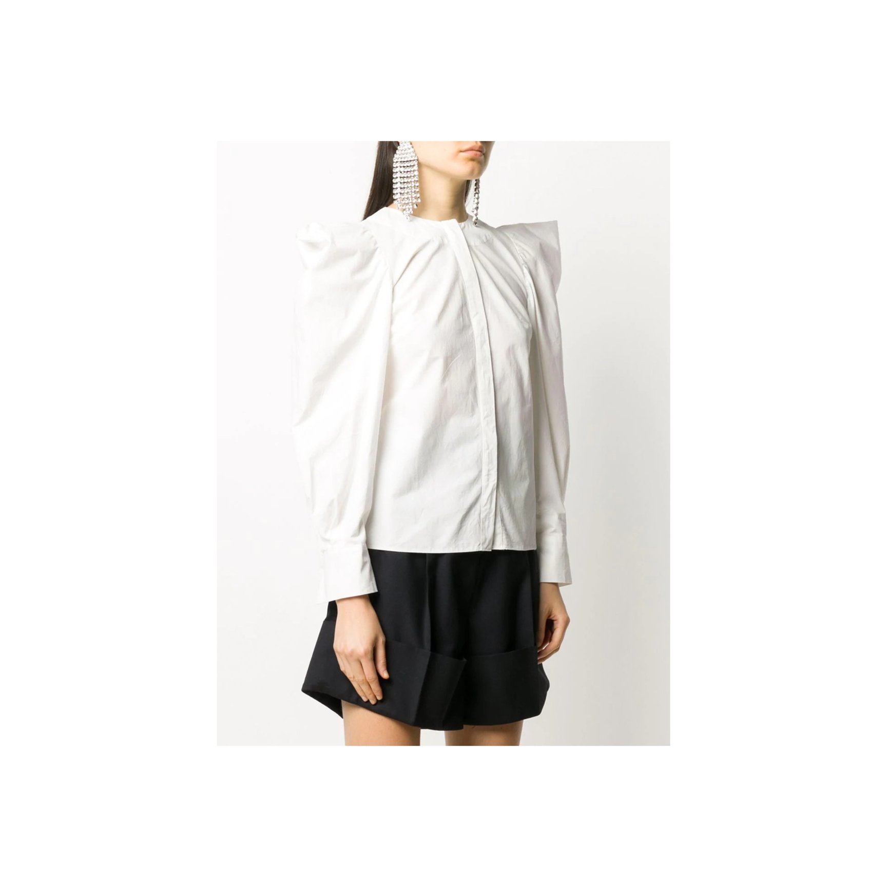 コペンハーゲン発「ロテート(ROTATE)」のホワイトシャツは、ボリュームたっぷりなひじ上と、タイトなひじ下のコントラストが新鮮。スタンドカラーや、胸元に斜め一列にあしらわれた丸ボタンがチャイナトップスのような雰囲気も。長めの袖口もポイント。