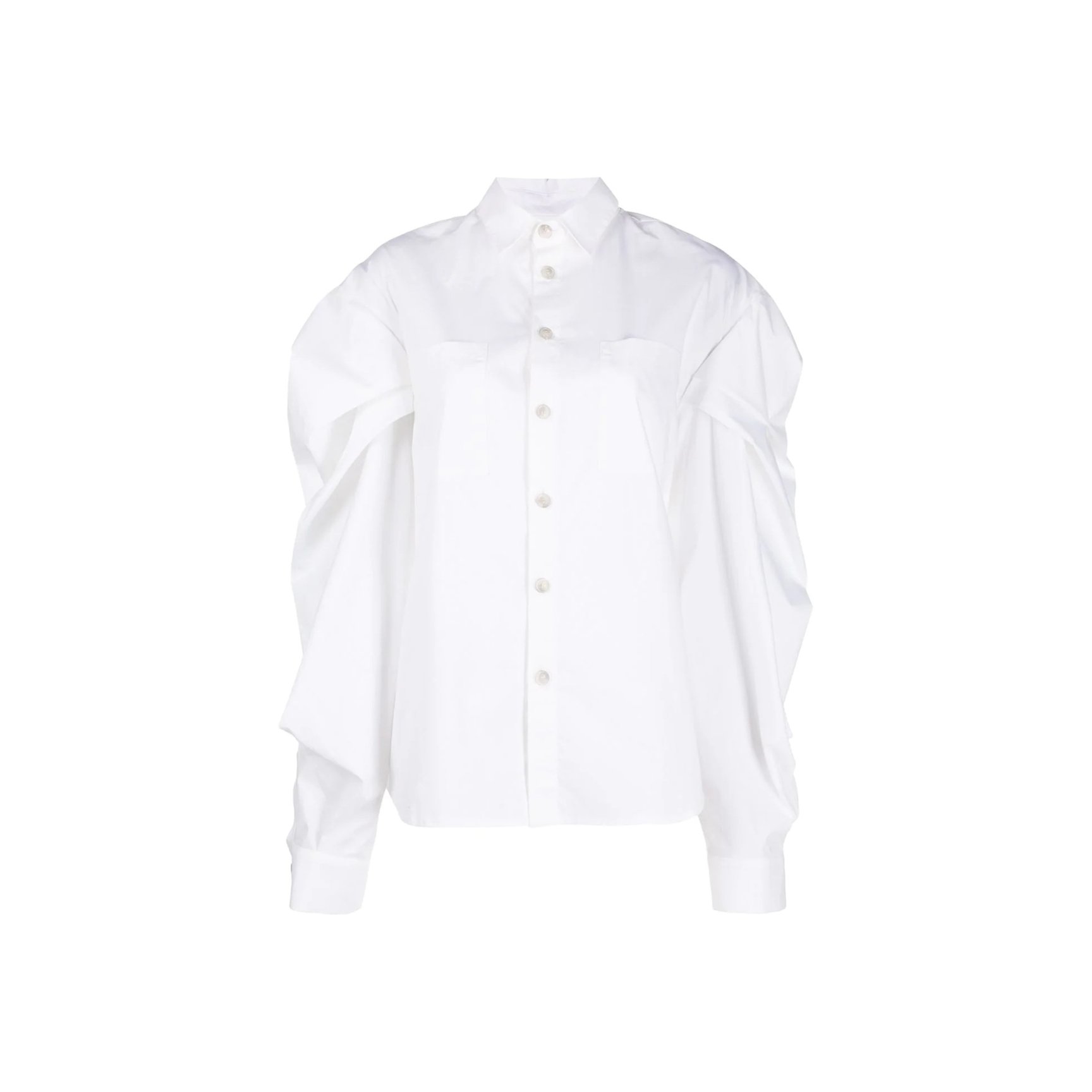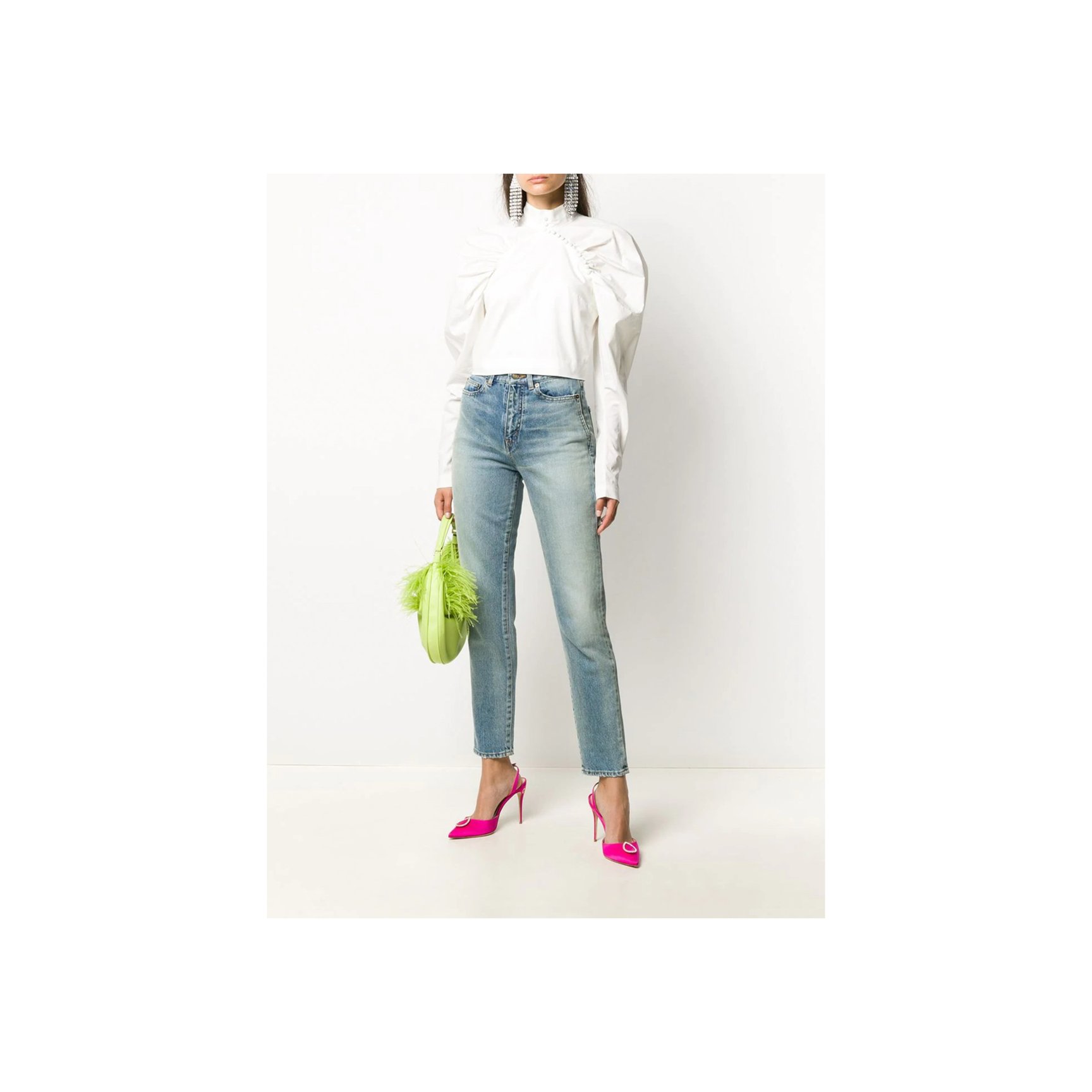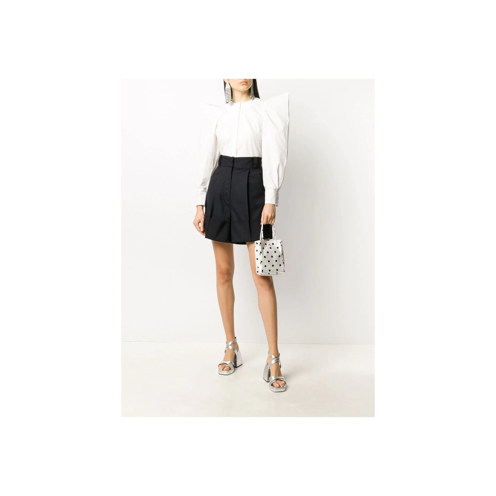 コペンハーゲン発「ロテート(ROTATE)」のホワイトシャツは、ボリュームたっぷりなひじ上と、タイトなひじ下のコントラストが新鮮。スタンドカラーや、胸元に斜め一列にあしらわれた丸ボタンがチャイナトップスのような雰囲気も。長めの袖口もポイント。