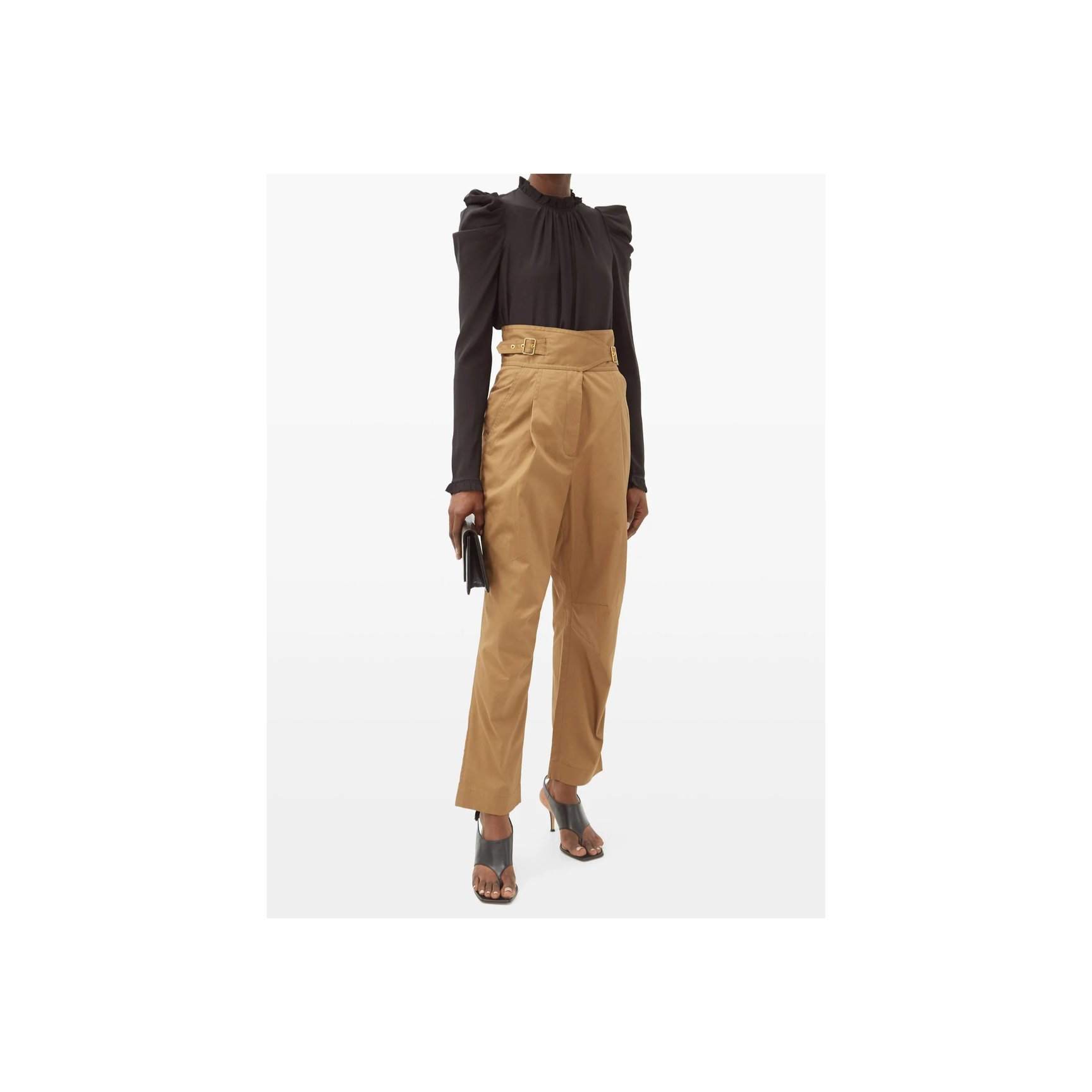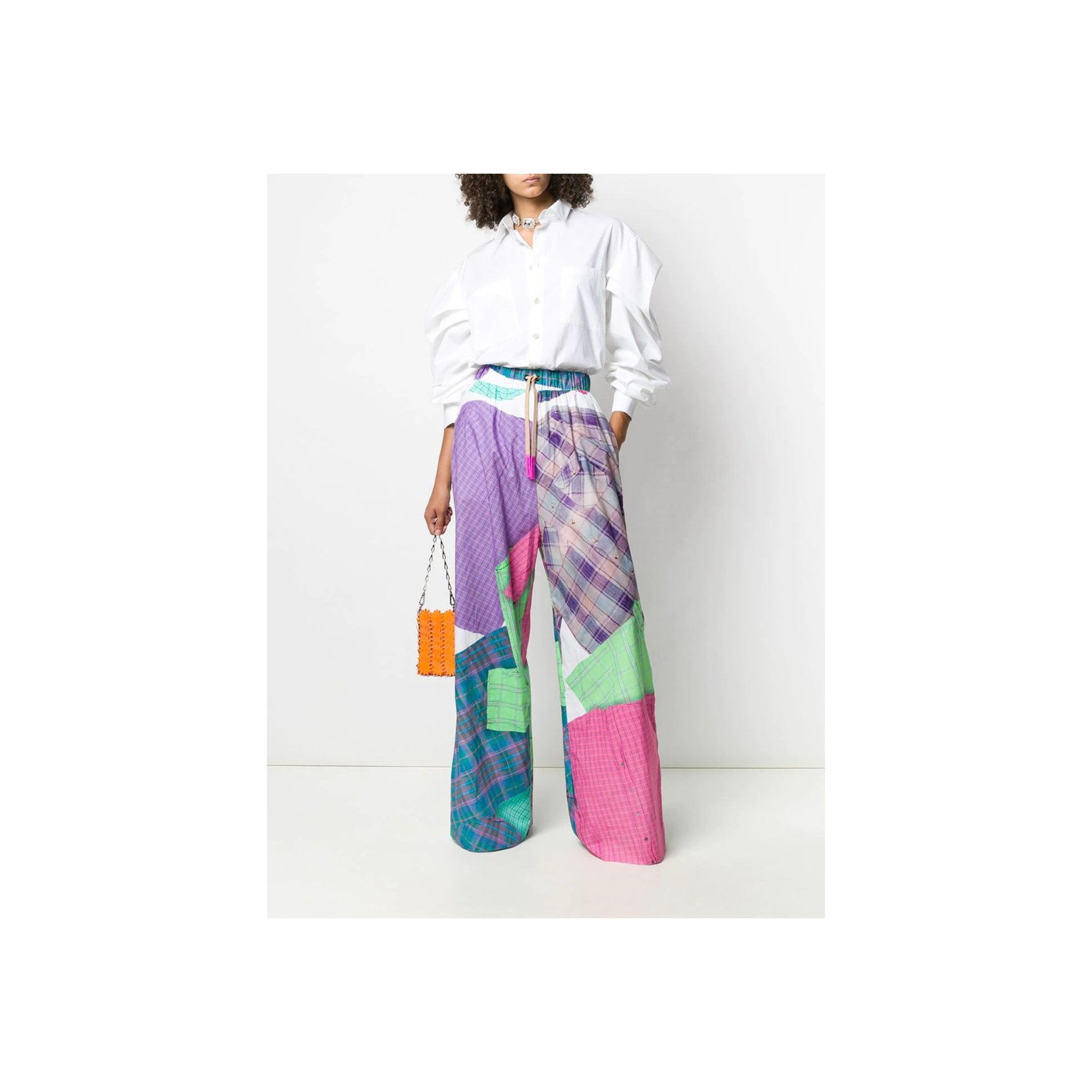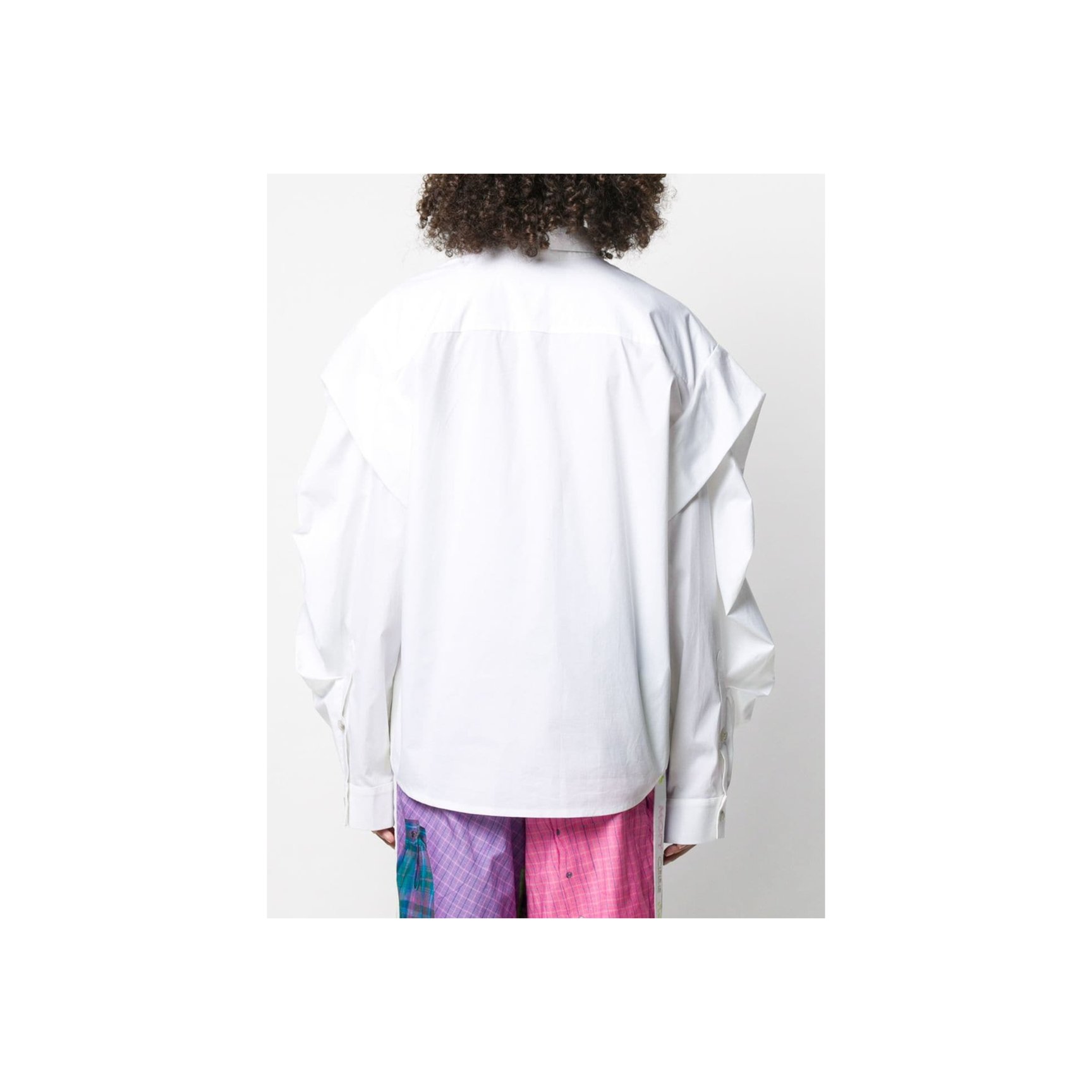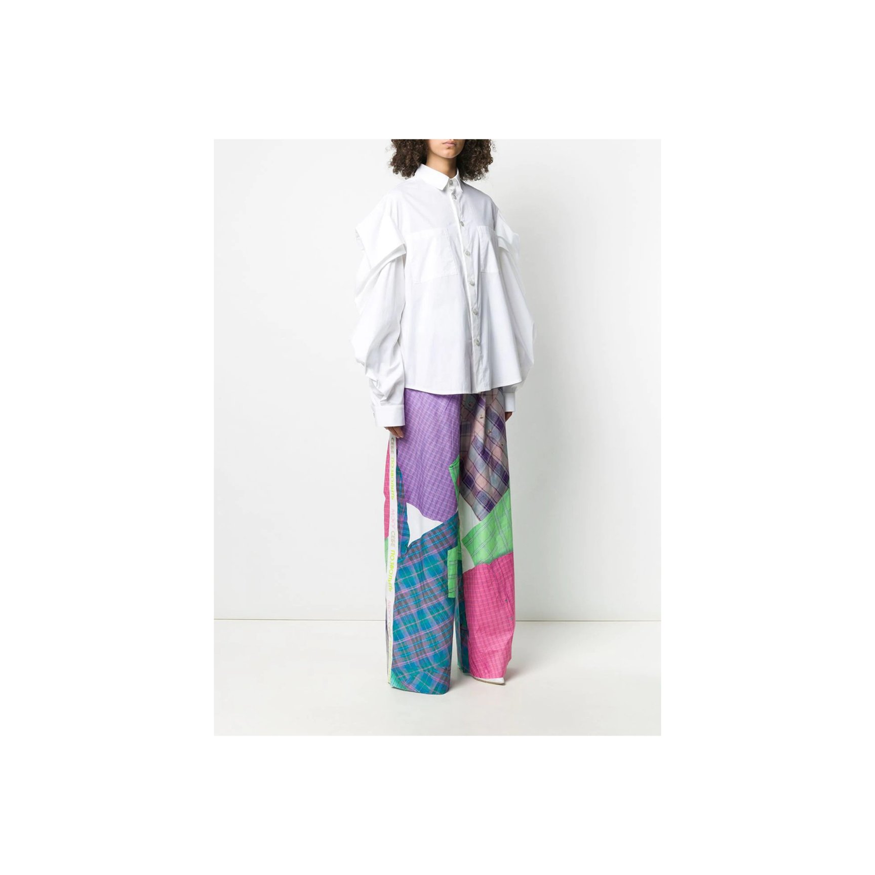 コペンハーゲン発「ロテート(ROTATE)」のホワイトシャツは、ボリュームたっぷりなひじ上と、タイトなひじ下のコントラストが新鮮。スタンドカラーや、胸元に斜め一列にあしらわれた丸ボタンがチャイナトップスのような雰囲気も。長めの袖口もポイント。