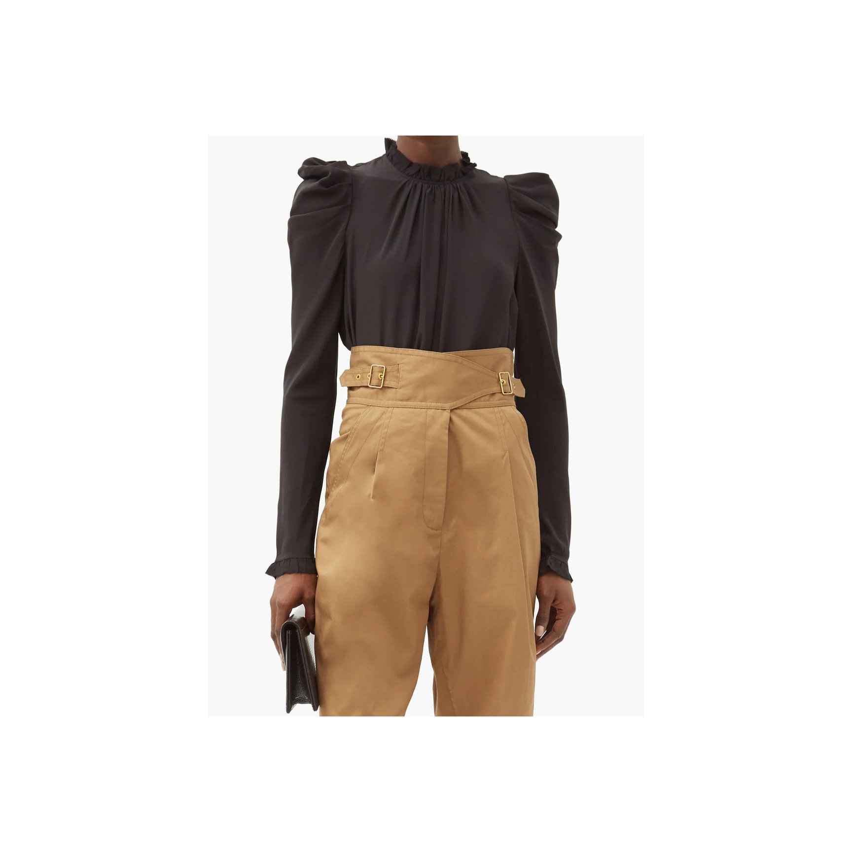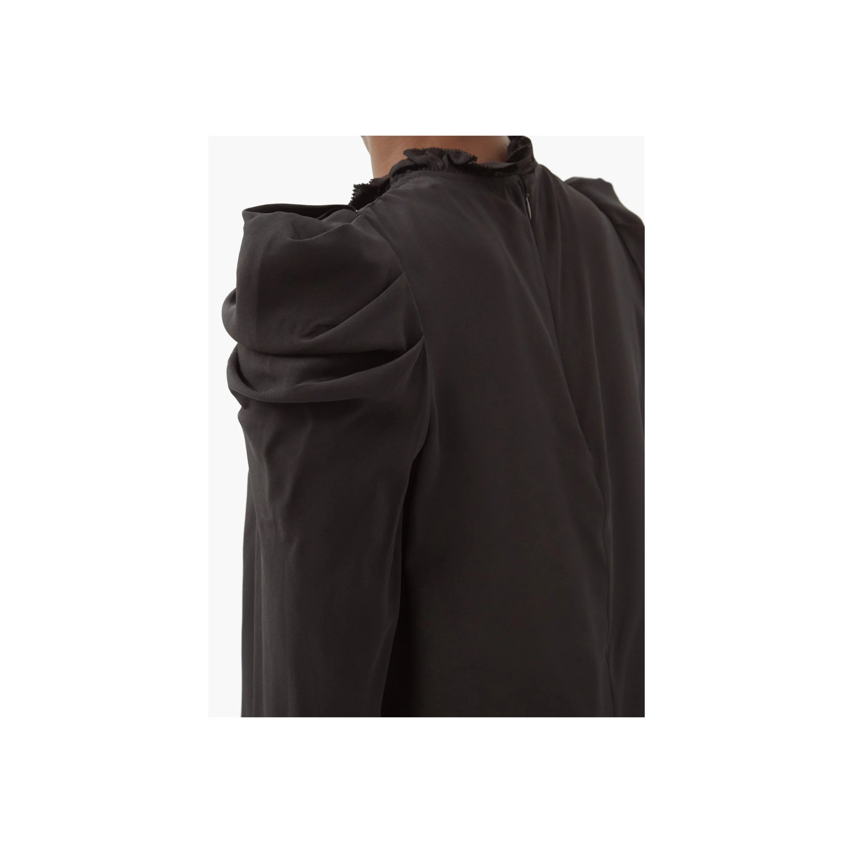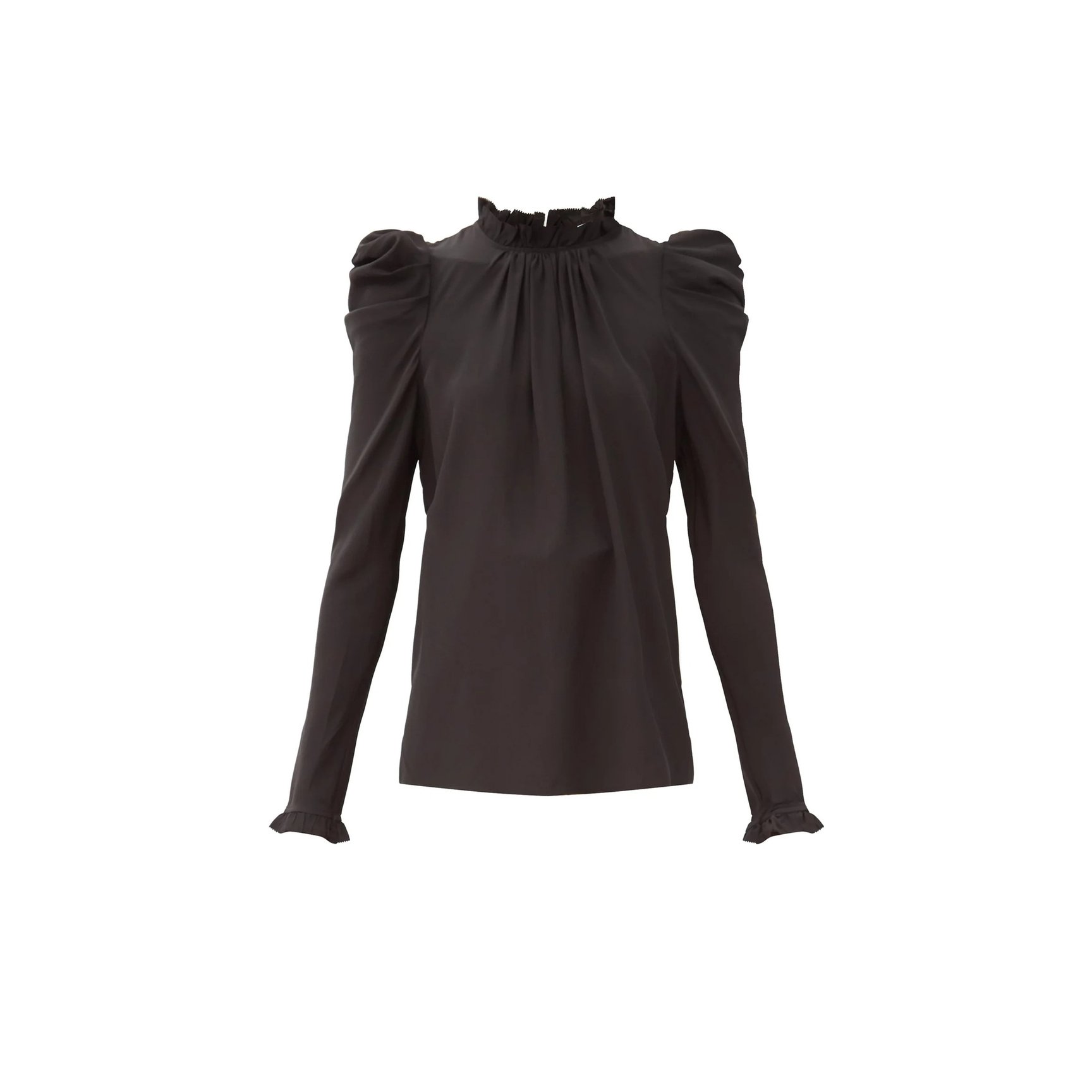 「ジマーマン(Zimmermann)」のシルク100%のハイネックトップス。細かなラッフルディテールと、ゆるやかなギャザーディテールがエレガント。リラックスフィットなボディと比べ、スリーブ部分はややタイトです。