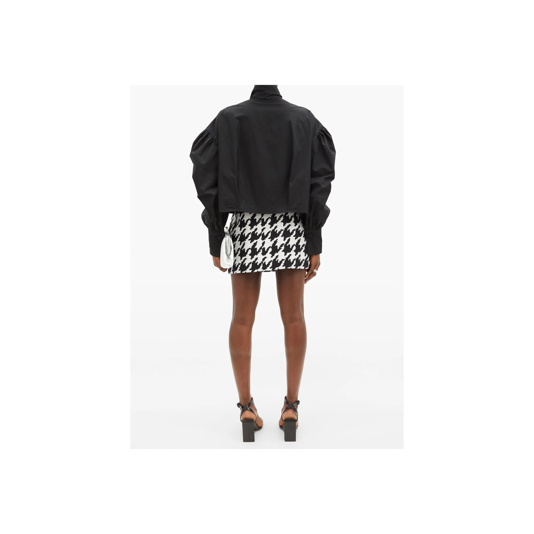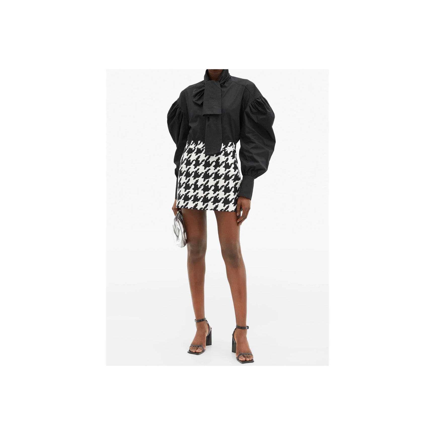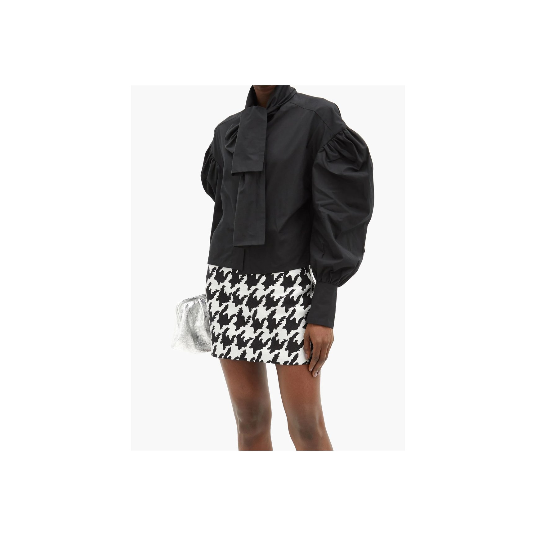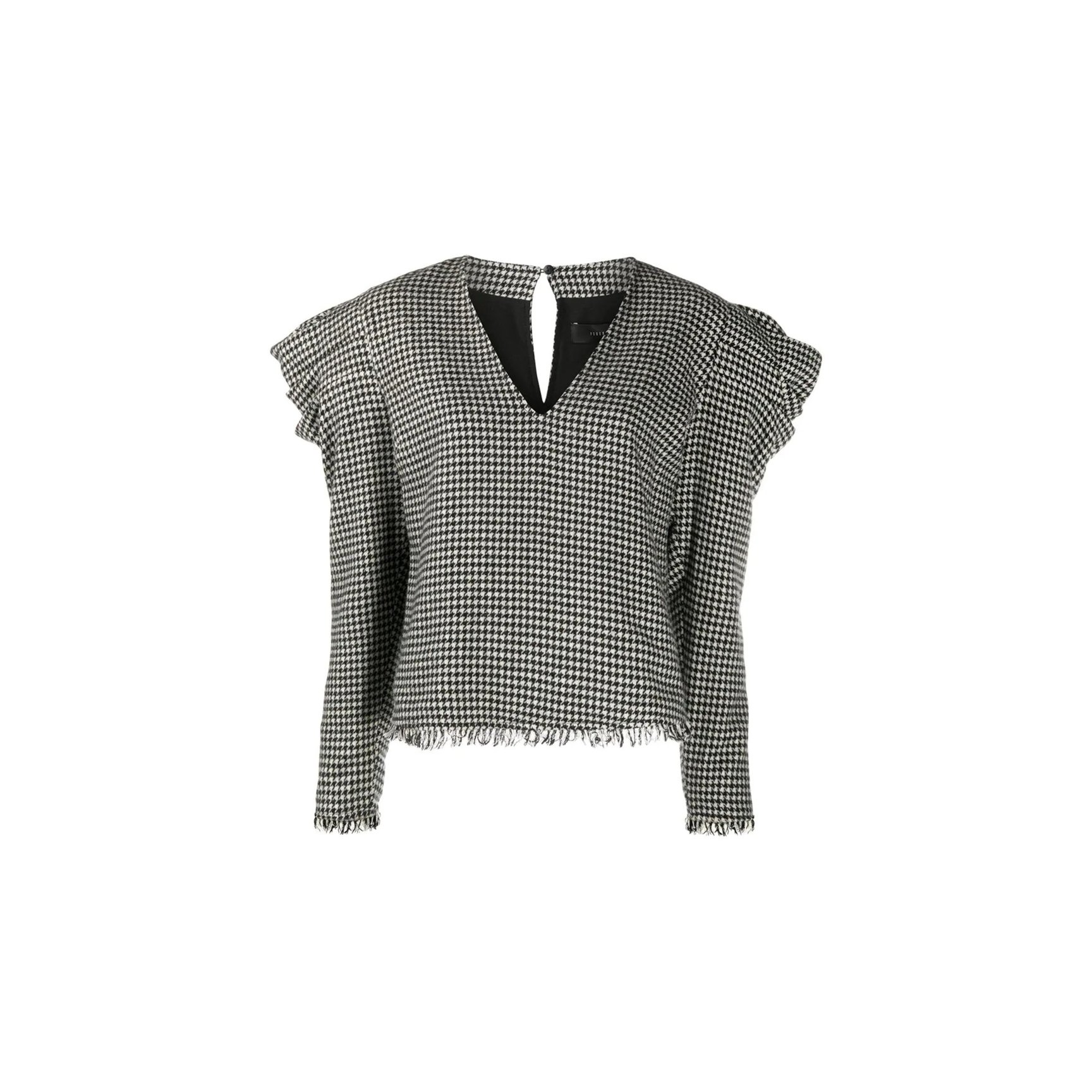 「フェデリカ トシ(Federica Tosi)」のハウンドトゥースチェックのトップス。モノトーンなので、柄×パフスリーブに初挑戦の人にもおすすめ。袖とヘムラインはフリンジ仕様。