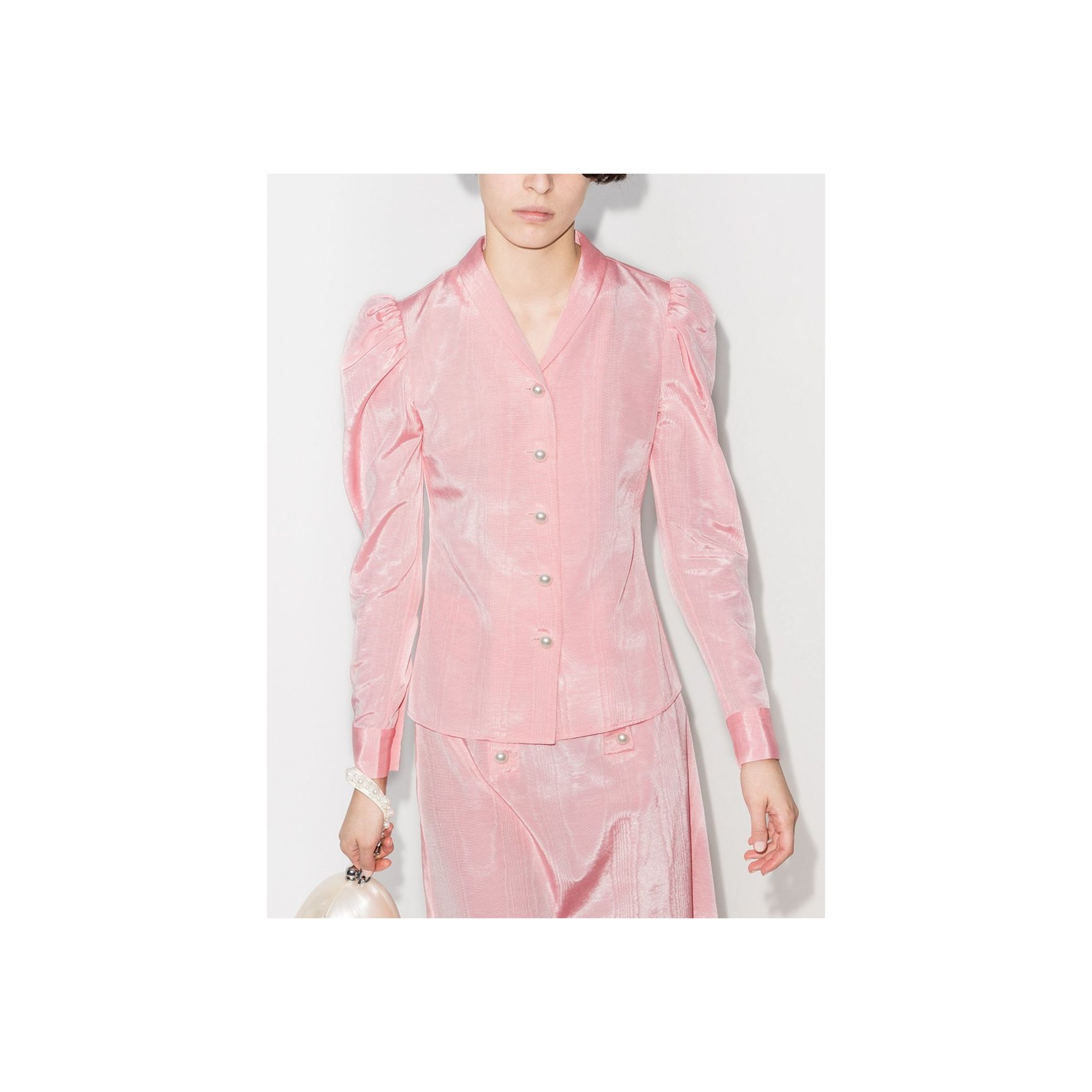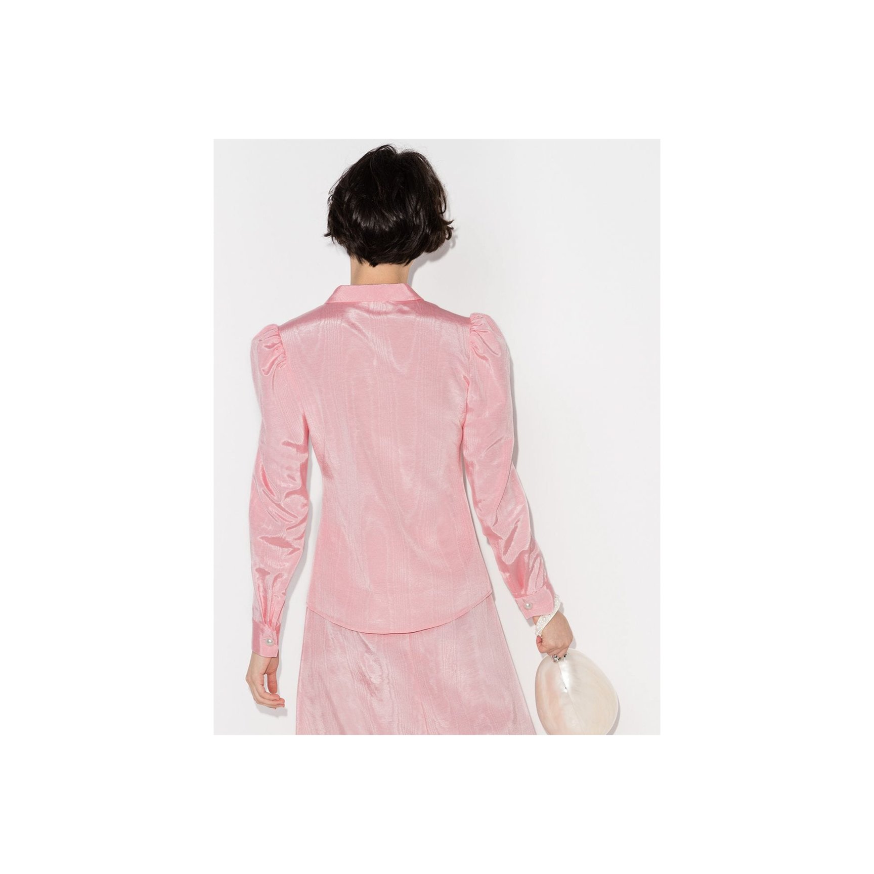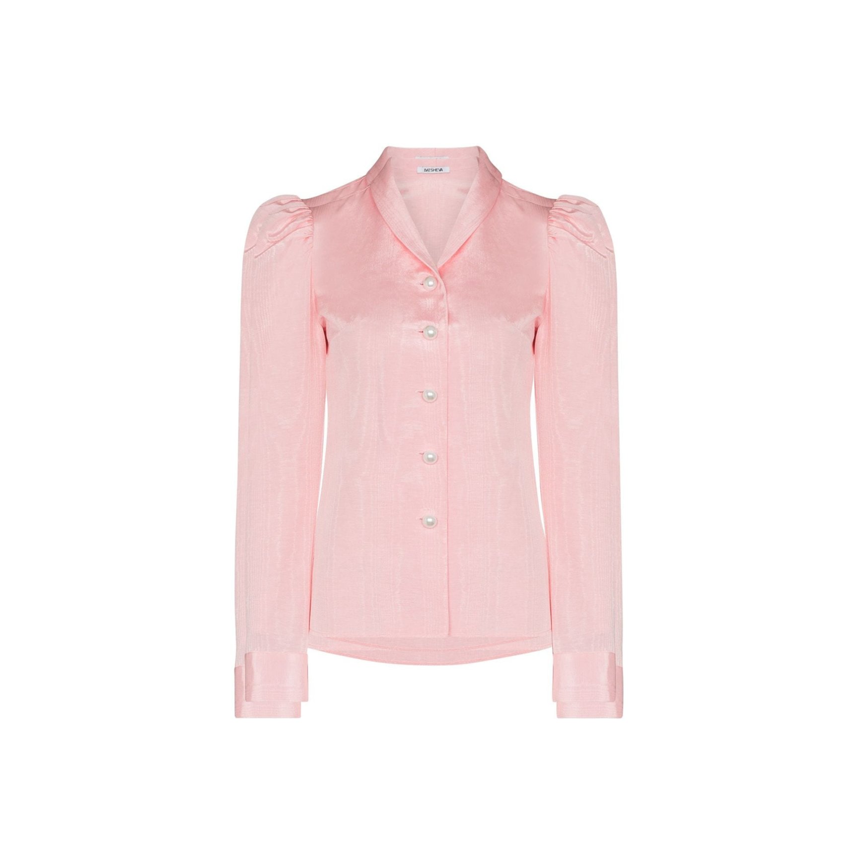 「バットシェバ(Batsheva)」といえば、レトロなプレーリードレス。パフスリーブはまさにシグネチャーのスタイルです。ピンクのモアレ生地の繊細な光沢感がロマンチックな一着。フロントボタンにはパールがあしらわれています。